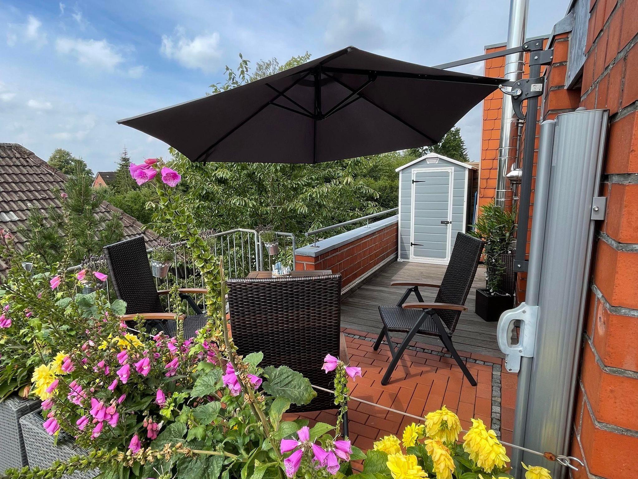 Auf der großen Dachterrasse (2.OG.) finden Sie 2 Tische und 4 gemütliche Hochlehnerstühle.