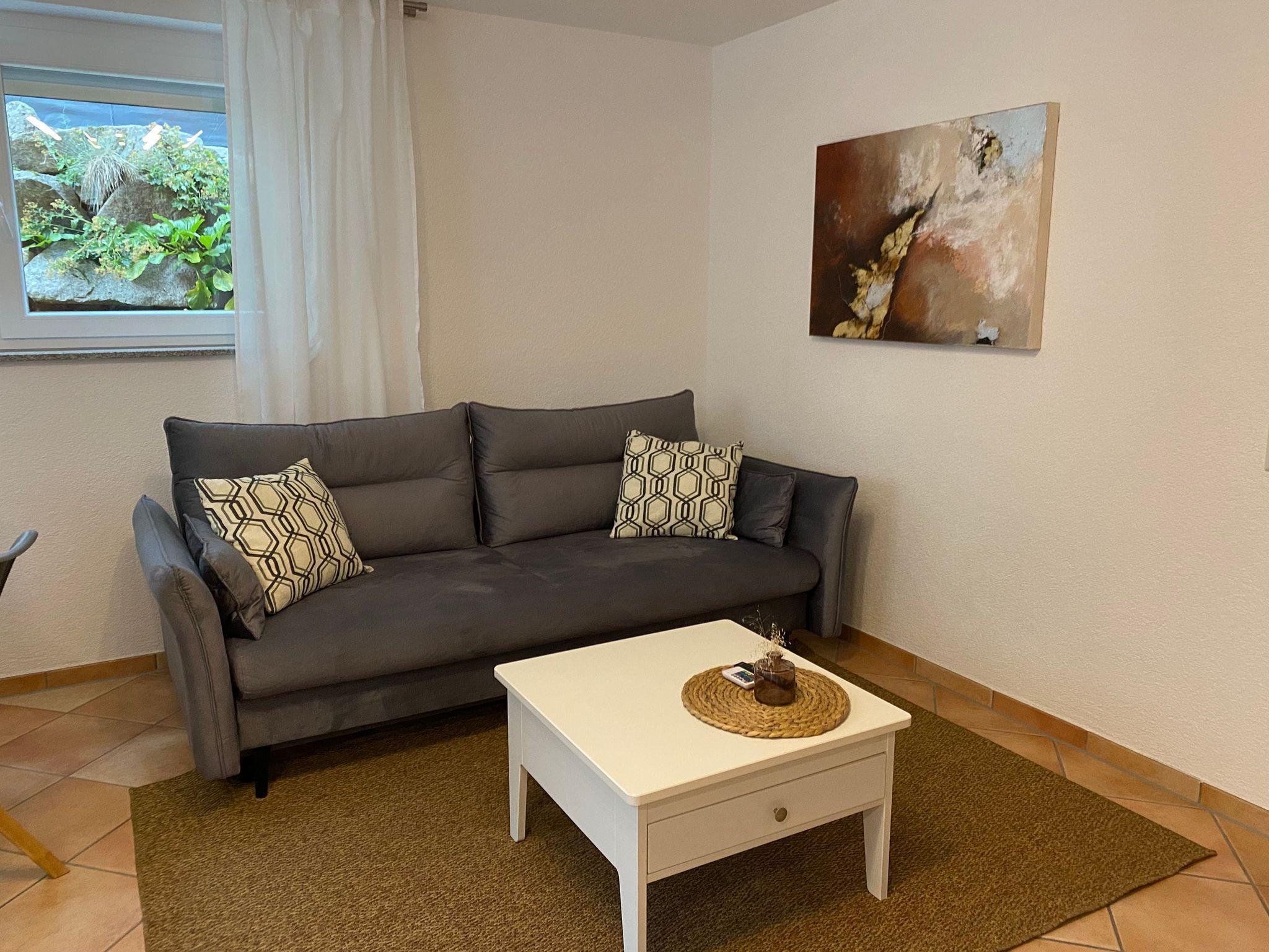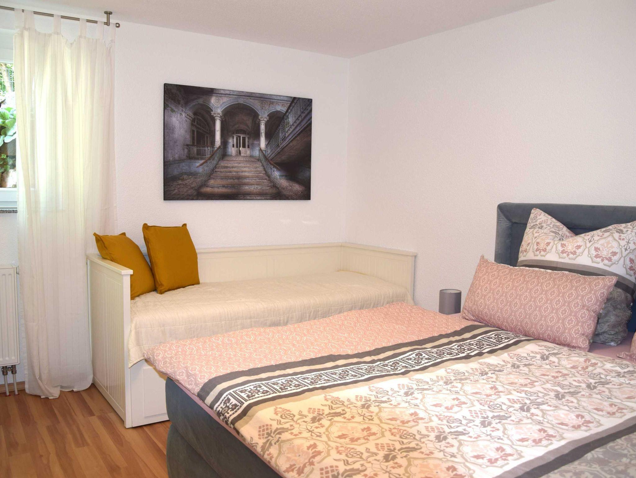 Ferienwohnung mit separatem Eingang in einem Einfamilienhaus, ruhig gelegen, mit Blick ins Grüne. Kostenlos parken direkt vor dem Eingang, überdachter Freisitz, wo sie gemütlich Frühstucken oder den Urlaubstag ausklingen können. Sauna befindet sich im Objekt, jedoch nicht in der Ferienwohnung.