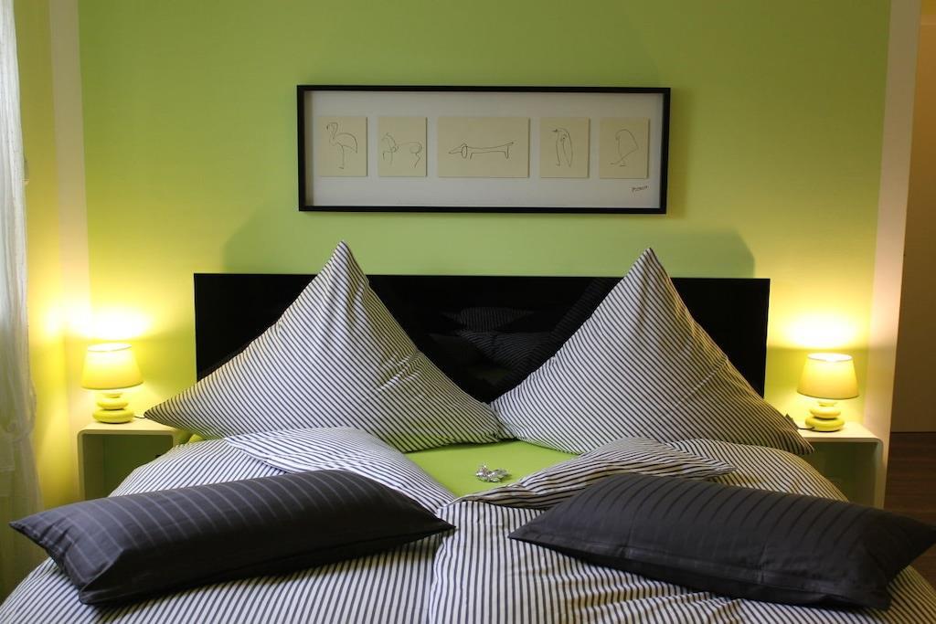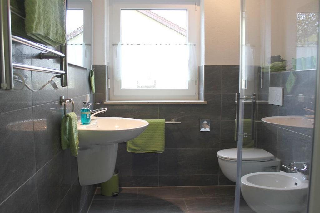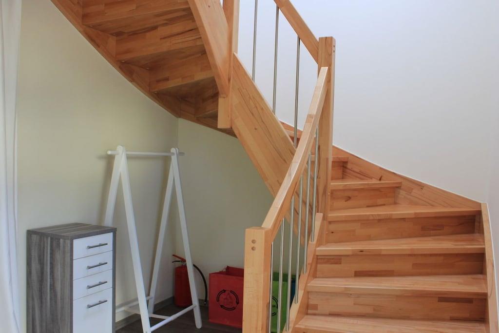 Our holiday apartment is modern, lovingly, and comfortably furnished for your convenience. The large living room with its sofa set in front of the panoramic window will delight you. A fully equipped open kitchen and balcony complete your feel-good space. The holiday apartment extends over two floors. The interior wooden staircase leads to your bedroom and bathroom on the top floor. The bedroom features a modern box-spring double bed and a comfortable daybed for relaxing. The bathroom is exclusively equipped with a walk-in shower, toilet, and bidet. The wellness area in the top floor of Haus Kallenberg, with its infrared cabin, is available for use for an additional charge.