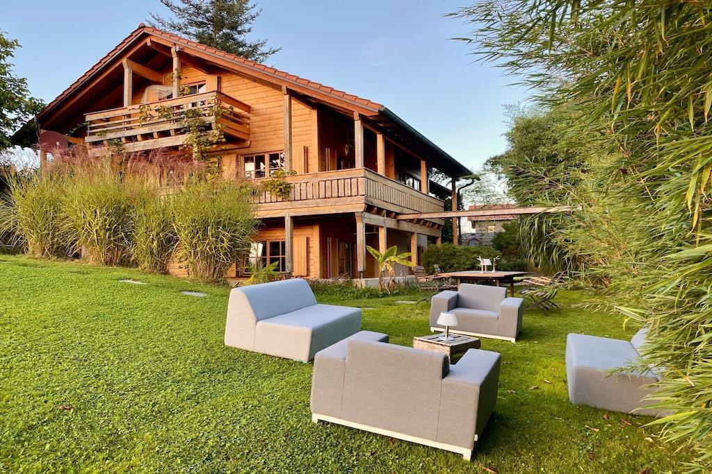 Since April 2014, the Baufritz eco-friendly wooden house has been shining in new splendor. We have refinished the house and the exterior facade with oil, and have also upgraded some of the apartments. The upper apartment, "Traumblick," has a new travertine natural stone bathroom with underfloor heating and a walk-in shower. If you have any questions about the apartments, garden, location, room layout, booking, excursion destinations, etc., please feel free to call me anytime to discuss all the details personally. WhatsApp is also possible. A short video about this apartment can be found on YouTube under "Luxury in Mollenberg." We offer a comfortable apartment near Lindau on Lake Constance in the border triangle. Ideal if you want to relax from your hectic everyday life. Genuine teak garden furniture is available in the garden. You can make yourself comfortable in the evenings at the on-site barbecue and fire pit. The house features a large and bright living room and bedroom with a separate single bedroom. A bright and welcoming kitchen with a refrigerator, oven, stove, and a new dishwasher. And the absolute highlight is the natural stone bathroom. We placed particular emphasis on exclusive materials here. A modern and high-quality bathroom with gold Turkish travertine and Italian marble.