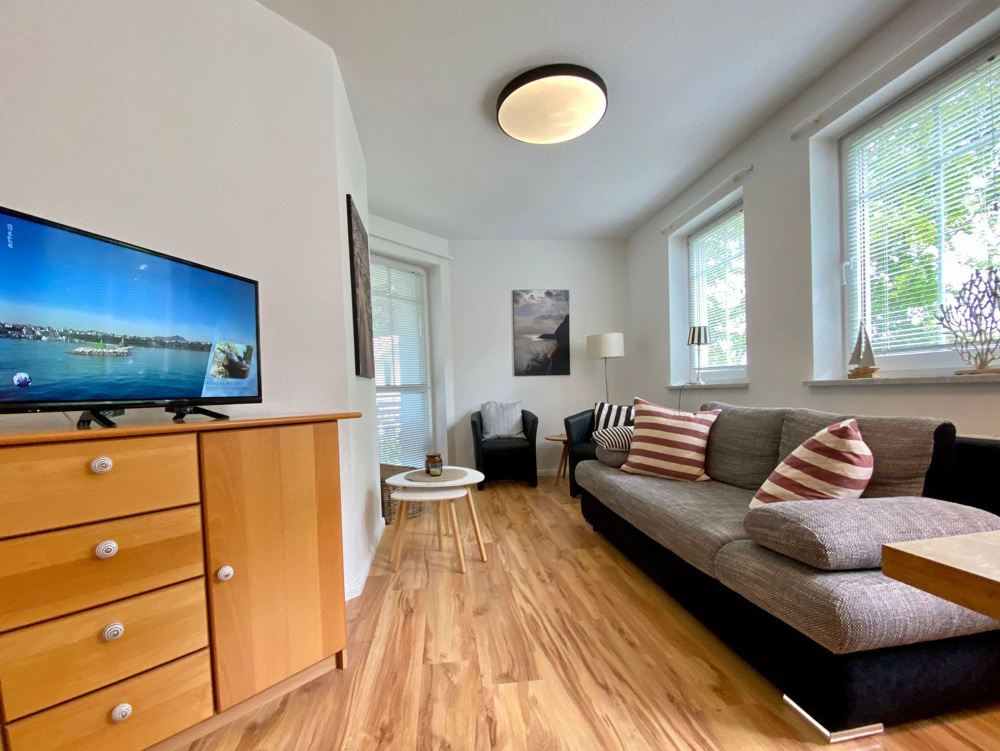 Die gemütliche 2-Zimmer-Ferienwohnung Marlene befindet sich im ersten Obergeschoss der Residenz am Buchenpark und ist bequem über das Treppenhaus erreichbar. Der moderne Wohnraum mit integrierter Küchenzeile lädt zum Entspannen und Genießen ein.