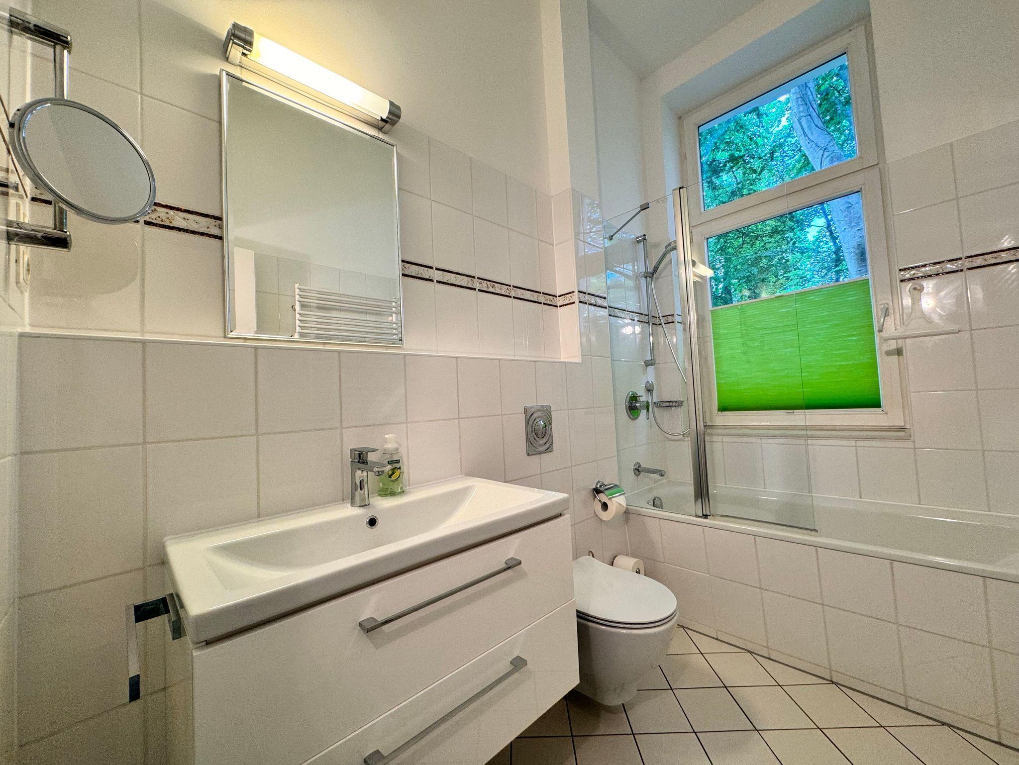Im modernen Badezimmer finden Sie eine Badewanne, WC, Föhn und Kosmetikspiegel - alles für Ihr tägliches Wohlbefinden.