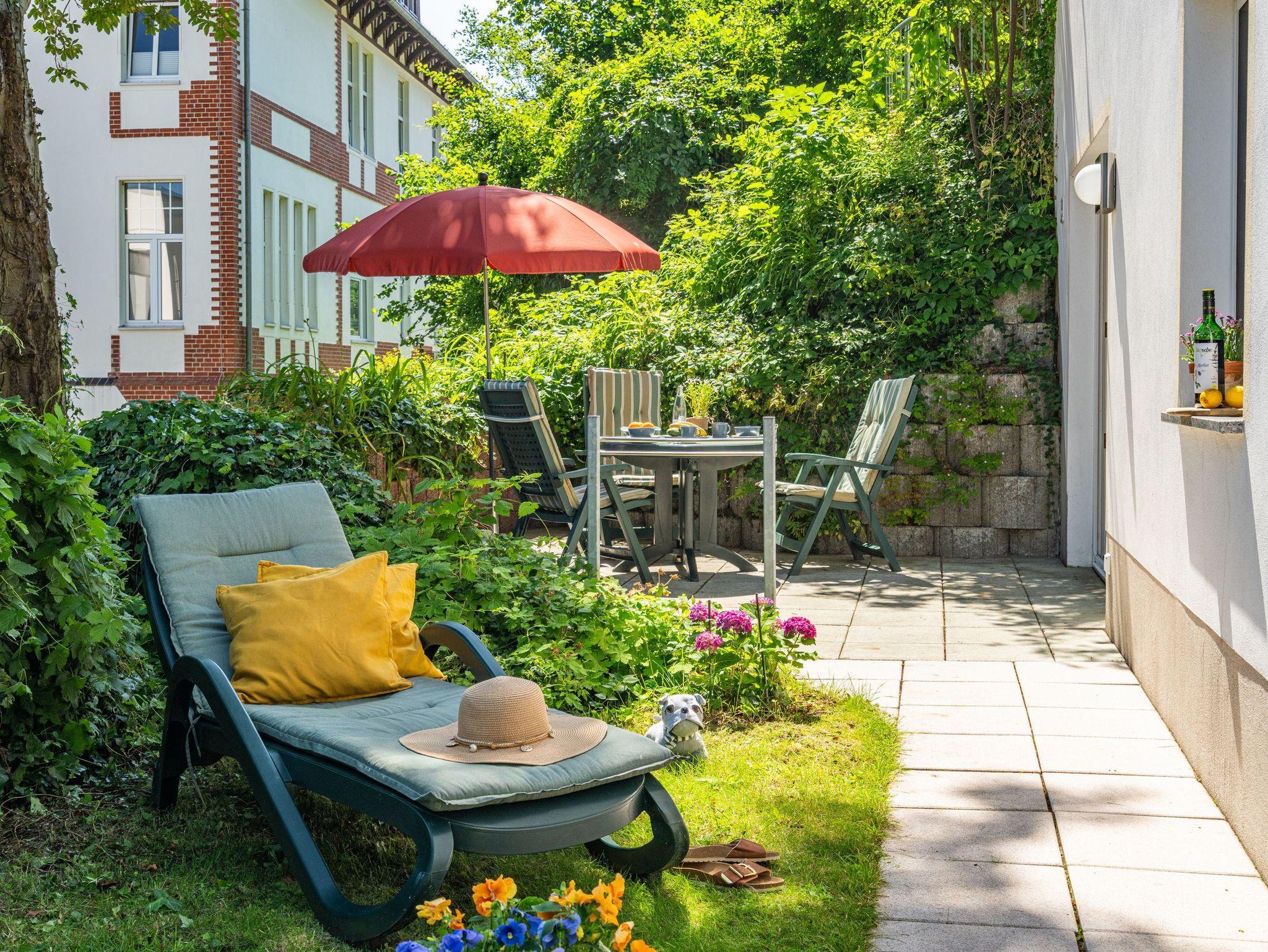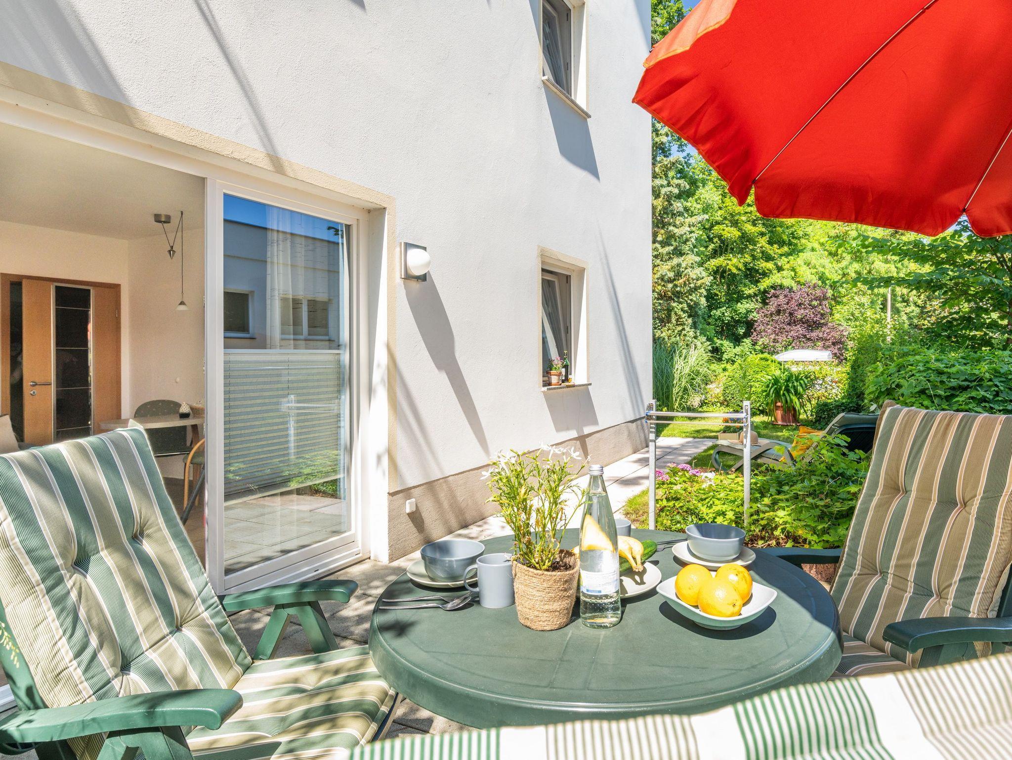 Vom Wohnzimmer erreichen Sie Ihre private Süd-Ost-Terrasse, die zum Sonnenbaden oder zur abendlichen Spielrunde mit Blick in den Garten einlädt. Grill-Liebhaber kommen ebenfalls auf Ihre Kosten, denn auf der Terrasse ist das Grillen im Grünen selbstverständlich gestattet. Das freundlich eingerichtete Schlafzimmer ist mit einem bequemen Doppelbett (180 x 200cm / zwei getrennte Matratzen) und Plissees an den Fenstern zum Abdunkeln ausgestattet.