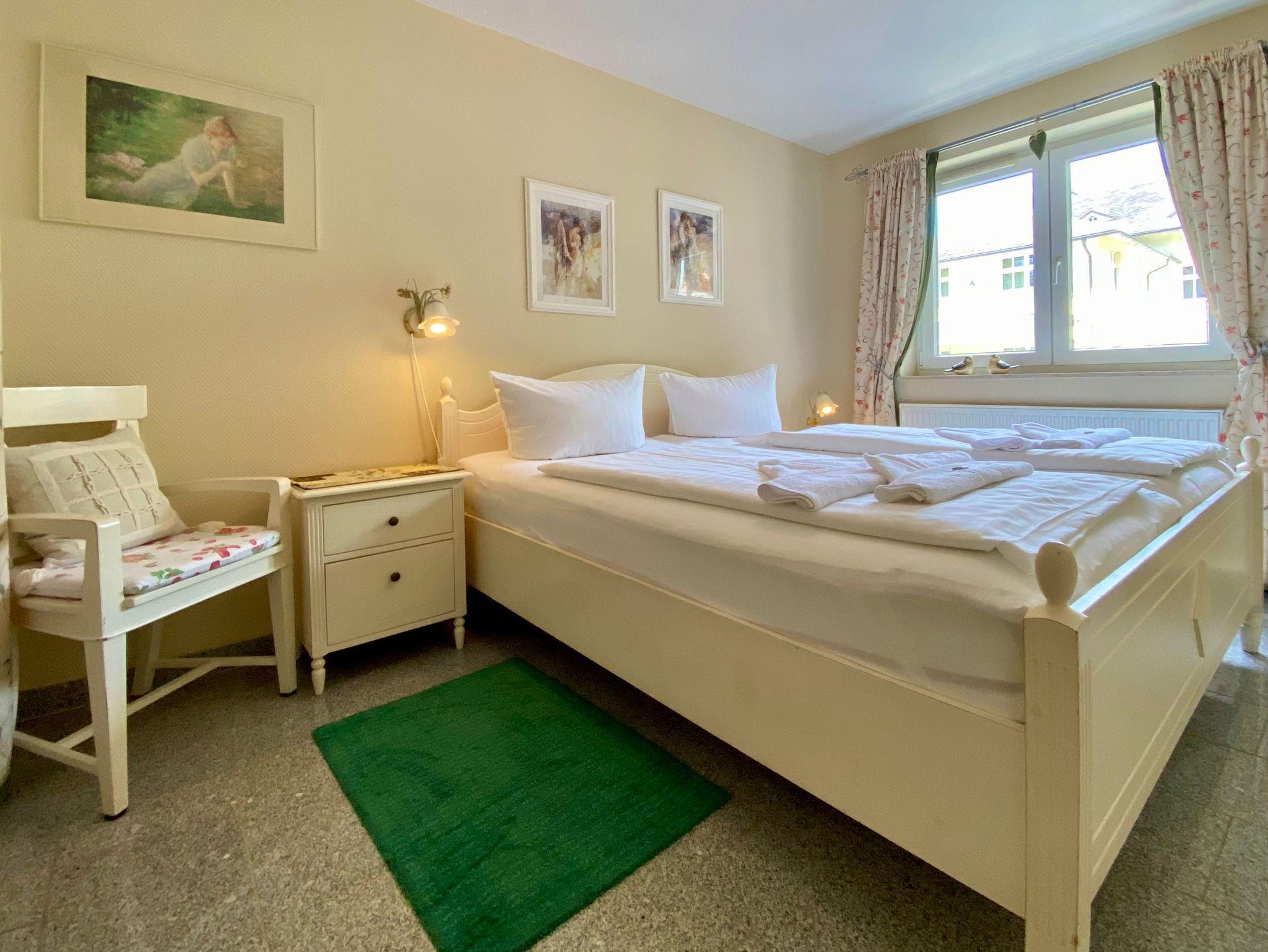Die 3Raum-Ferienwohnung 8 N mit Seeblick liegt im 1 OG und besteht aus einem Wohnzimmer mit integrierter Küchenzeile (Geschirrspüler, Backofen, 4-Platten-Cerankochfeld ) und zwei Schlafzimmern mit Doppelbetten und einem begehbaren Kleiderschrank. Das Badzimmer hat eine Dusche und Waschmaschine. Die gesamte Wohnung ist mit Granit gefliest und hat eine Fußbodenheizung. Die Gemütlichkeit der Wohnung wird durch den hochwertigen Landhausstil der Möbel (Echtholz) erreicht.