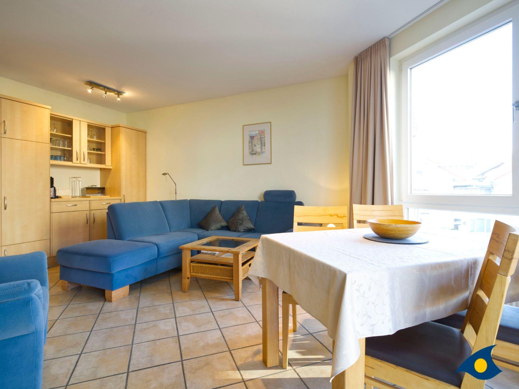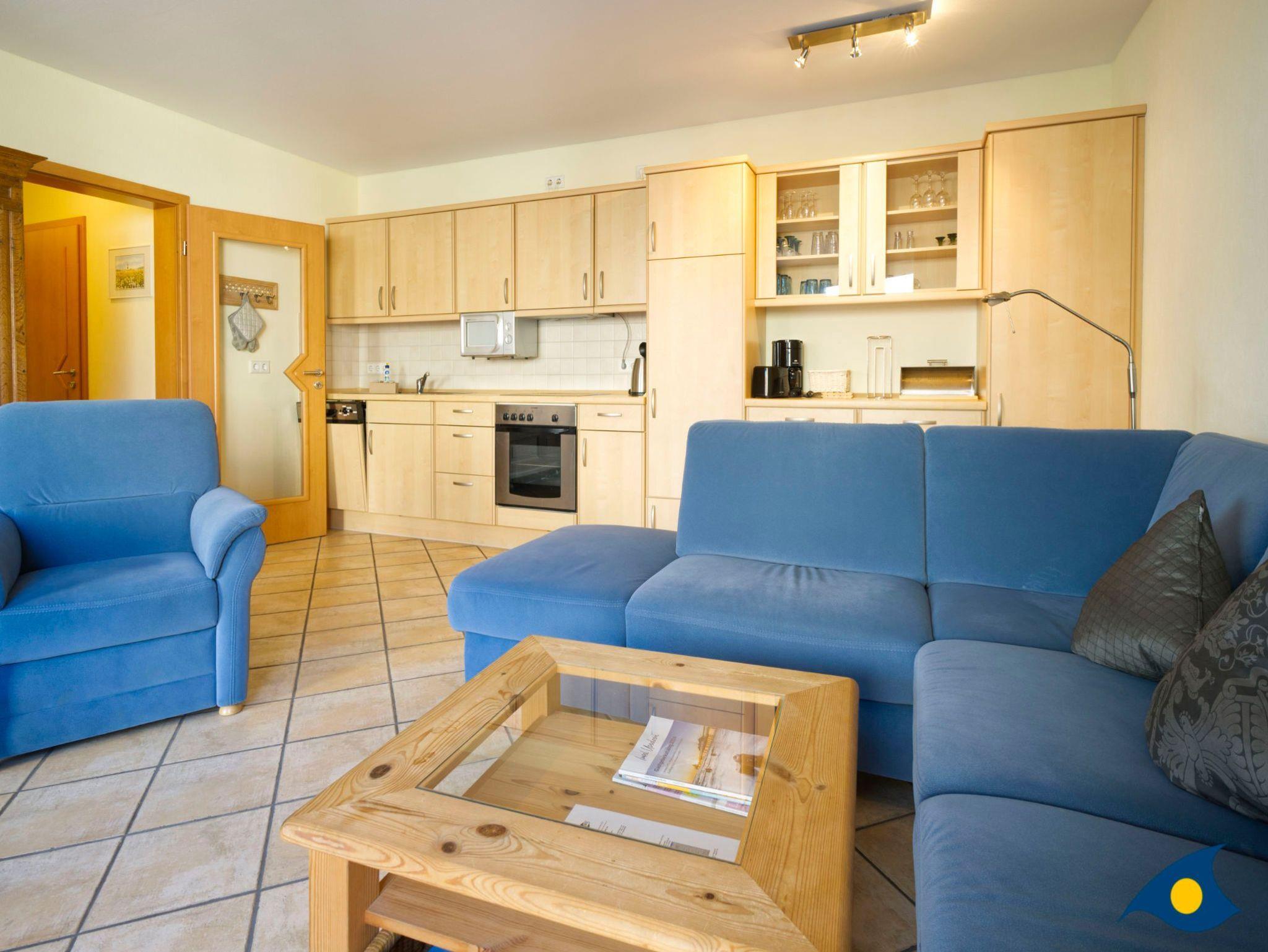 Der großzügige Wohnbereich besticht durch seine geschmackvolle Einrichtung und eine offene, voll ausgestattete Küche, perfekt für kulinarische Erlebnisse. Von hier aus haben Sie direkten Zugang zum großen überdachten Balkon, in Süd-West Ausrichtung. Eine gemütliche große Eckcouch mit Schlaffunktion für die 3. Person, ein komfortable Sessel und ein Flachbild-TV laden zu entspannten Abenden ein. Die Essecke am Fenster bietet ausreichend Platz für gemeinsame Mahlzeiten.