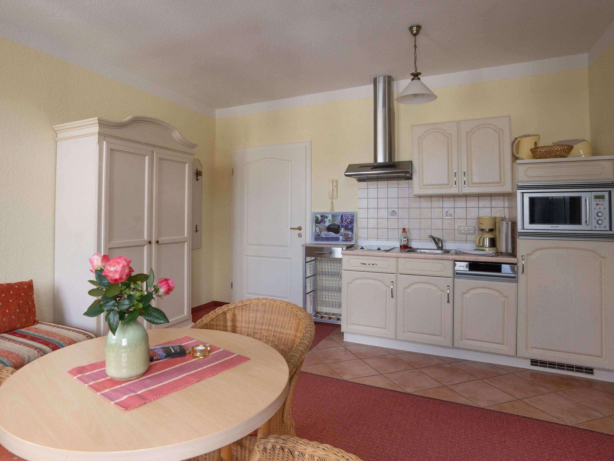 Das 32 qm große Zweiraumappartement im Dachgeschoss verfügt über separates Schlafzimmer und einen Wohnzimmer mit Sitzgelegenheit und Schlafcouch (Aufbettung für 1 Person), TV und Radio und Küchenzeile mit Geschirrspüler,