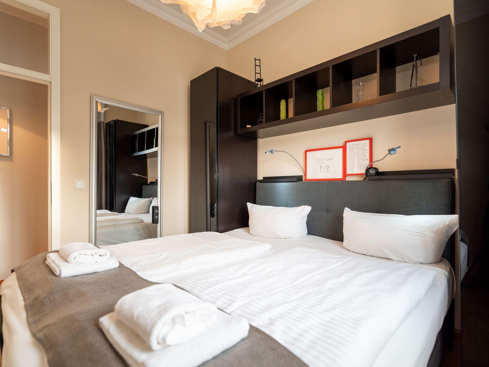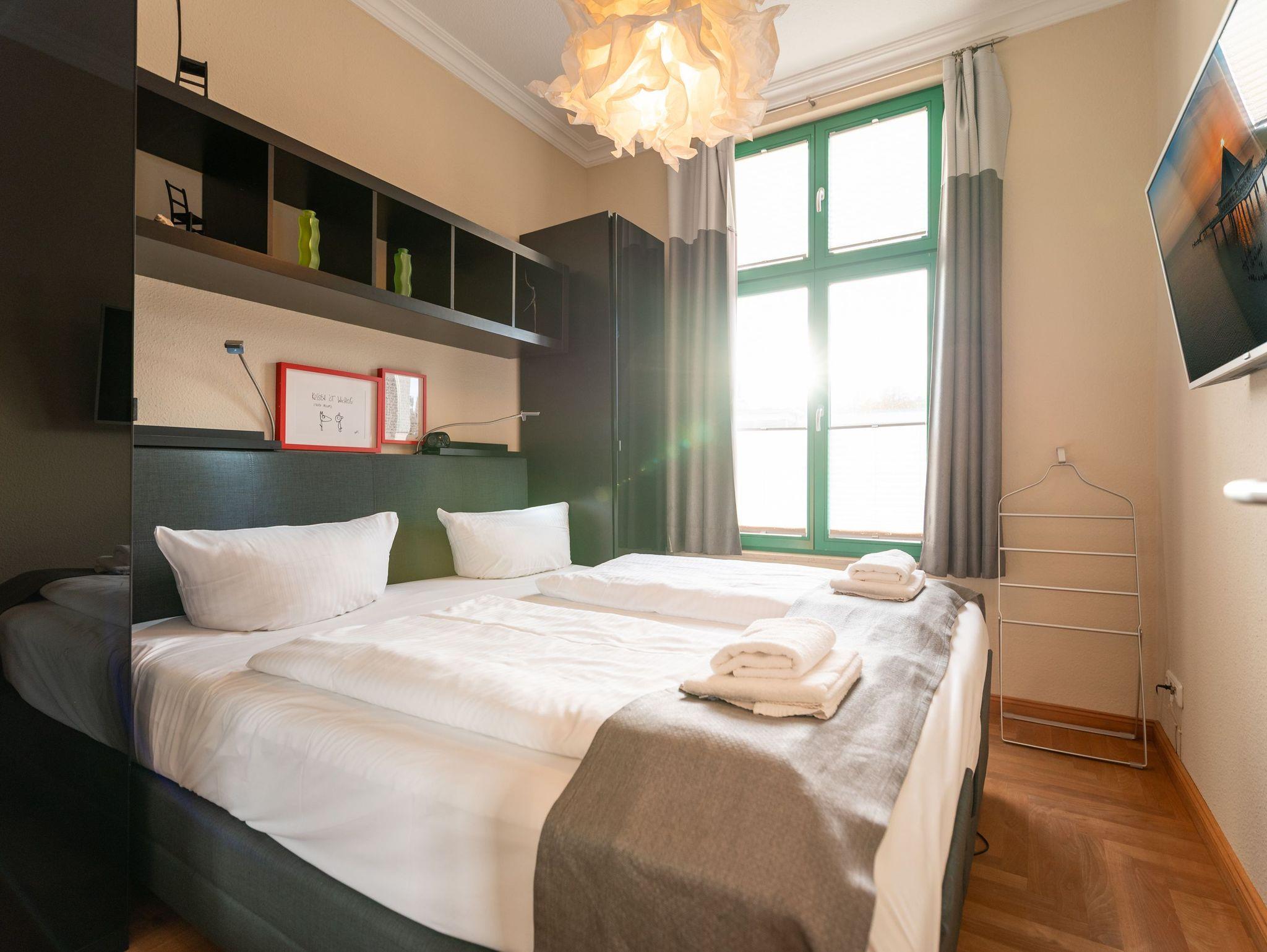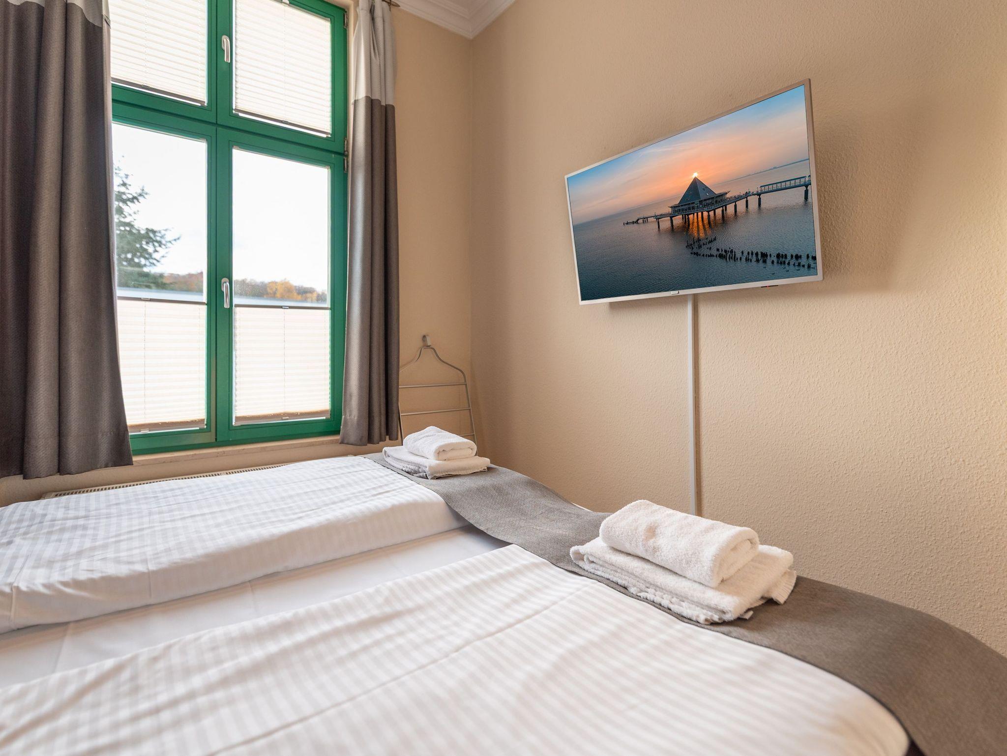 Geruhsame Nächte versprechen die beiden separaten Schlafzimmer: Das größere Zimmer ist mit einem komfortablen Boxspringbett ausgestattet, das von einem praktischen Einbauschrank eingerahmt wird. Im zweiten Schlafzimmer befindet sich ein Doppelbett (ca. 1,40 m Breite) sowie ein weiterer Flachbild-TV ideal, falls sich die Familie beim Fernsehprogramm einmal nicht einig ist.