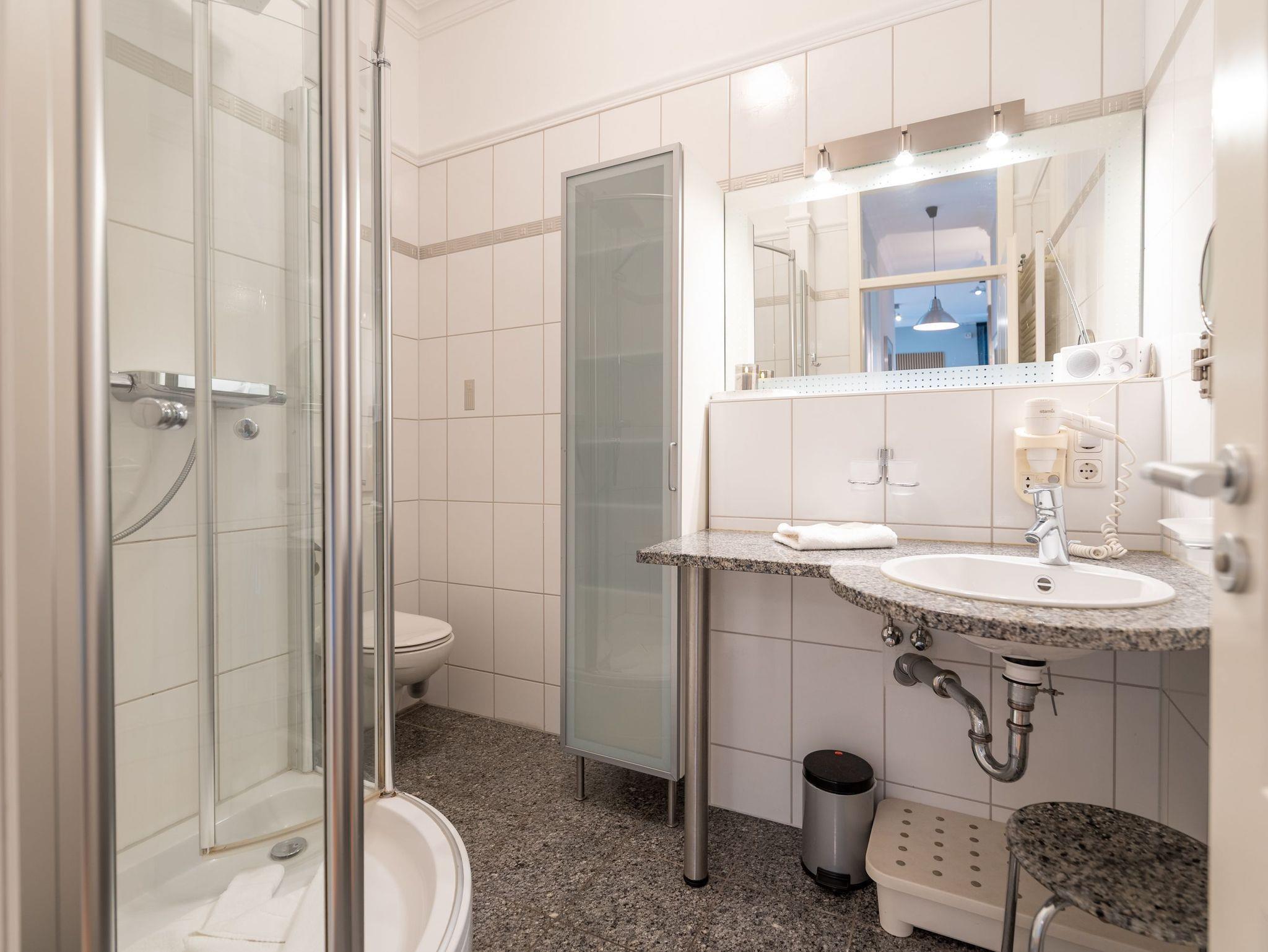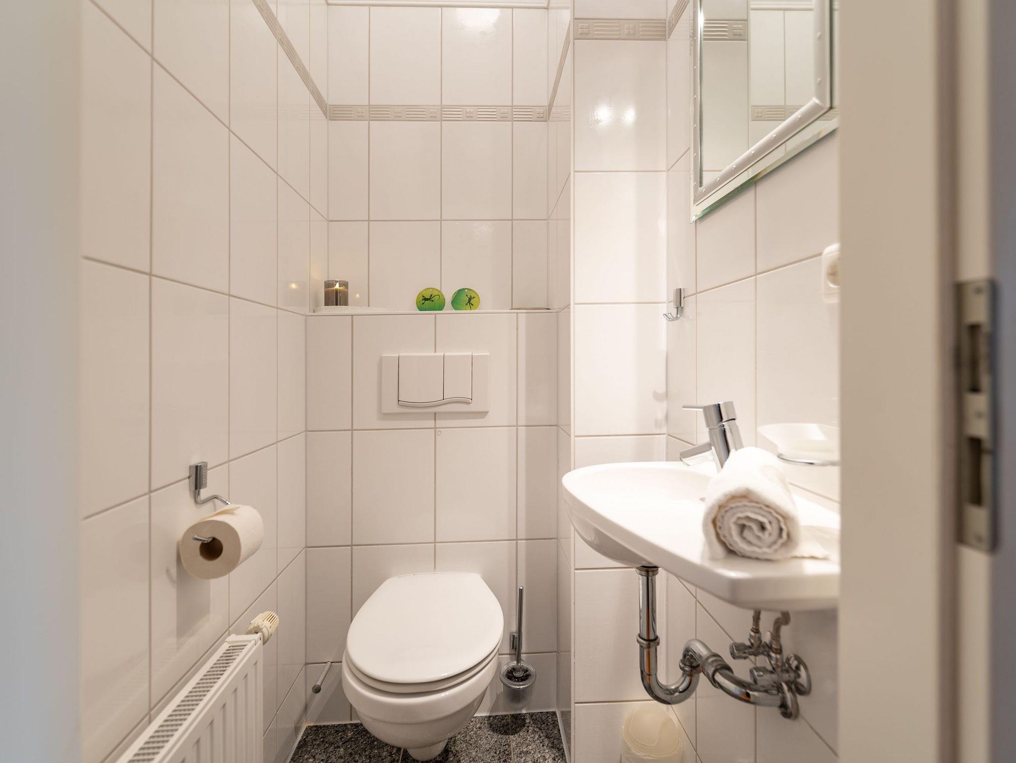 Das moderne Badezimmer bietet eine Dusche, Waschtisch und WC, zusätzlich steht ein separates Gäste-WC zur Verfügung.