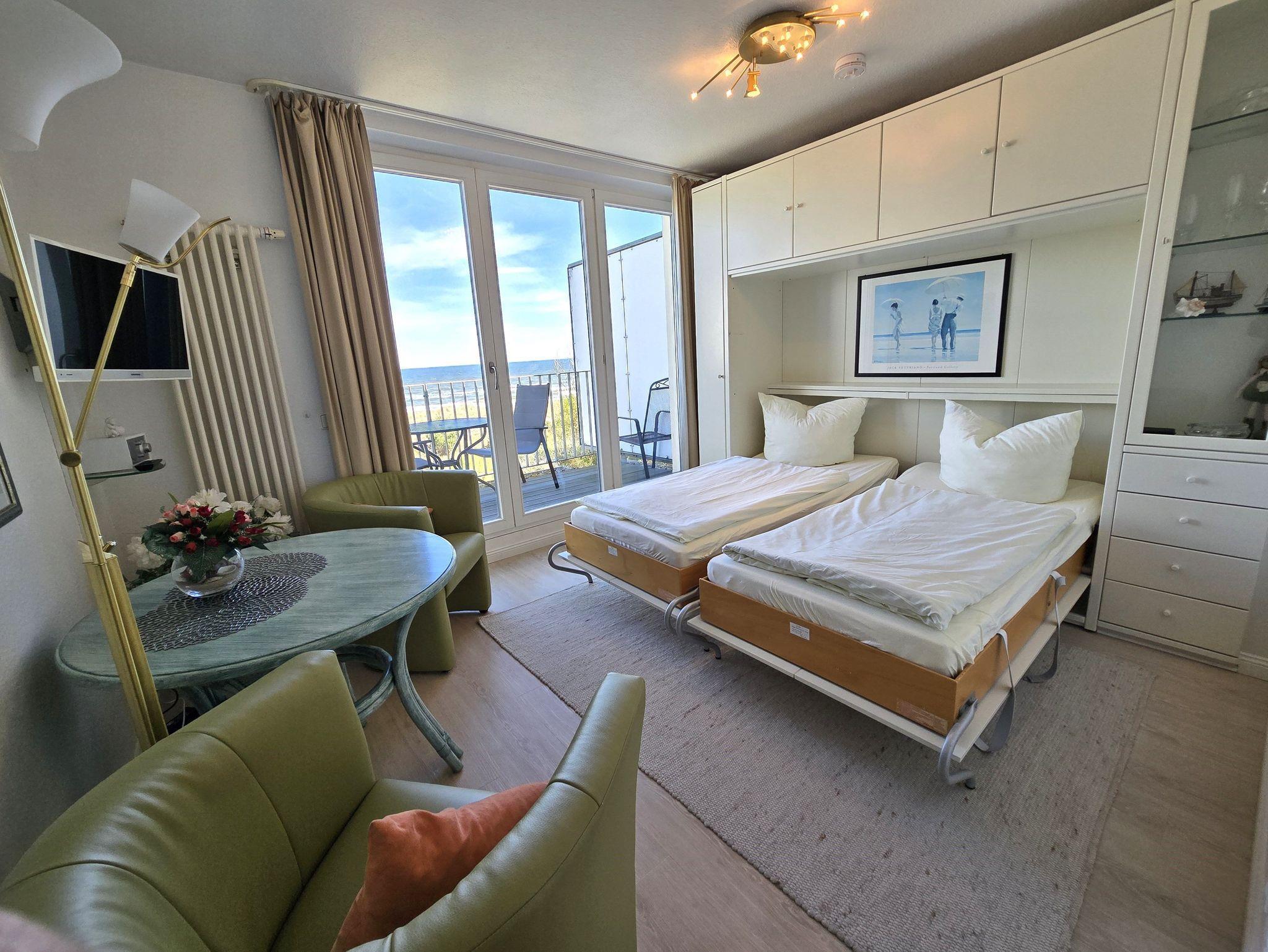 Komfortables, modernes NICHTRAUCHER-Appartement (30 qm) in der 3. Etage mit Balkon und einem herrlichen Meerblick. Ein kombinierter Wohn-u. Schlafraum, einer Küchenzeile (mit Geschirrspüler, Mikrowelle, E-Herd, Kühlschrank, Kaffeemaschine etc.), W-Lan, Kabel-TV, Radio, Safe sowie ein Bad mit DU/WC + Haarfön. Parkplatz. Die Erstausstattung Bettwäsche und Handtücher ist inklusive.