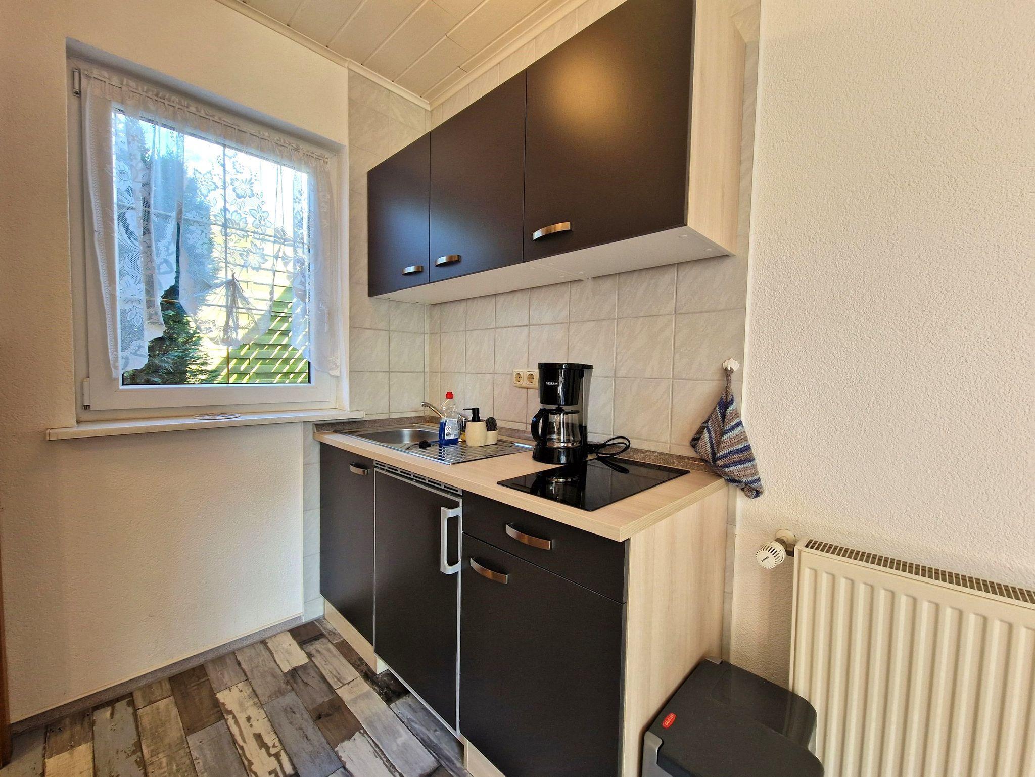 Im unteren Bereich erwartet Sie ein modernes Bad mit Dusche und WC sowie eine offene Küchenzeile, die alles bereithält, was Sie für einen sorgenfreien Ostseeurlaub benötigen. Hier finden Sie auch eine gemütliche Sitzecke, in der Sie nach einem schönen Tag entspannen können. Eine Mikrowelle steht Ihnen gegen Kaution zur Verfügung.