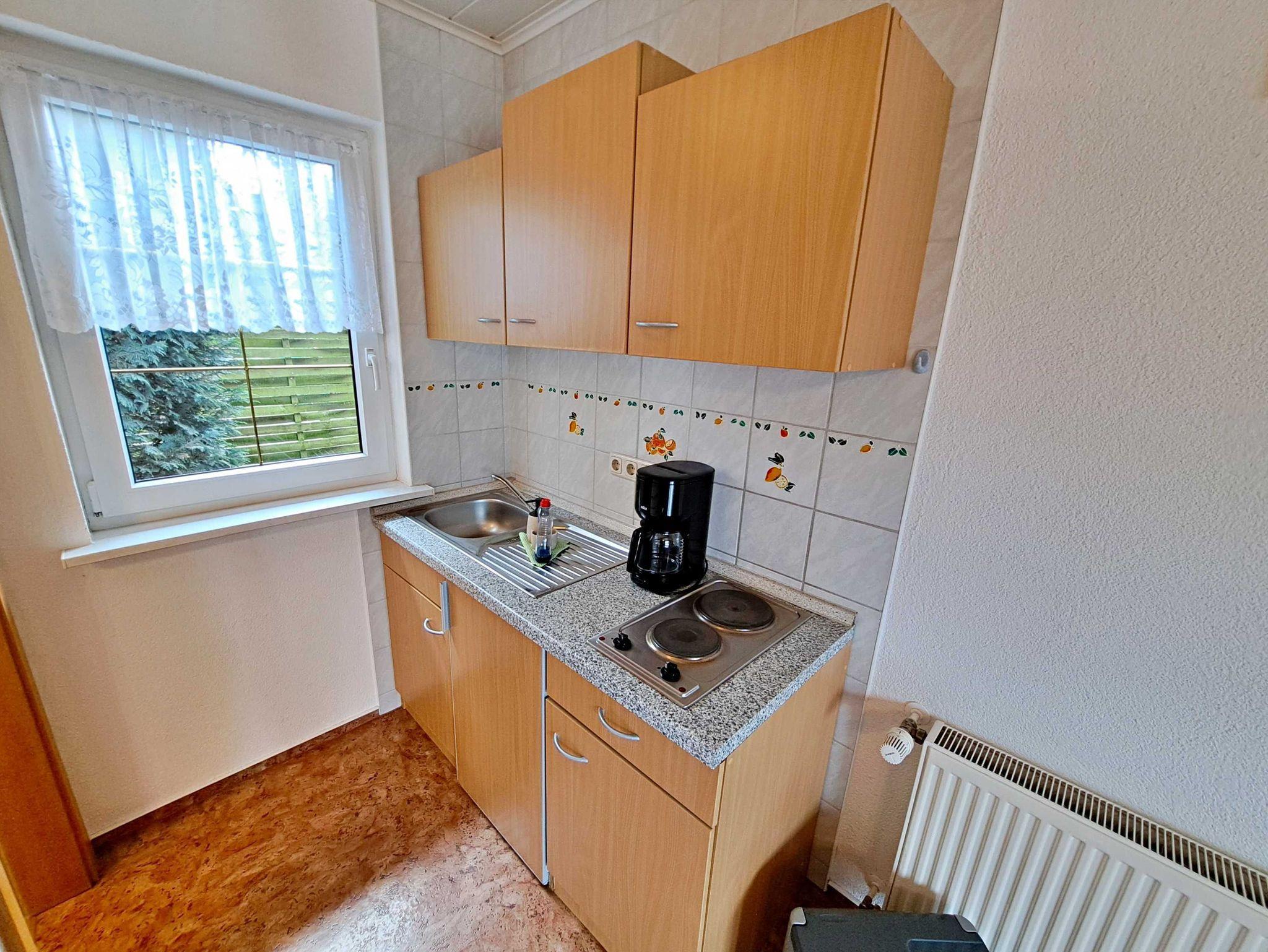 Über eine Treppe gelangen Sie ins 1. Obergeschoss, wo ein einladendes Wohnzimmer mit einer bequemen Couch, die auch als Schlafgelegenheit für zwei weitere Personen dient, auf Sie wartet. Außerdem gibt es ein separates Schlafzimmer mit einem komfortablen Doppelbett und Kleiderschrank. Genießen Sie die frische Luft auf der möblierten Terrasse direkt am Eingang, die perfekt ist um bei schönem Wetter Ihr Frühstück zu genießen oder den Abend mit einem Glas Wein ausklingen zu lassen. Ein Pkw-Stellplatz direkt am Haus sowie kostenfreies W-LAN stehen Ihnen ebenfalls zur Verfügung. Falls Sie gerne grillen möchten, können Sie auf Anfrage eine Grillmöglichkeit direkt beim Vermieter ausleihen. Zudem besteht die Möglichkeit gegen eine Kaution von 50 € eine Mikrowelle zur Verfügung gestellt zu bekommen.
