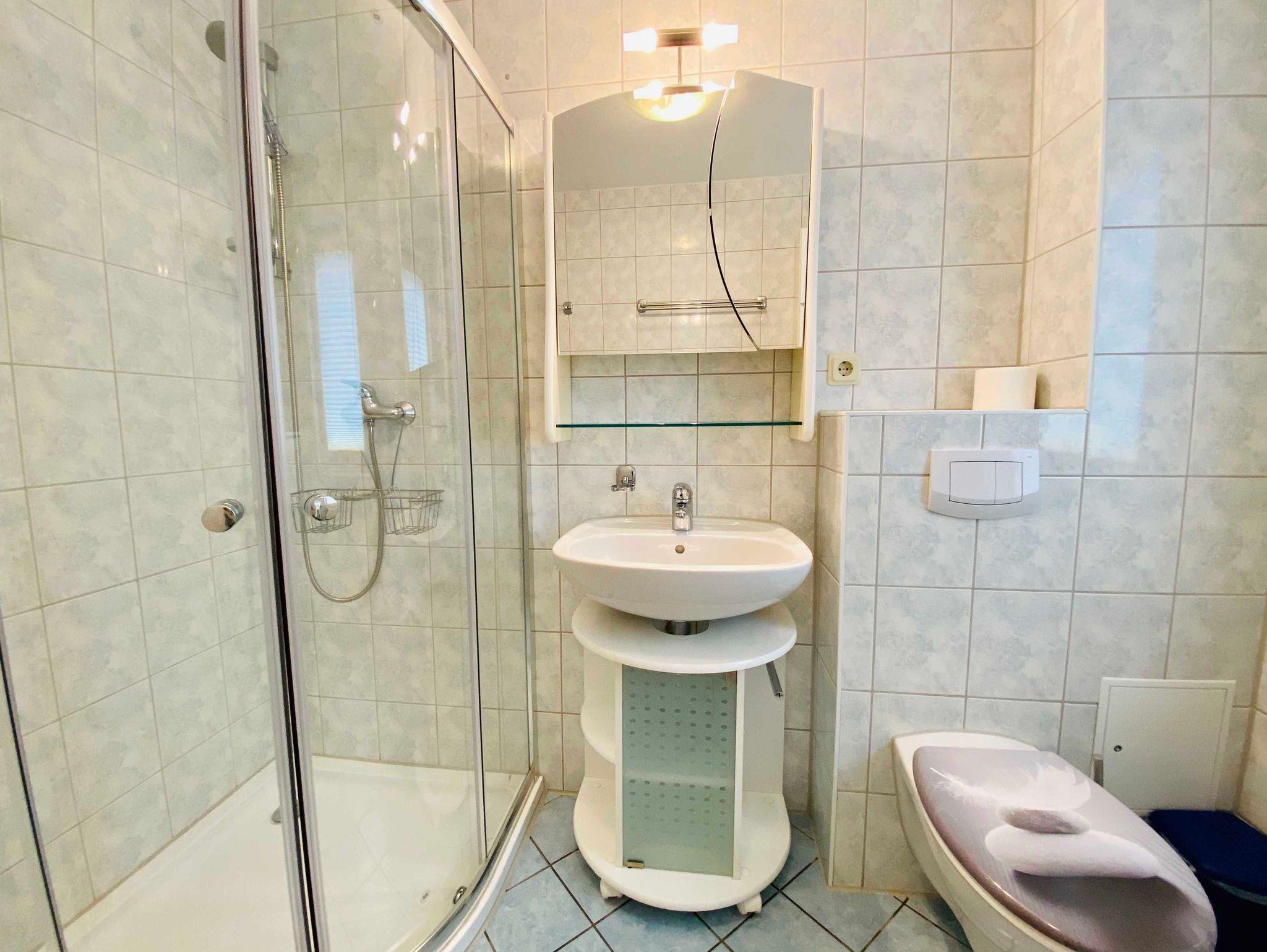 Das Schlafzimmer verfügt über ein Doppelbett mit 140er Breite und ist im Gegensatz zum übrigen Teil der Ferienwohnung nicht mit Laminat, sondern mit Echtholzparkett ausgelegt. Das Badezimmer mit Dusche hat ein Fenster. Zur Wohnung gehört ein kostenfreier Stellplatz und W-LAN