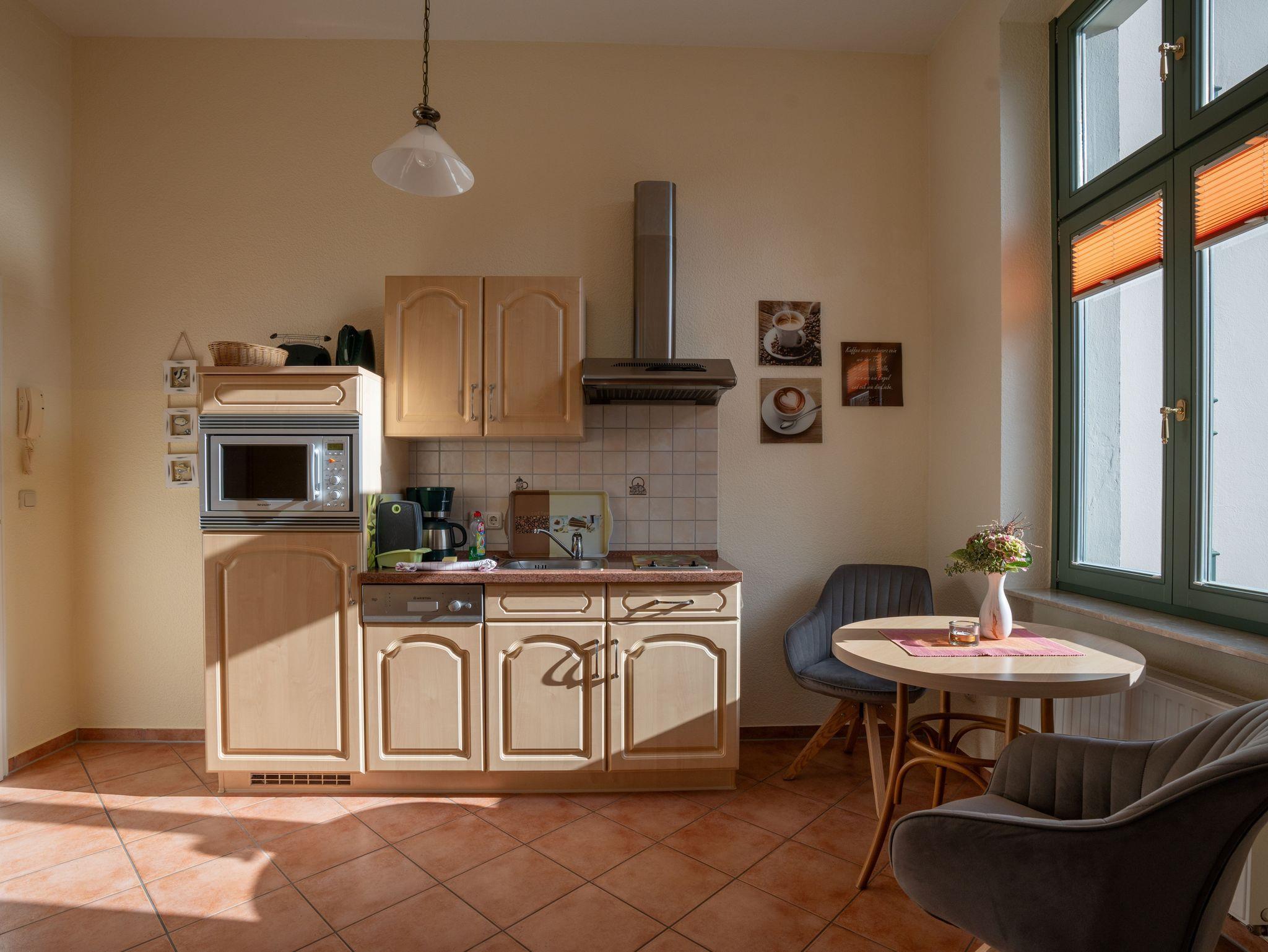 Das 31 qm große Einraumappartement im Obergeschoss verfügt über ein Doppelbett, Sitzgelegenheit, TV und Radio sowie eine Küchenzeile mit Geschirrspüler,