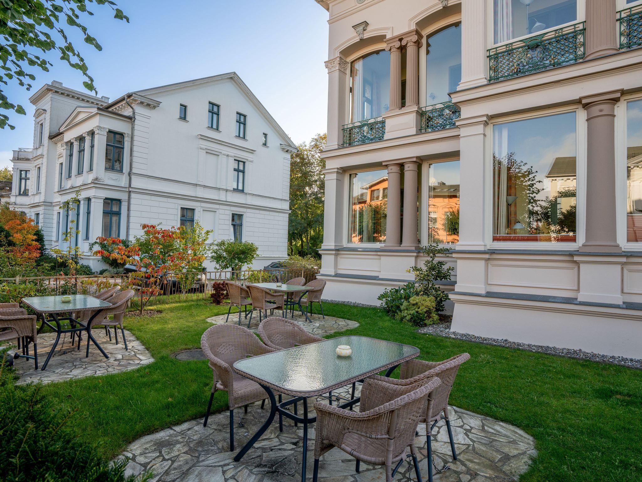 Auf der Terrasse vor dem Haus (Gemeinschaftsnutzung) haben Sie einen herrlichen Blick auf die alten Villen im Stil der Bäderarchitektur.