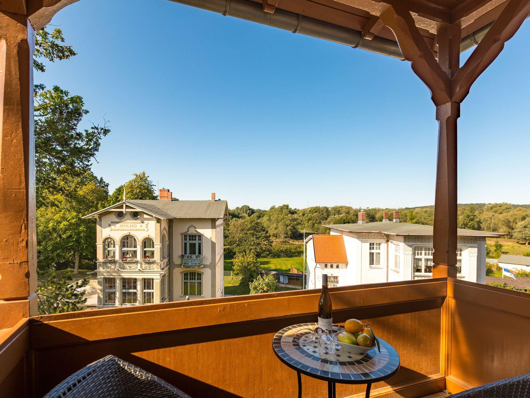 Die helle, freundliche Ferienwohnung im 2. Obergeschoss der Villa ist 50 qm groß und bietet zwei Personen und einem Kleinkind Platz zum Wohlfühlen. Die moderne, geschmackvolle Einrichtung lässt keine Wünsche offen. Das Appartement verfügt über ein Wohnzimmer mit Balkon der zur Südseite ausgerichtet ist und vom Nachmittag bis Abend viel Sonne spendet. Das Schlafzimmer mit Doppelbett und zusätzlichem Fernseher bietet erholsame Nächte. Auf Wunsch stellen wir für unsere kleinen Gäste ein Kinderreisebett (ohne Bettzeug) und einen Kinderhochstuhl kostenfrei zur Verfügung. Für Ihren Komfort sind die Betten bei der Anreise bezogen und Handtücher liegen bereit. Eine vollständig ausgestattete Küchenzeile mit Essbereich und ein großzügiges Duschbad komplettieren dieses Wohlfühlappartement. Für Ihre Fahrräder finden Sie auf dem Gelände einen separaten Abstellraum.