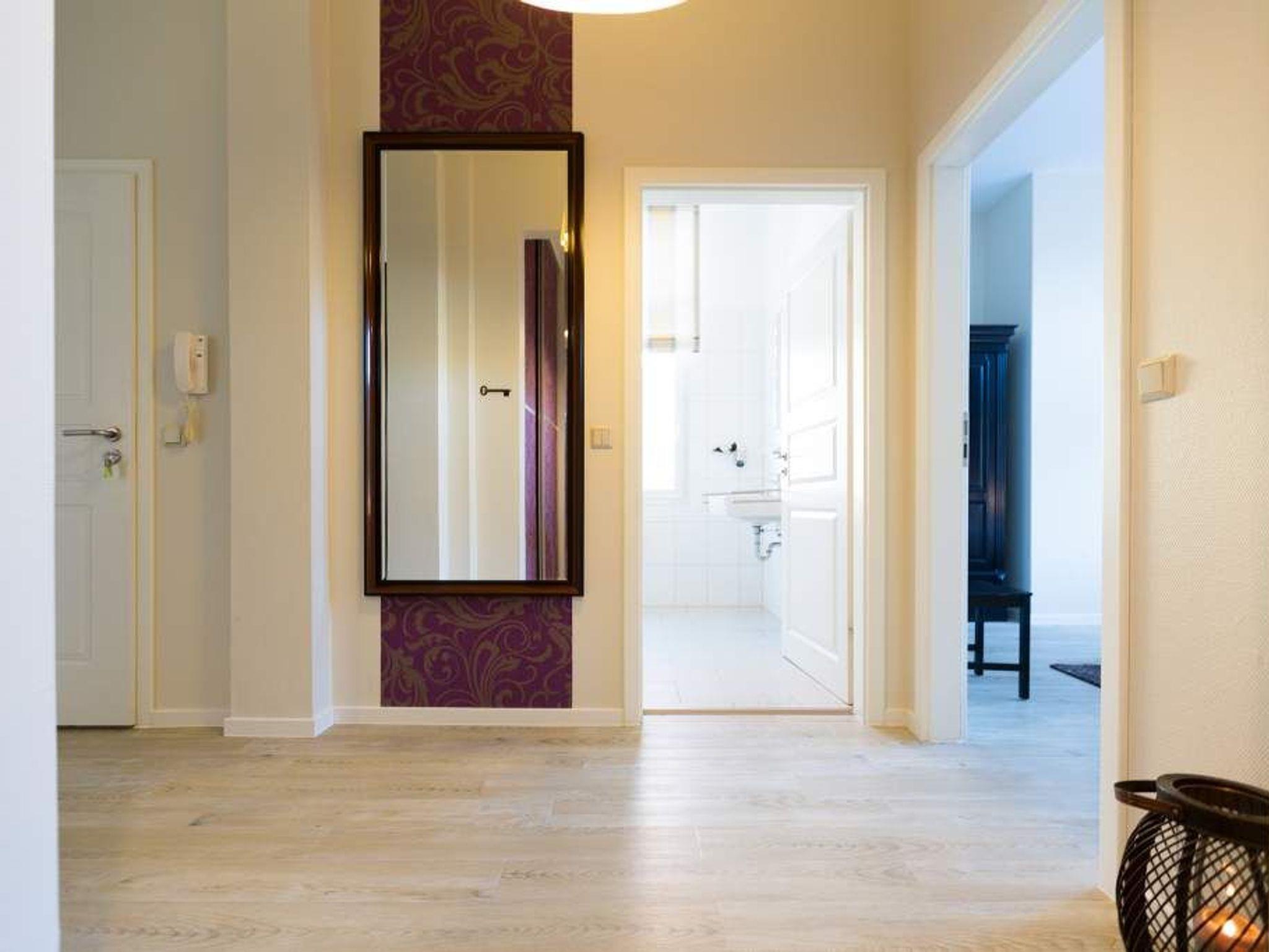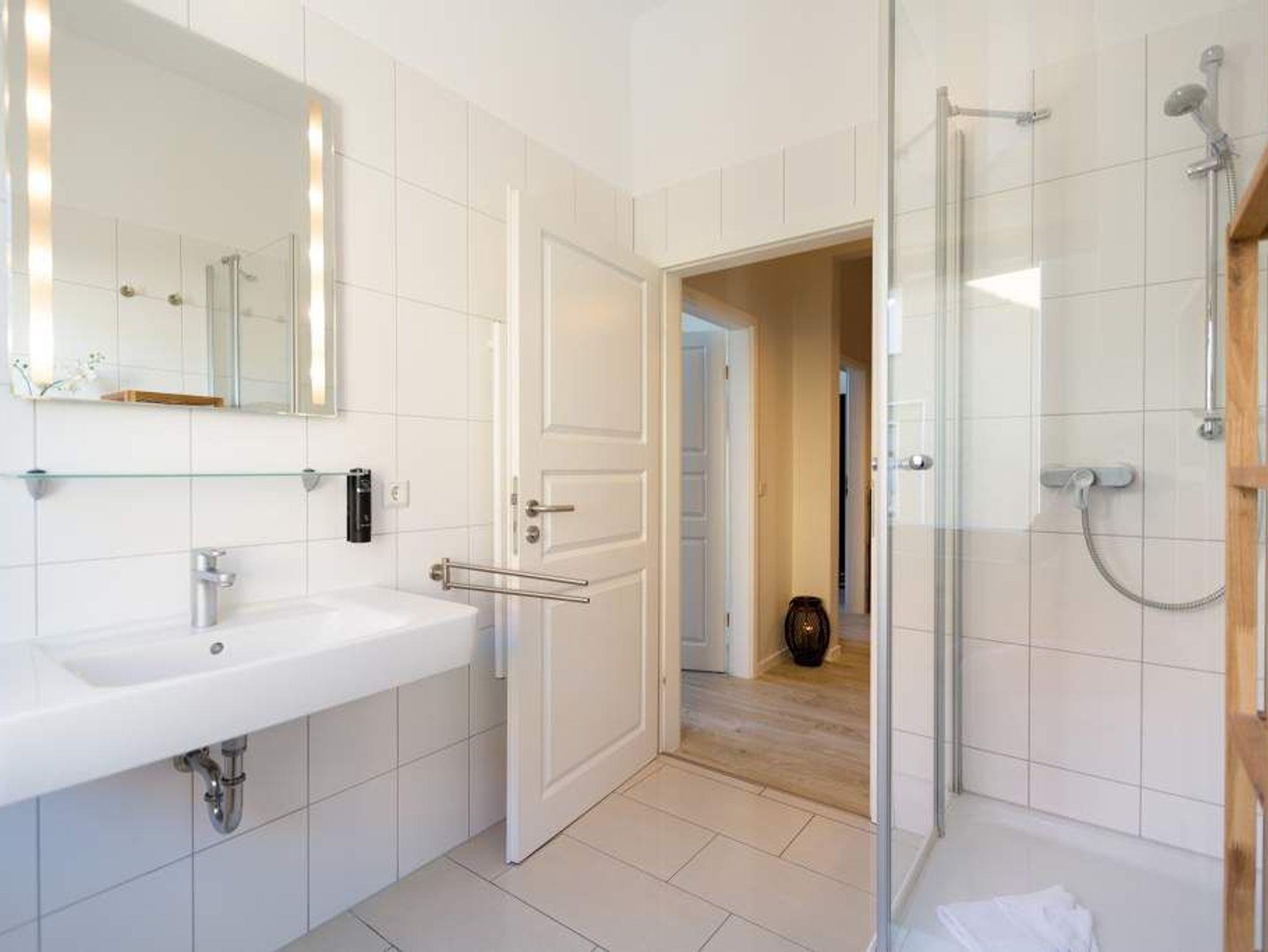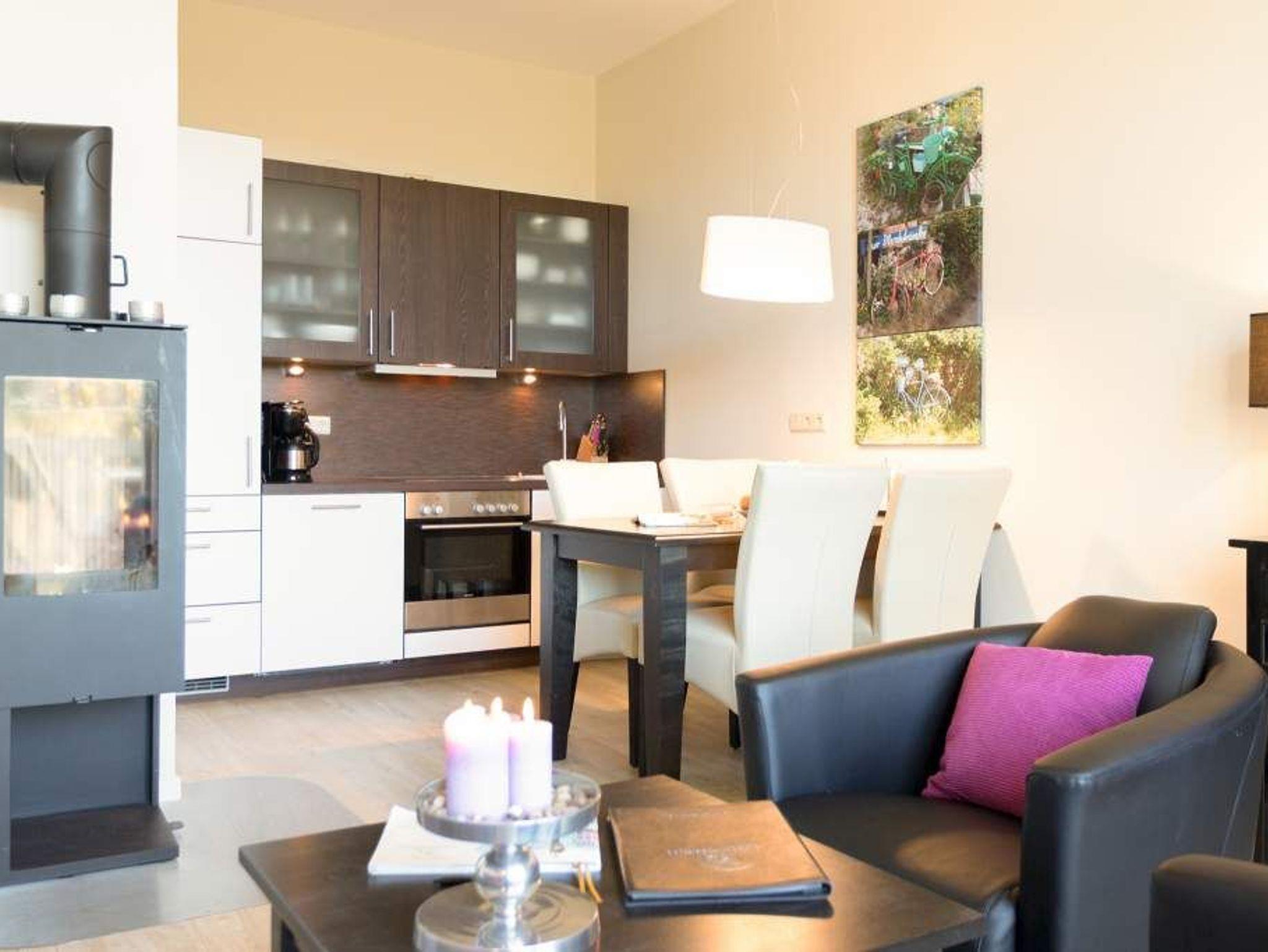 Stylische Farben und ein moderner Look versprühen sofort das passende Urlaubsfeeling. Die schöne 3-Raum-Ferienwohnung (75 qm) befindet sich im 1. Obergeschoss des Hauses und bietet Platz für 4 Erwachsene und ein Kleinkind bis 3 Jahre. An den Wohnbereich mit bequemer Sitzgruppe und schönen Kaminofen schließt sich die offene Küche mit Essplatz an. Auf dem Südbalkon lässt es sich besonders gut relaxen und man genießt den Blick ins Grüne. Die beiden Schlafzimmer mit Doppelbetten und TV, ein Bad mit Dusche und WC und ein Gäste-WC ergänzen die Wohnung. Für die Wohnung steht ein PKW-Stellplatz zur Verfügung. Ein WLAN-Netz im Haus kann kostenfrei genutzt werden. Auf Wunsch stellen wir für unsere kleinen Gäste ein Kinderreisebett (ohne zusätzliche Matratze [&] Bettzeug) und einen Kinderhochstuhl ( gegen einen Aufpreis) zur Verfügung. Für Ihren Komfort sind die Betten bei der Anreise bezogen und Handtücher liegen bereit (Erstausstattung). Für den Tag am Meer steht Ihnen als besonderes Bonbon von Mitte Mai bis Ende September (je nach Witterung) ein Strandkorb am Strand kostenlos zur Verfügung.