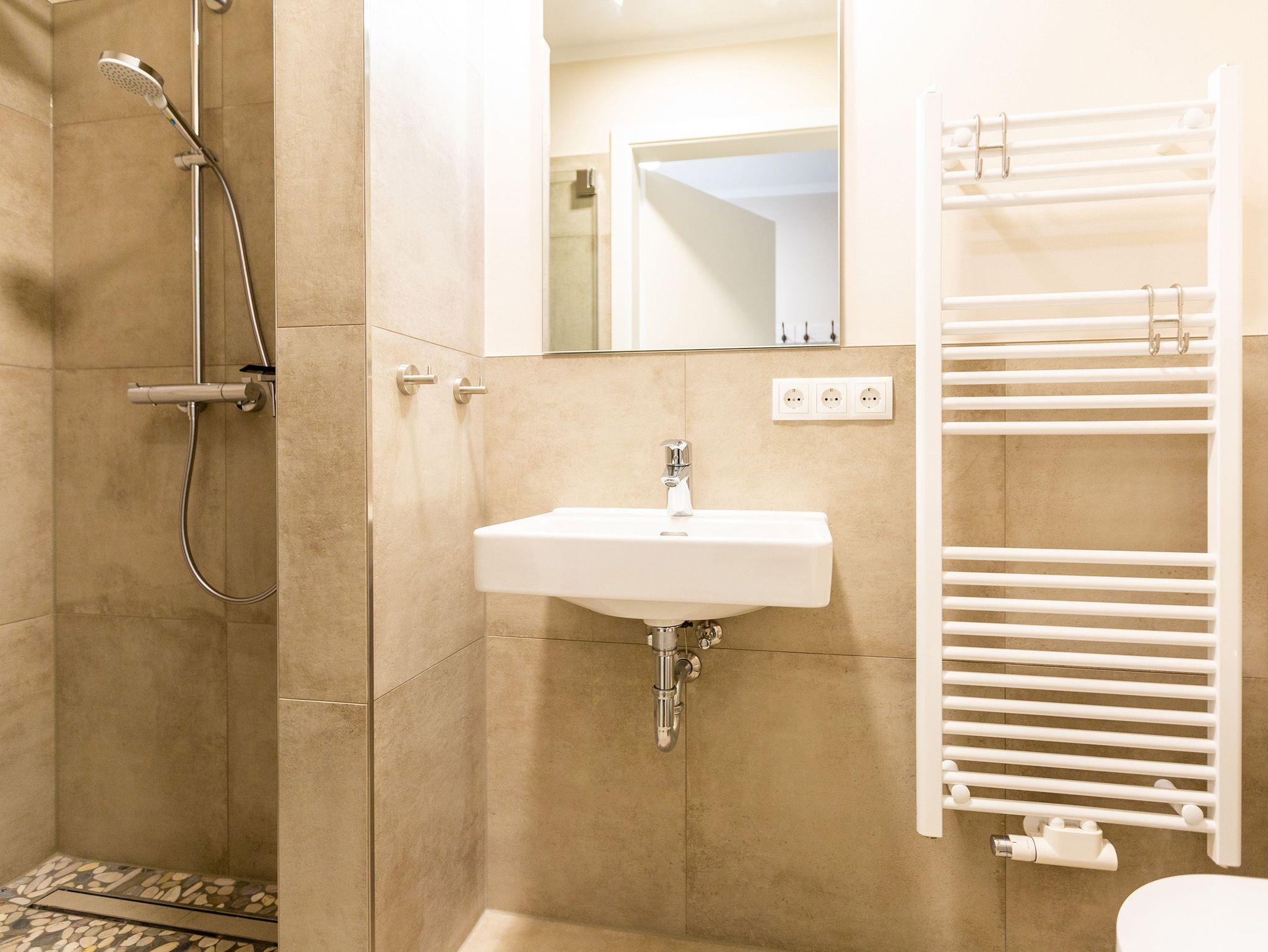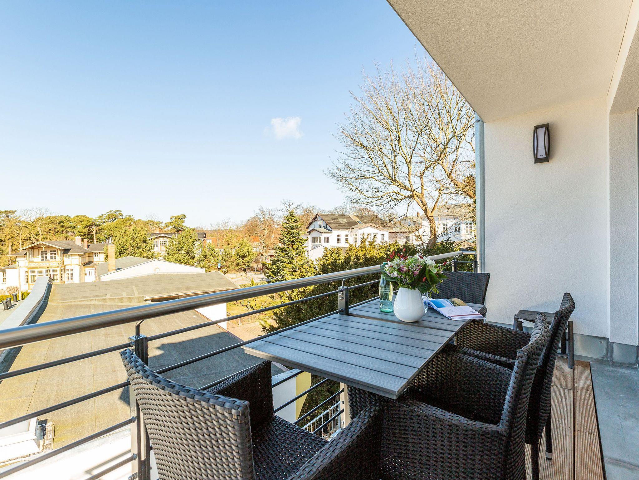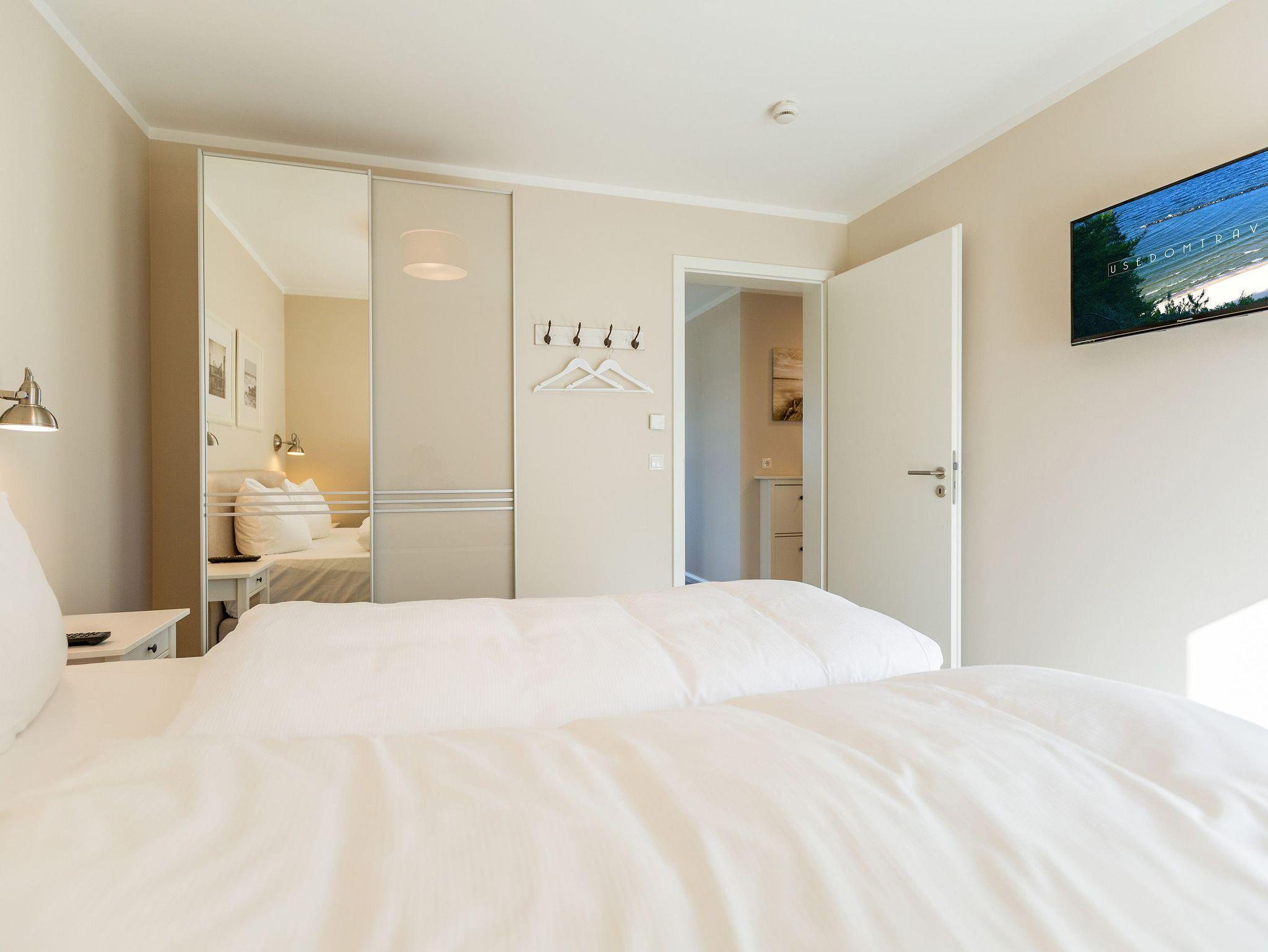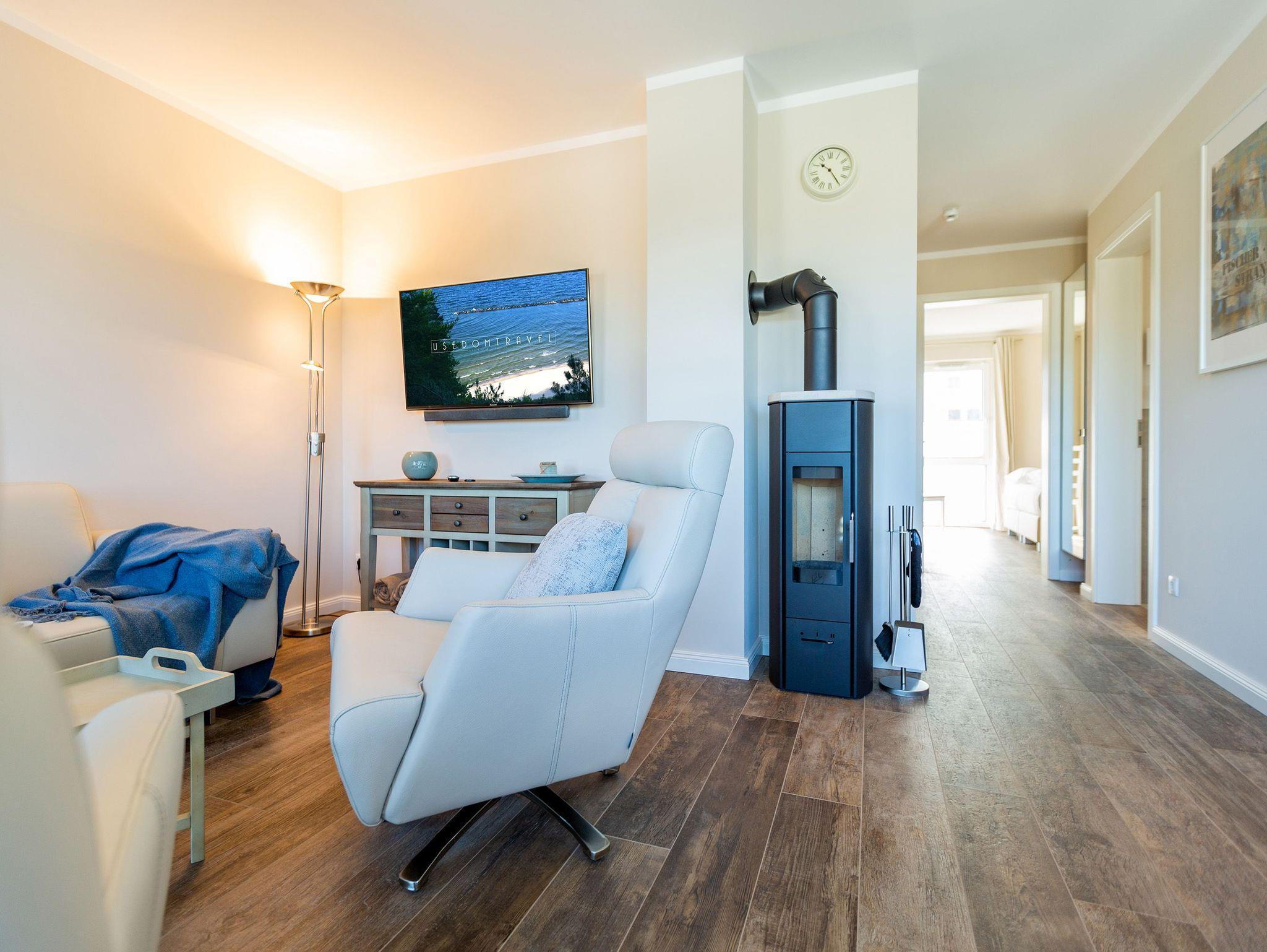 Großzügig, geschmackvoll und komfortabel ? die Wohnung 3 im Quartier am Fischerstrand ist ein Urlaubsdomizil, in dem Sie sich wohlfühlen werden und aus dem Sie nur ungern wieder in den Alltag wechseln wollen. Auf den 67 Quadratmetern erwartet Sie viel Licht, Eleganz und Leichtigkeit. Für bis zu vier Personen und ein Kleinkind bis drei Jahre (im Kinderreisebett) ist das Appartement im 1. Obergeschoss ideal zum Relaxen und Urlauben. Reinkommen, sich auf die gemütliche Couch oder in einen der Ledersessel fallen lassen und abschalten. Der Kaminofen sorgt obendrein für Gemütlichkeit. Ein großer Flat TV und die darunter befindliche Soundbar sind High-End-Entertainer. Das Wohnzimmer geht nahtlos in einen Essbereich mit großem Echtholztisch und eine offene Küche über. Alles, was Sie für ein schönes Abendessen benötigen, finden Sie darin. Hochwertige Markengeräte, schönes Essgeschirr ? lassen Sie es sich gut gehen. Beim Blick vom kleinen Schreibtisch über die Dächer von Heringsdorf schreiben sich Urlaubsgrüße wie von selbst. Genießen Sie die Sonne auf dem lichtüberfluteten Süd-West-Balkon. Zu der Wohnung gehören zwei schöne Schlafzimmer. Komfortable Boxspringdoppelbetten (1,60 m x 2,00 m) schenken erholsame Träume. Die beiden Bäder lassen keine Wellnesswünsche offen. Beide Räume verfügen über eine geräumige Regendusche, Waschtisch und WC. In einem Bad wartet sogar noch ein Highlight auf Entspannungshungrige. Eine Panoramasauna macht Ihre Auszeit in dieser schönen Ferienwohnung zum echten Erlebnis. Sie möchten zwischendurch mal waschen? Im großen Tageslichtbad steht eine Waschmaschine, die Sie kostenfrei nutzen können. Ebenso kostenfrei ist der Zugang zum WLAN. Wenn Sie anreisen, ist bereits alles fertig ? die Betten sind bezogen und Handtücher liegen bereit. Das Auto können Sie auf dem Außenstellplatz am Haus parken.