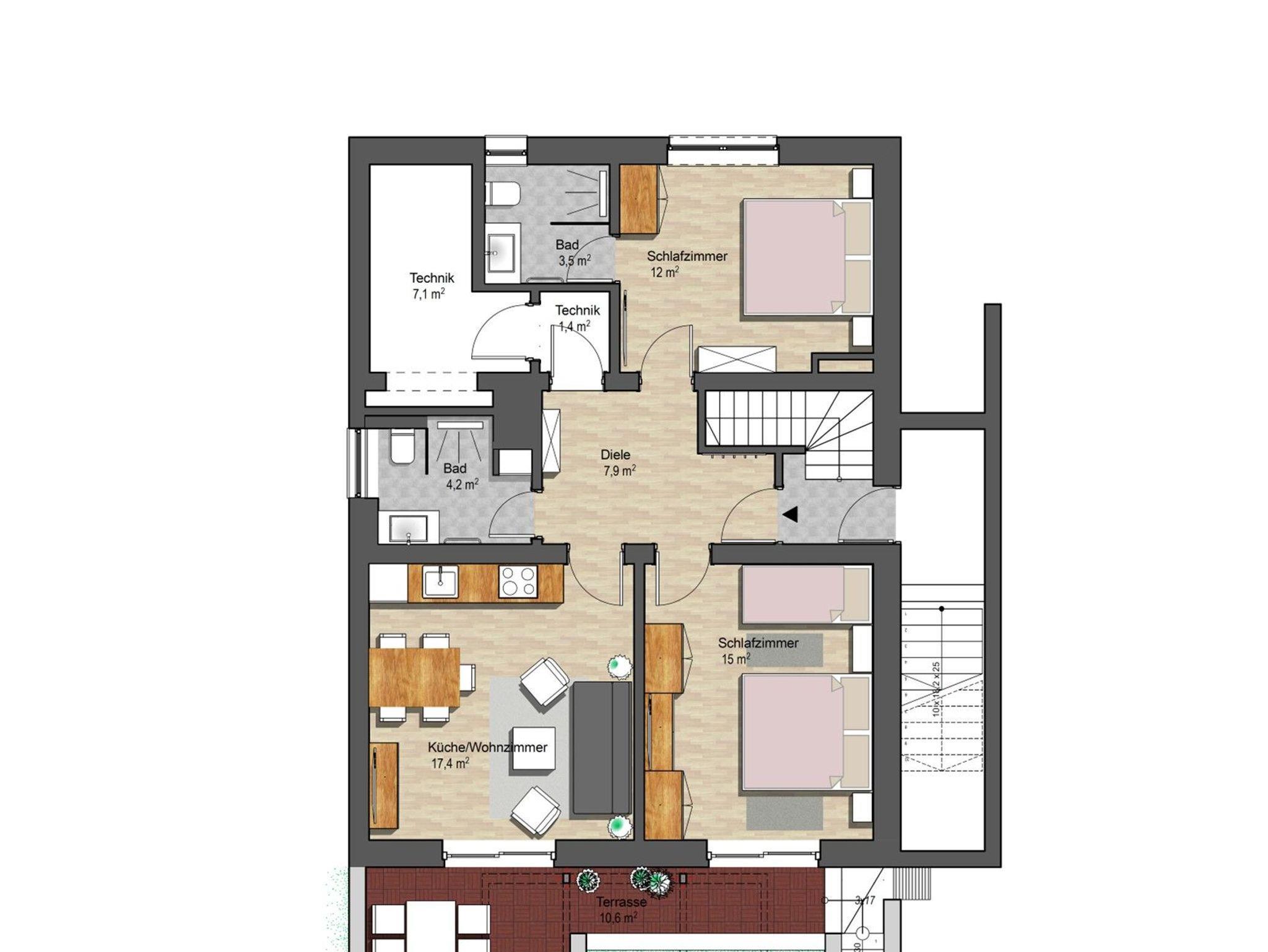 Über einen separaten Eingang gelangen Sie über den Flur in das Wohnzimmer mit gemütlicher Sitzgelegenheit, Flat-TV sowie einer integrierten Küchenzeile (Backofen, Ceranfeld, Mikrowelle, Kühlschrank mit Gefrierfach, Geschirrspülmaschine, Kochfeld, Wasserkocher, Toaster, Kaffeemaschine). Die sich an den Wohnbereich anschließende Sonnenterrasse lädt zum Entspannen beim Blick ins Grüne ein.