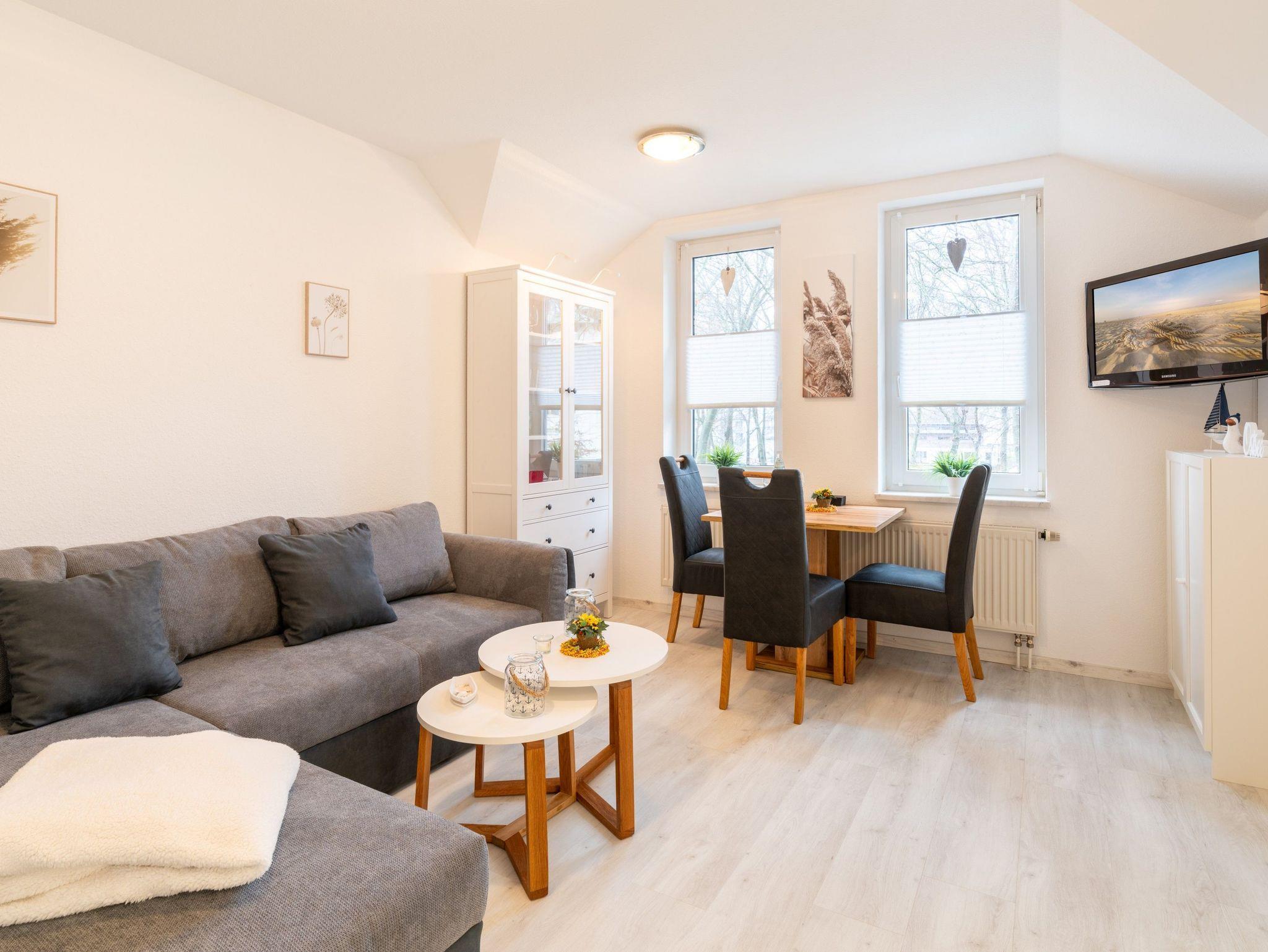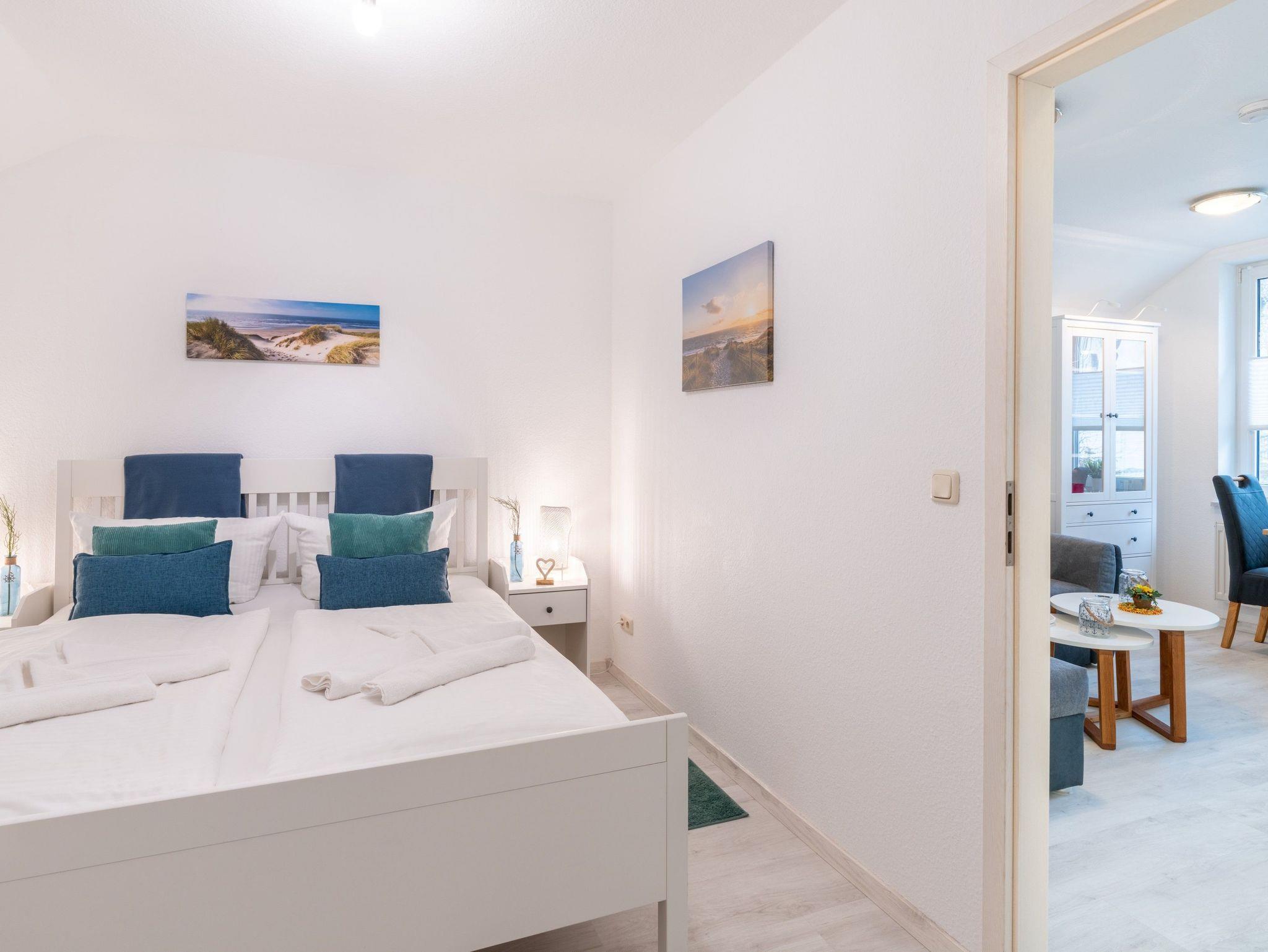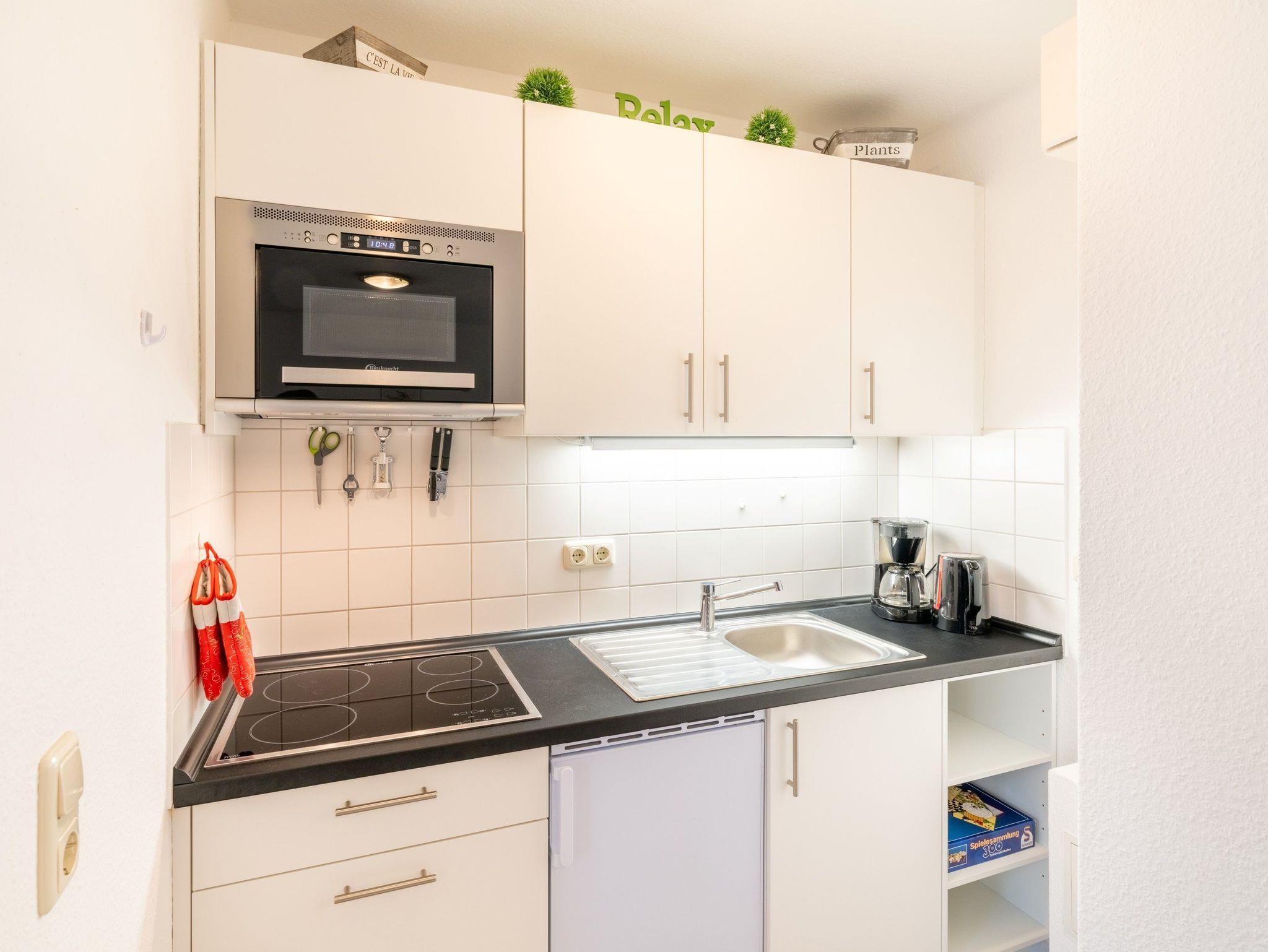 Die 2-Raum-Ferienwohnung ist ca. 32 qm groß und befindet sich im 1. Obergeschoss eines kleinen Appartementhauses. Sie verfügt über einen kombinierten Wohn- und Schlafraum mit einer Schlafcouch (1,40x2,00m) und Kabel-TV. Die offene Küchenzeile ist ausgestattet mit Ceran-Herd, Kühlschrank, Mikrowelle, Spüle, Kaffeemaschine, Wasserkocher und Toaster. Das Schlafzimmer verfügt über ein Doppelbett und über einen Kleiderschrank. Das Badezimmer ist mit einer Dusche ausgestattet. Wohn- und Schlafzimmer sind mit Laminat ausgelegt.