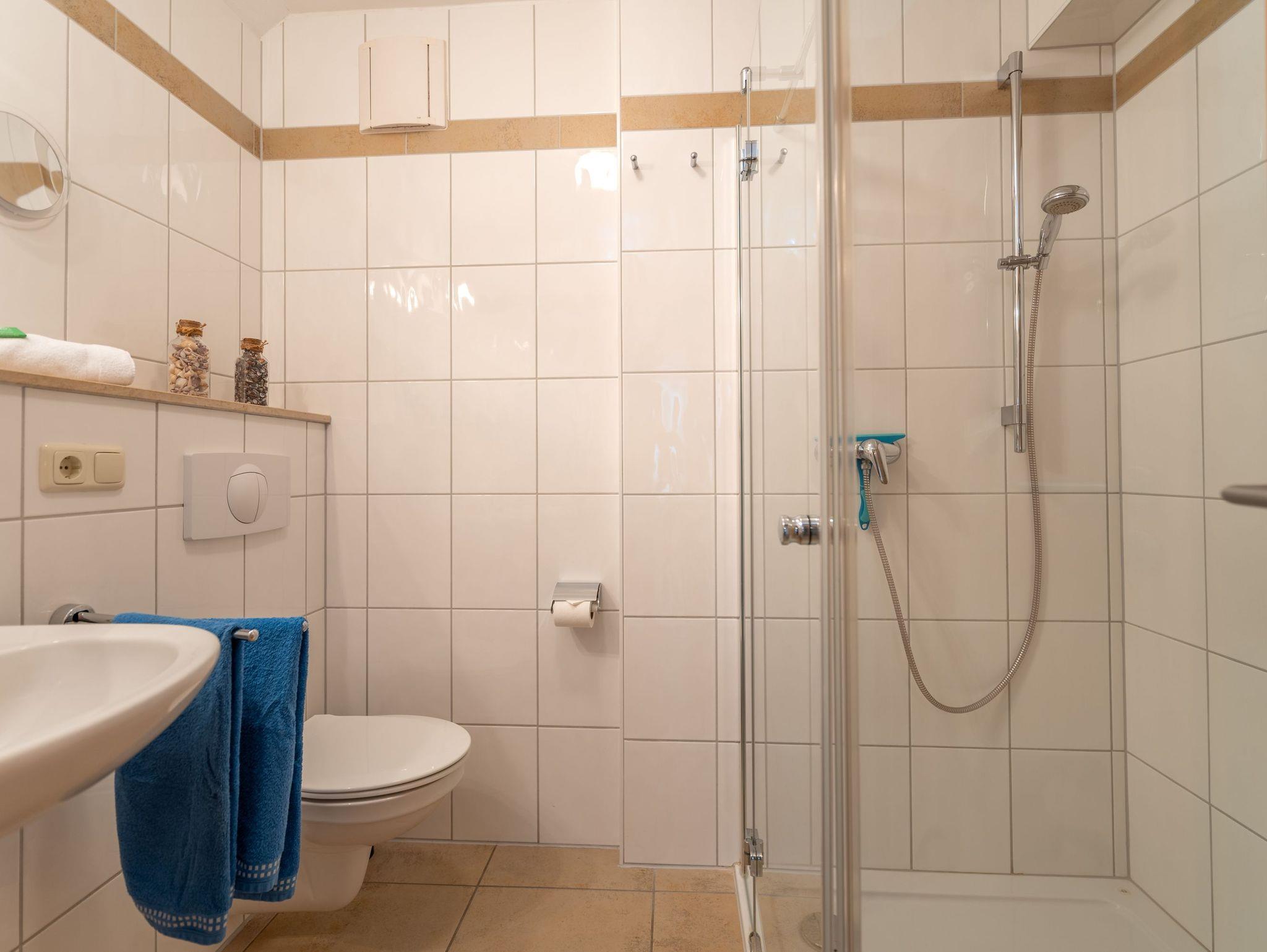 Das moderne Bad verfügt über Dusche und WC. Für längere Aufenthalte steht Ihnen ein gemeinschaftlicher Hauswirtschaftsraum mit Waschmaschine und Trockner zur Verfügung, die nach Absprache gegen eine geringe Gebühr genutzt werden können.