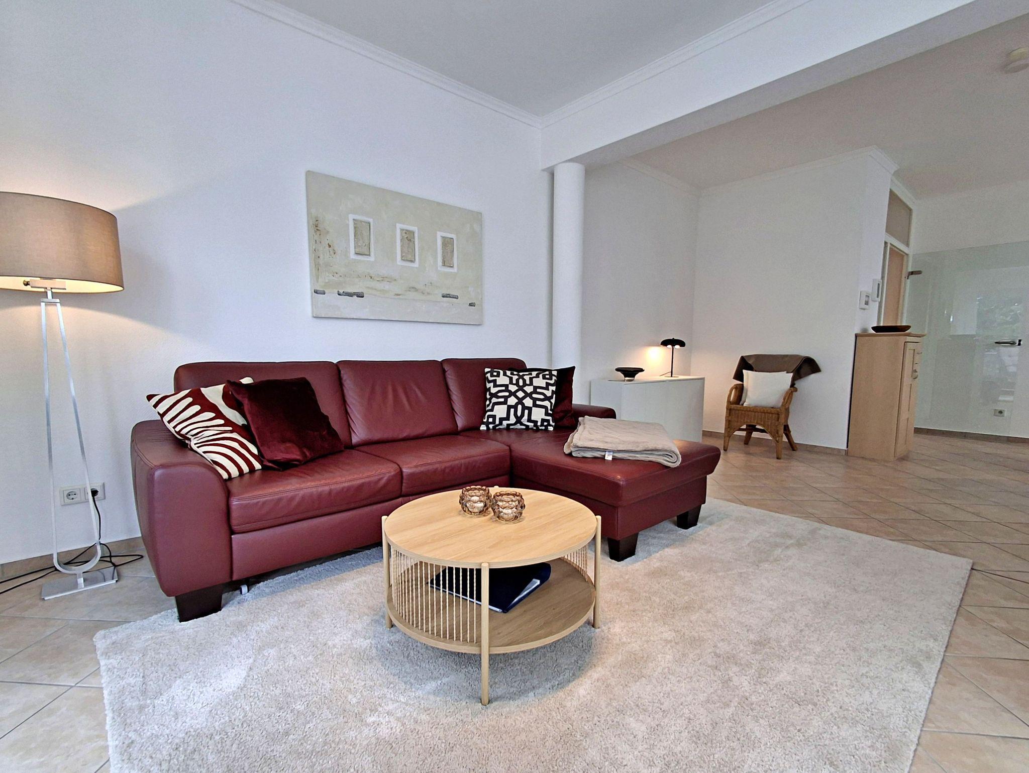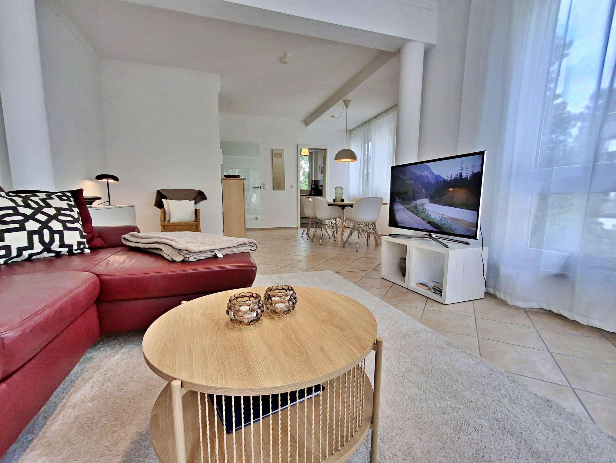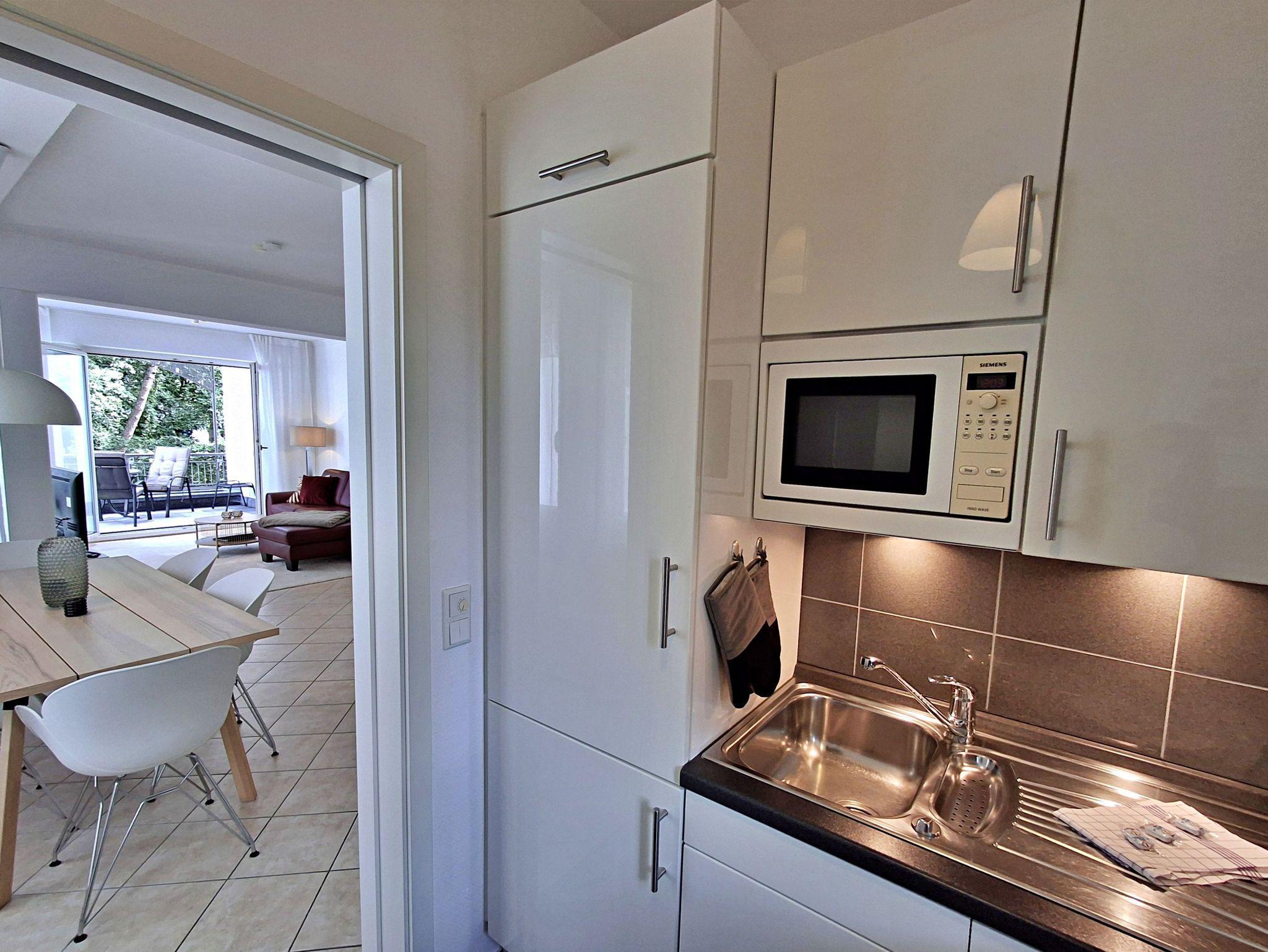 Mit einer Fläche von 74 qm in der 3. Etage bietet Ihnen diese komfortable und geräumige Nichtraucherwohnung ein helles und einladendes Ambiente. Genießen Sie den großen Balkon zur Meerseite, von dem aus Sie einen eingeschränkten Meerblick haben - besonders im Sommer, wenn die Bäume in voller Blüte stehen. Im großen Wohnzimmer finden Sie eine Couchsitzecke (als Doppelbettschlafcouch nutzbar, 1,40 m breit), die Platz für bis zu zwei Kinder bis 14 Jahre bietet und einen separaten Esstisch, welche zum Verweilen einladen. Hier können Sie sich auf eine entspannte Zeit mit Kabel-TV, Video/DVD und einer Radioanlage mit CD-Player freuen. Im gemütlichen Schlafzimmer befindet sich ein Doppelbett und Kabel-TV. Zwei moderne Bäder stehen Ihnen zur Verfügung: eines mit einer Eckbadewanne und WC, das andere mit Dusche und WC sowie einem Fön. Die Fußbodenheizung sorgt für zusätzlichen Komfort. In der komplett ausgestatteten separaten Küche finden Sie alles, was Sie benötigen, darunter einen Geschirrspüler, Ceranherd, Backofen, Kühl-/Gefrierkombination und Mikrowelle.