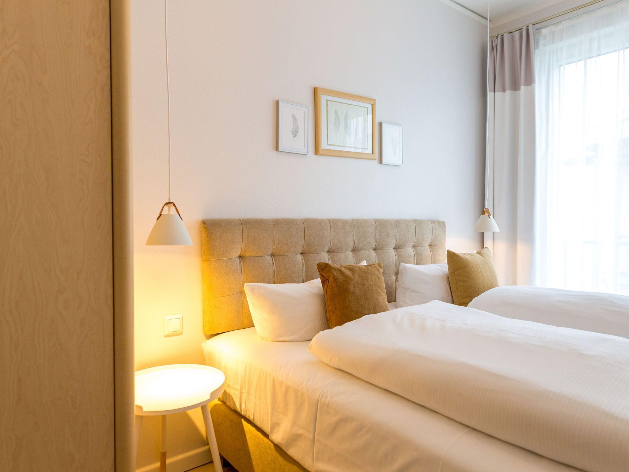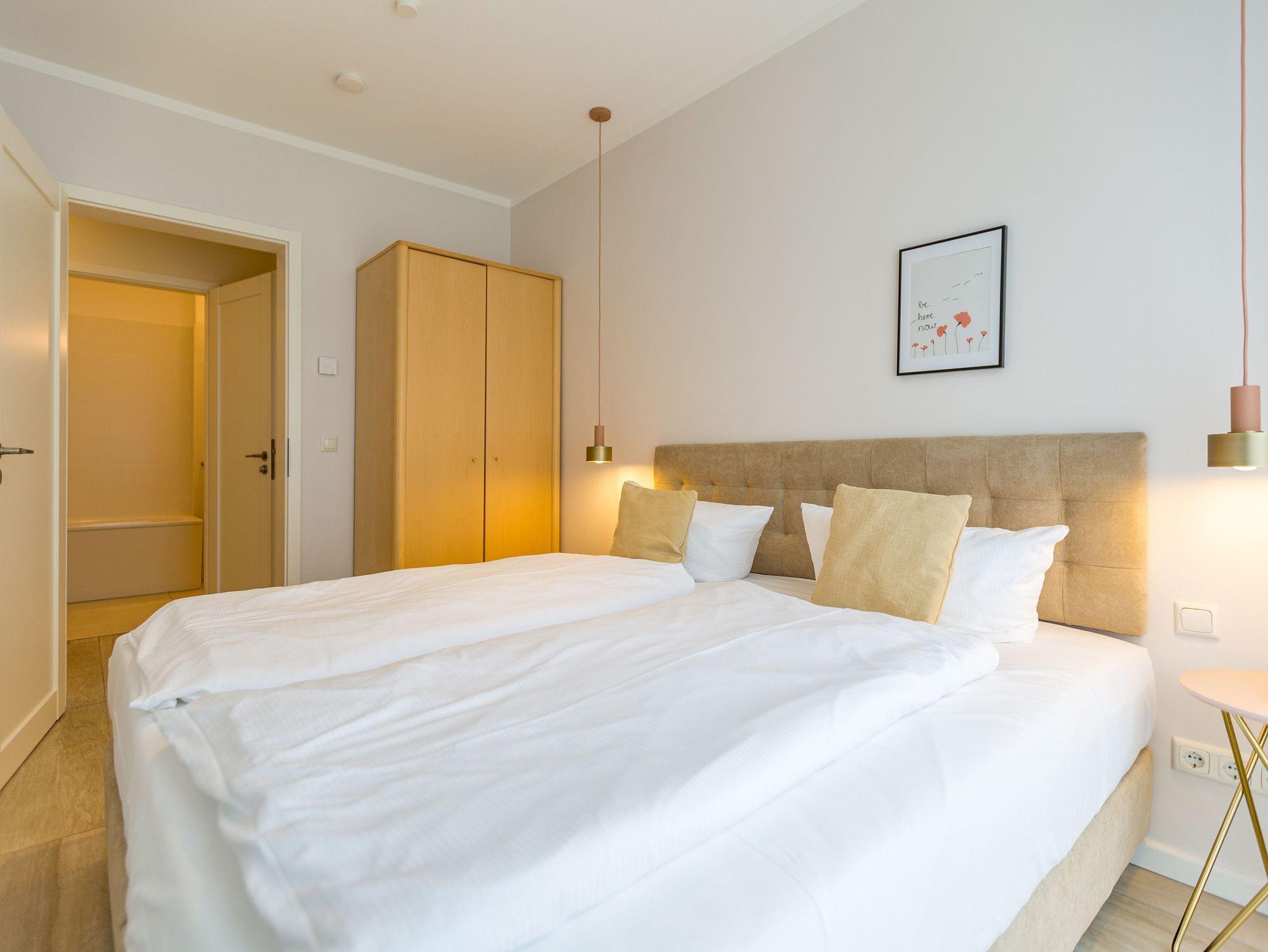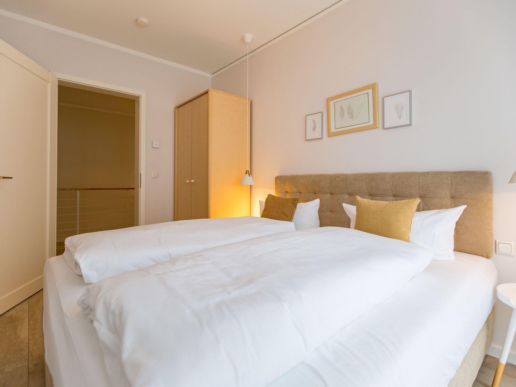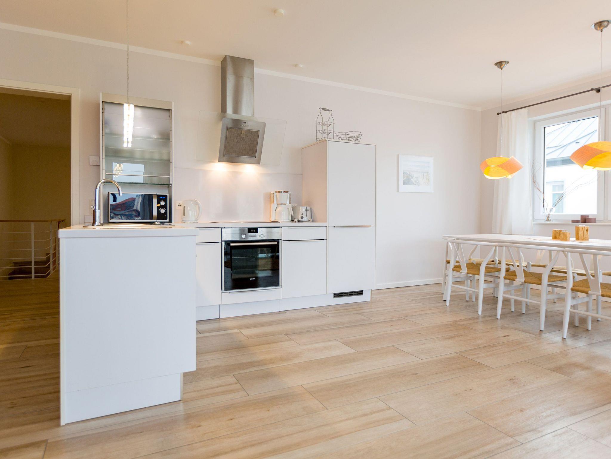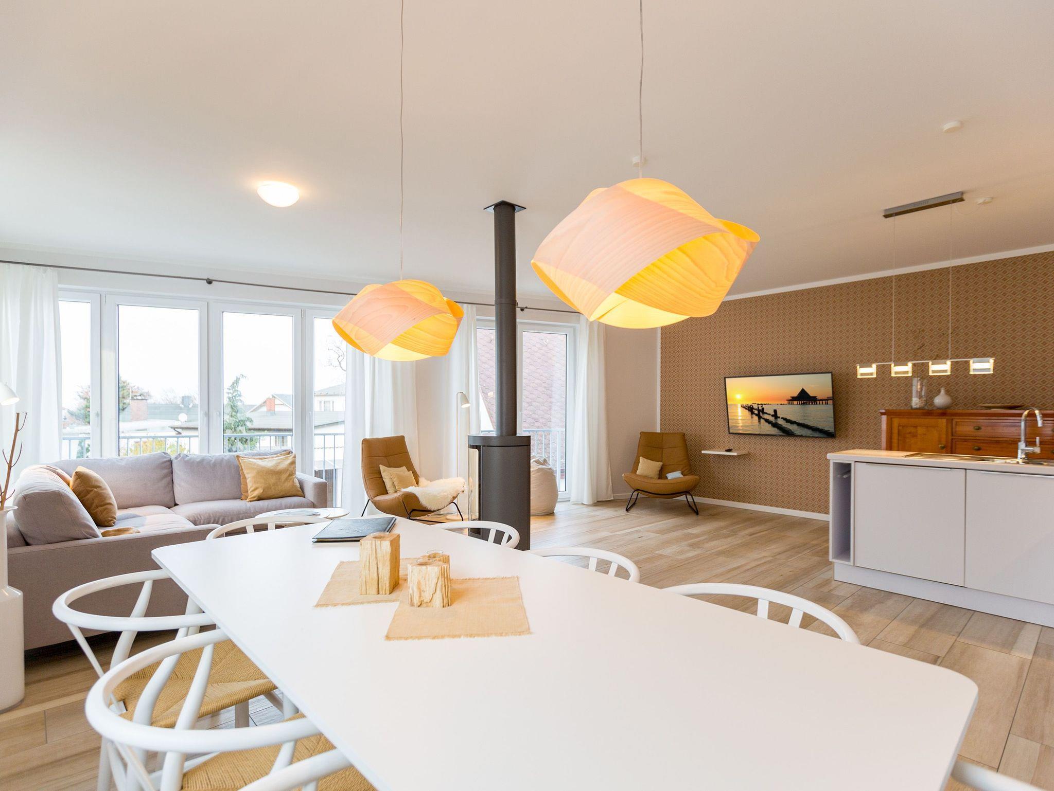 Schließen Sie die Augen und träumen Sie sich in dieses Feriendomizil an der Ostsee, dass auf großzügigen 147qm Erholung für die ganze Familie oder die besten Freunde verspricht. Auf insgesamt zwei Etagen mit 4 Schlafzimmern und 2 Bädern bietet dieses Appartement ausreichend Platz für bis zu 8 Personen und 1 Kleinkind (im Babyreisebett). Ein im Strandhaus-Stil gehaltenes Interieur, kombiniert mit hellen Naturtönen und Materialien aus Korb und Holz, komplettieren das Urlaubsgefühl. Im großzügigen Eingangsbereich im Erdgeschoss befindet sich neben einer Garderobe ein gemütlicher Loungesessel mit Leseecke, der ein Gefühl des Nachhausekommens versprüht. Das angrenzende Schlafzimmer mit eigenem Terrassenzugang und komfortablem Boxspringbett (1,80m x 2,00m) ist der perfekte Rückzugsort für Eltern oder Großeltern, die sich auf dieser Etage nach Ruhe sehnen. Ebenfalls im Erdgeschoss befindet sich eines der beiden Badezimmer mit Finnischer Sauna, die nach einem langen Strandspaziergang zu einem heißen Aufguss einlädt. Eine Dusche, ein Waschtisch sowie ein WC runden den Bereich des unteren Badezimmers ab. Außergewöhnlich könnte man das Wohnzimmer beschreiben, dass sich im Obergeschoss befindet. Der offen gestaltete Wohn-Ess-Bereich avanciert zum zentralen Treffpunkt des Appartements. Nicht zuletzt wegen des Kamins, dessen wohlige Wärme Sie direkt vom Sofa und auch vom Esstisch aus genießen können. Die integrierte moderne Küche ist voll ausgestattet und verfügt über hochwertige Küchengeräte (Mikrowelle, Backofen, Ceranfeld, Spülmaschine, Kühlschrank mit Gefrierfach). Entspannen Sie anschließend auf einem der beiden Stressless-Sessel und der bequemen Sofalandschaft vor dem Flat-TV, bevor Sie die Nacht in einem der drei Schlafzimmer im Obergeschoss verbringen, die alle über Boxspringbetten (1,80m x 2,00m), ausreichend Schrank- und Ablagefläche sowie einen Flat-TV verfügen. Eine kleine Wellness-Oase ist das Wannenbad im Obergeschoss, dass außerdem über eine Dusche, ein WC und einen Waschtisch verfügt. Bei Ihrer Anreise liegen für Sie Handtücher bereit. Auch die Betten sind bereits bezogen. Ein dem Appartement zugehöriger Stellplatz in einer Garage und ein Stellplatz am Haus für einen Kleinwagen (hier muss immer rückwärts eingeparkt werden) sowie ein paar wenige Fahrradabstellmöglichkeiten in der Garage zählen ebenso zu diesem Feriendomizil wie kostenfreies WLAN.