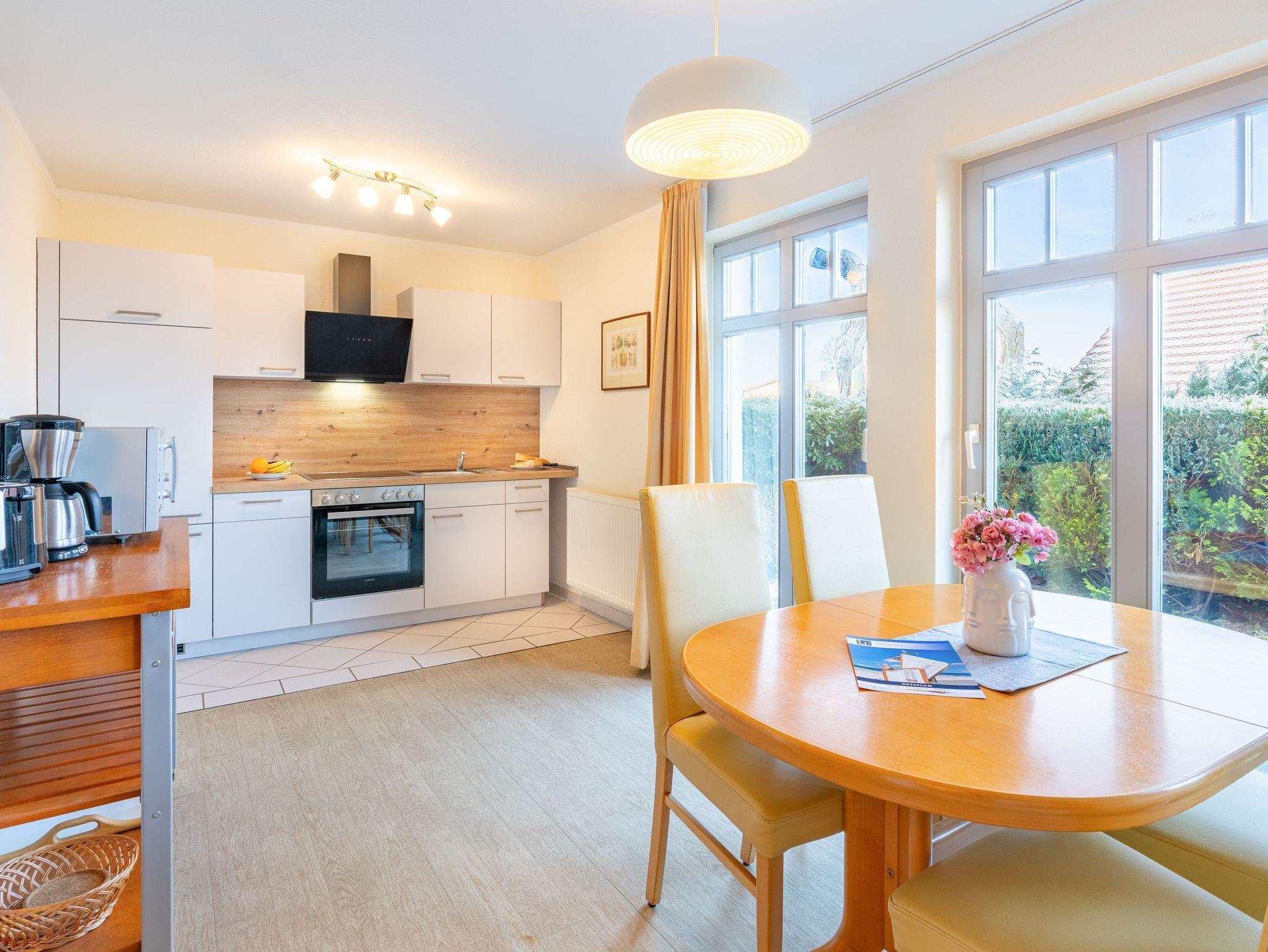 Der Essplatz direkt an der Fensterfront, mit Blick ins Grüne, bietet Platz für vier Personen, um den kulinarischen Freuden zu frönen. Für die Zubereitung der Lieblingsspeisen bietet die in den Wohnraum integrierte, neue Küchenzeile mit Ceranfeld (4 Kochfelder), Mikrowelle, Kühlschrank mit Gefrierfach, Wasserkocher, Kaffeemaschine, Spülmaschine und Toaster beste Voraussetzungen.