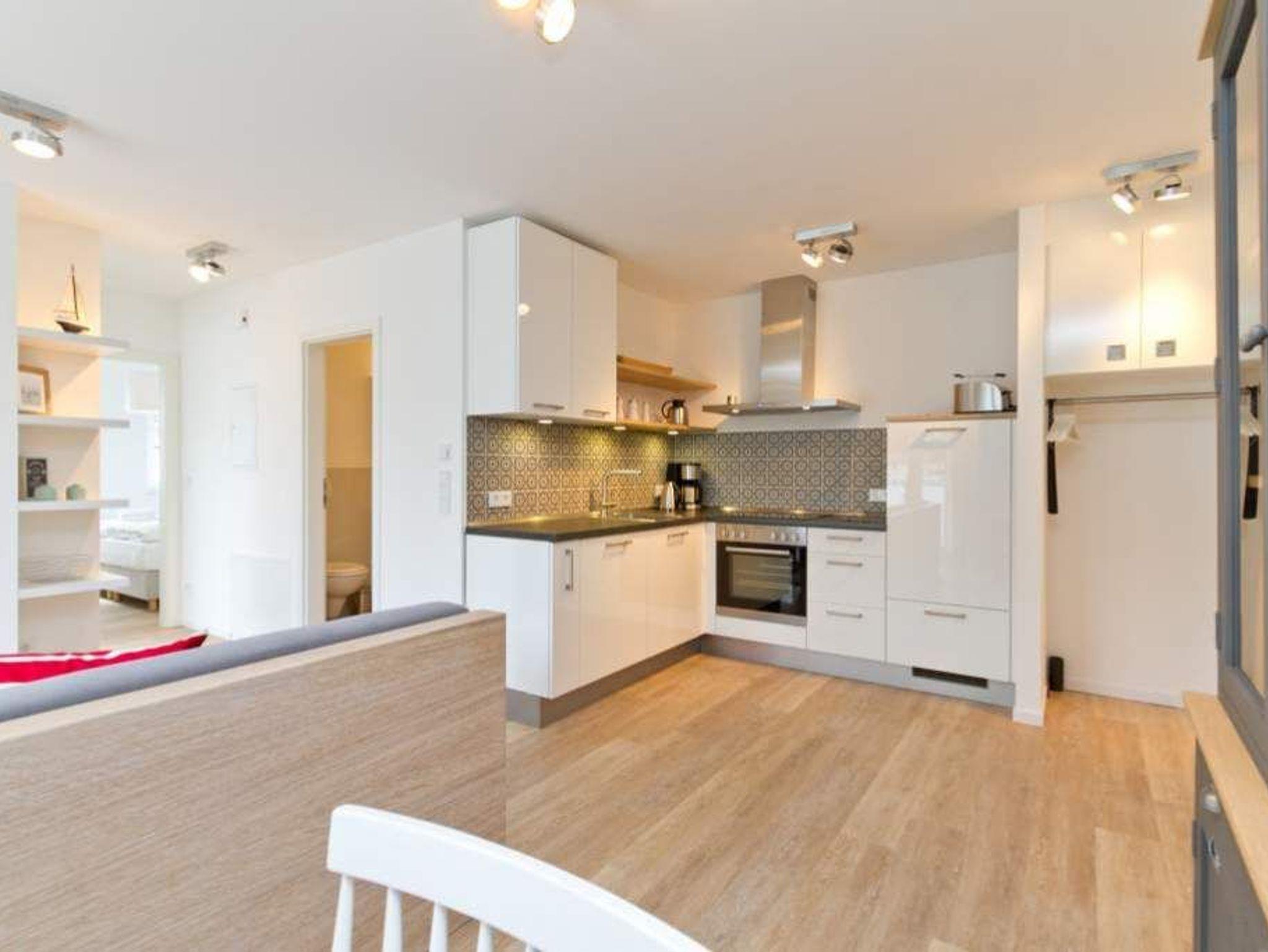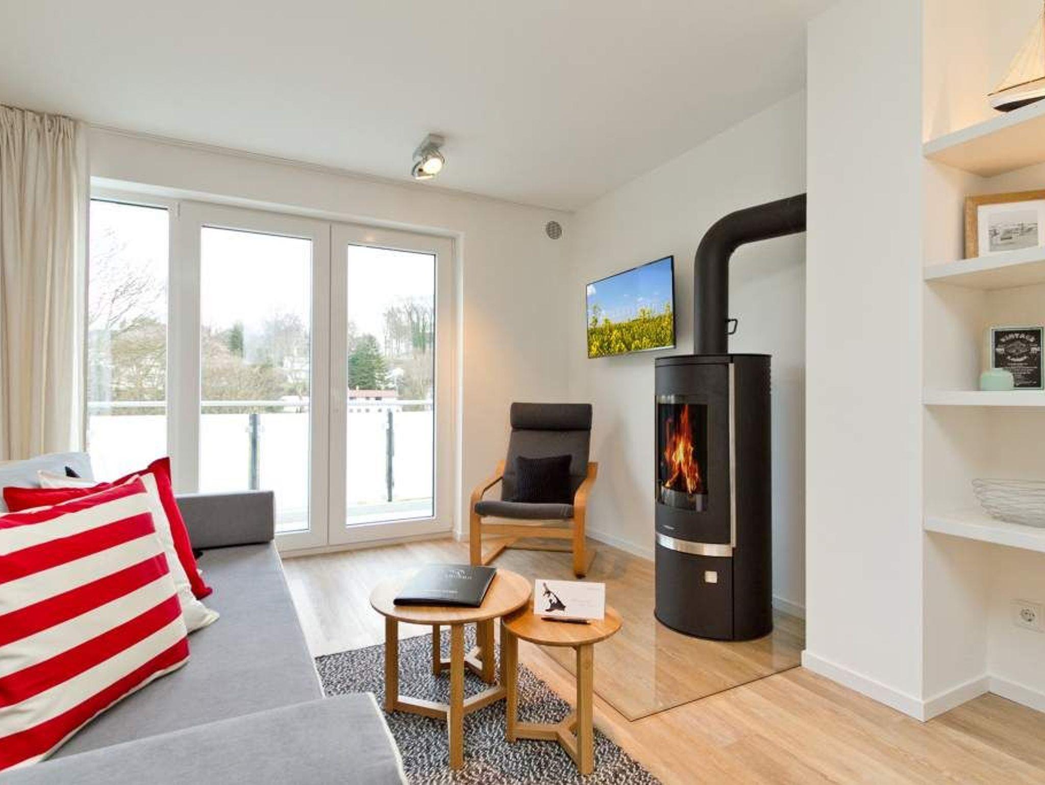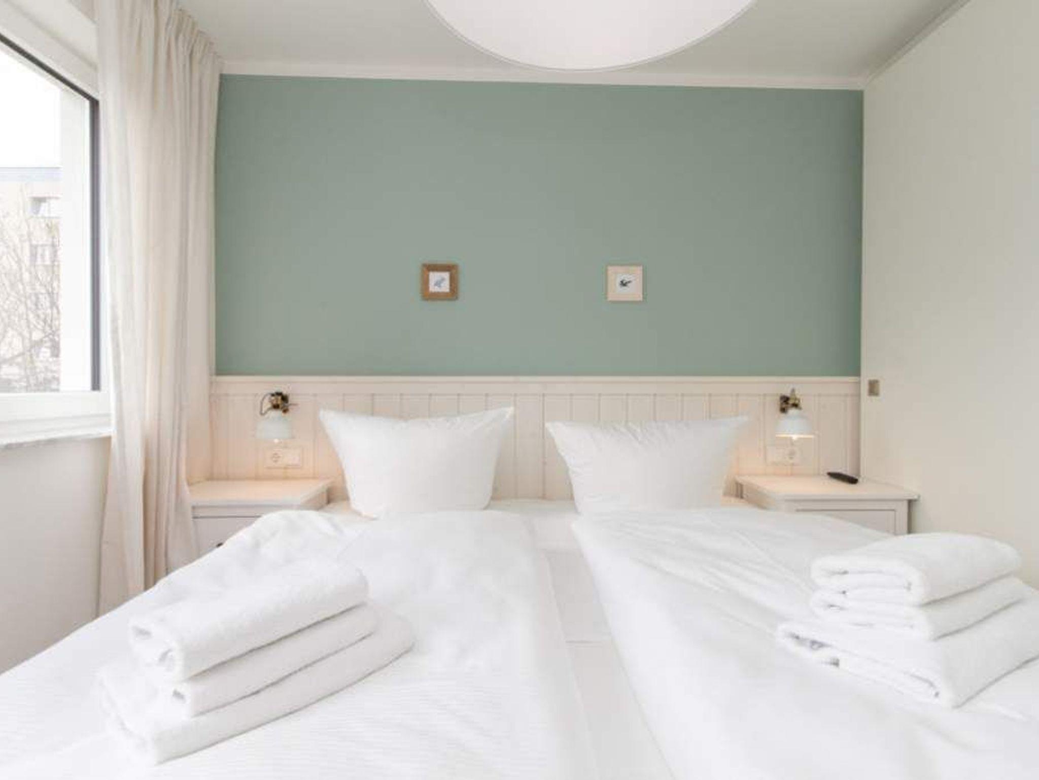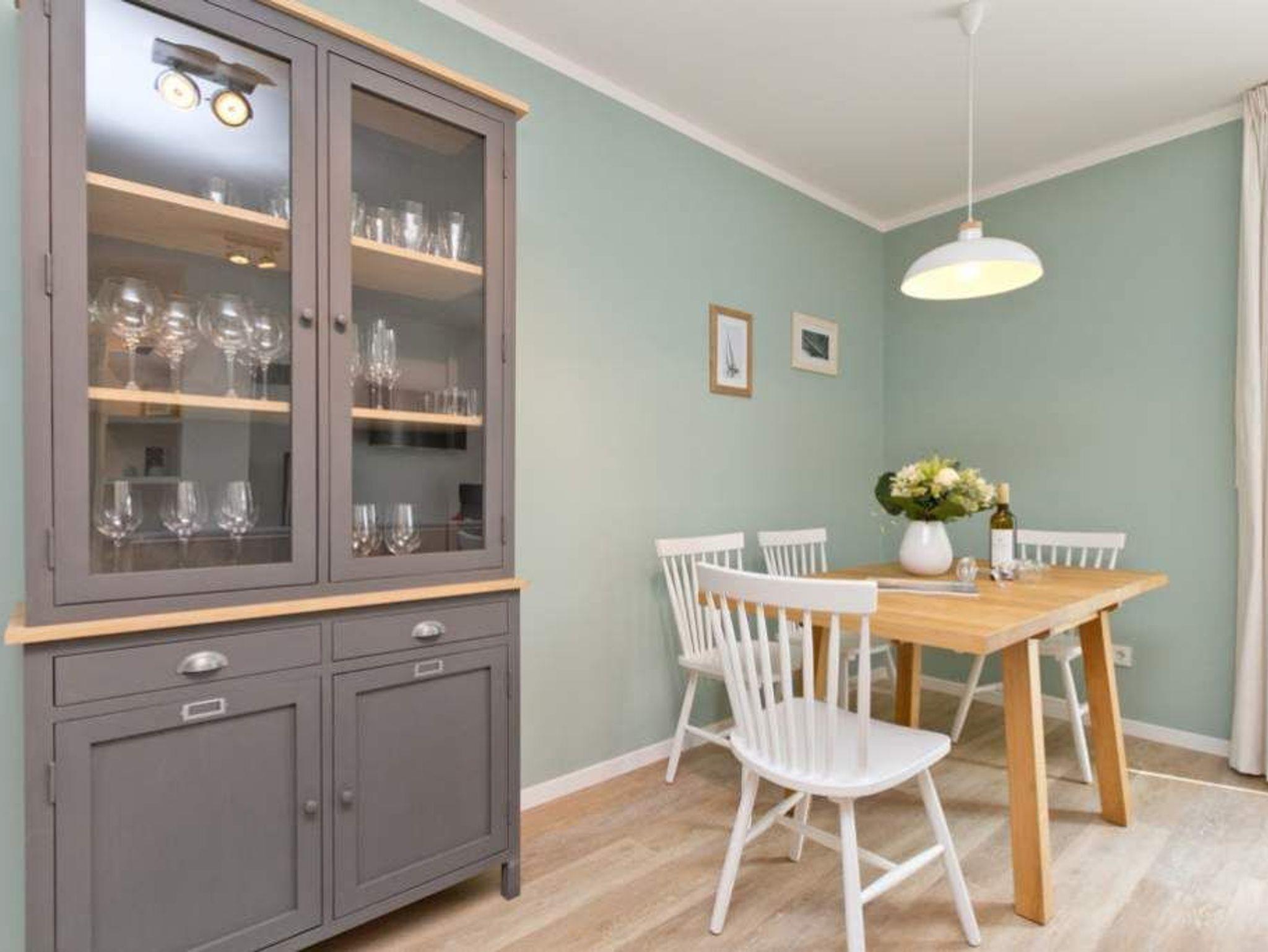 Ein schönes, großes und helles Wohn-Esszimmer ist das Zentrum dieser traumhaften Ferienwohnung im 2. Stock der Villa Bettina in Heringsdorf. Viel Weiß, ein Mint-Pastell an den Wänden und nordische Design-Möbel verleihen den 54 Quadratmetern Charme und Noblesse. Ein großer Holzesstisch ist der ideale Platz für gemeinsame Stunden. Ebenso die gemütliche Couch, von der aus Sie einen wunderbaren Blick auf das Flammenspiel im Kaminofen, den Flat-TV oder den Balkon haben. Lassen Sie sich schon beim Frühstück von der Morgensonne verwöhnen, die hier auf der Sonneninsel Usedom fast jeden Morgen zu einem sonnigen Start verhilft. Die offene Küche ist mit hochwertigen Gerätschaften und edlem Geschirr ausgestattet. Und schick ist die ausgesuchte Fliesenoptik obendrein. Wer sich im Urlaub himmlisch betten möchte, bekommt in diesem Feriendomizil in zwei schönen Schlafzimmern die Gelegenheit dazu. In den beiden Zimmern befinden sich je ein bequemes Boxspringdoppelbett (1,80 m x 2,00 m). Geräumige Schränke bieten viel Stauraum. Ein Schlafzimmer ist zudem mit einem Flat-TV ausgestattet. Dafür hat das andere Schlafzimmer einen Zugang zum Balkon. Das Duschen wird unter der ebenerdigen Regendusche im Badezimmer zum echten Genuss. Ein Waschtisch und ein WC gehören ebenfalls zur Ausstattung. Platz bietet das Appartement vier Personen und einem Kleinkind (im Kinderreisebett). Handtücher liegen bei Ankunft bereit. Außerdem sind die Betten bezogen. Die WLAN-Nutzung ist kostenfrei möglich. Für Ihr Auto steht am Haus ein Stellplatz zur Verfügung.