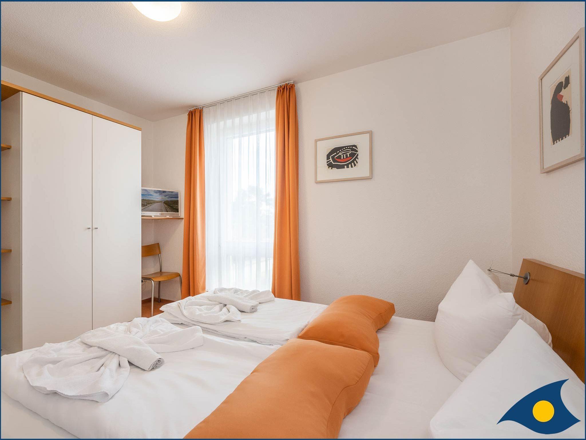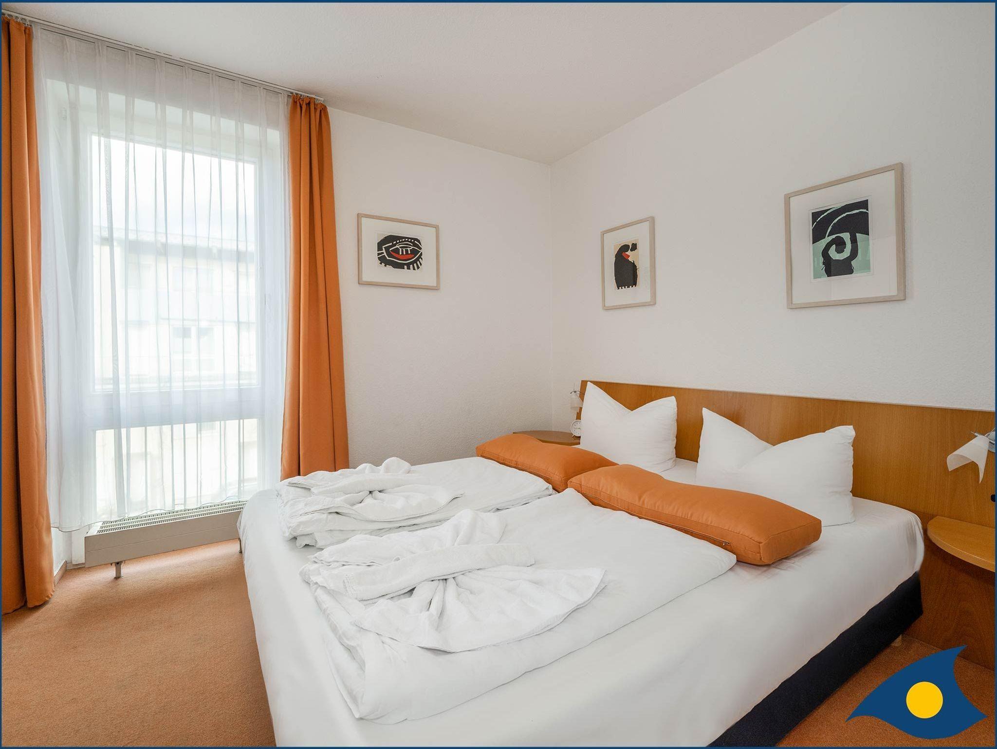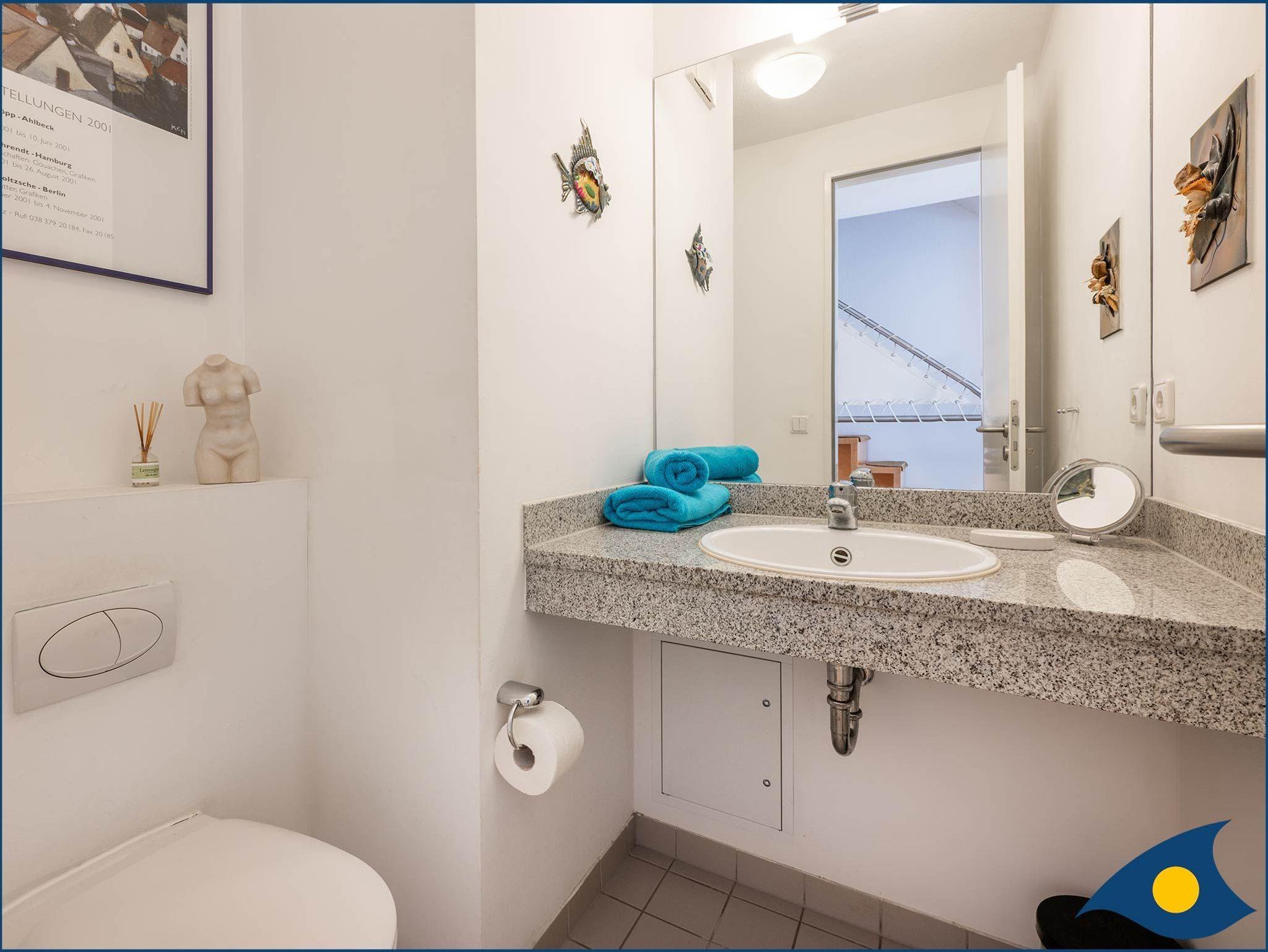 Bei diesem Appartement (Nichtraucher) handelt es sich um eine schöne, helle Maisonettewohnung mit maritimem Flair und seitlichem Meerblick im ersten und zweiten Obergeschoss des Hauses. Mit einer Wohnfläche von ca. 58 qm sind die Räumlichkeiten bestens geeignet für den Urlaub mit bis zu vier Personen. Der Eingangsbereich, die Küche, das Gäste-WC, das Ess- und das Wohnzimmer befinden sich in der ersten Etage. Über eine Treppe innerhalb der Wohnung erreichen Sie das Schlaf- und das Badezimmer.