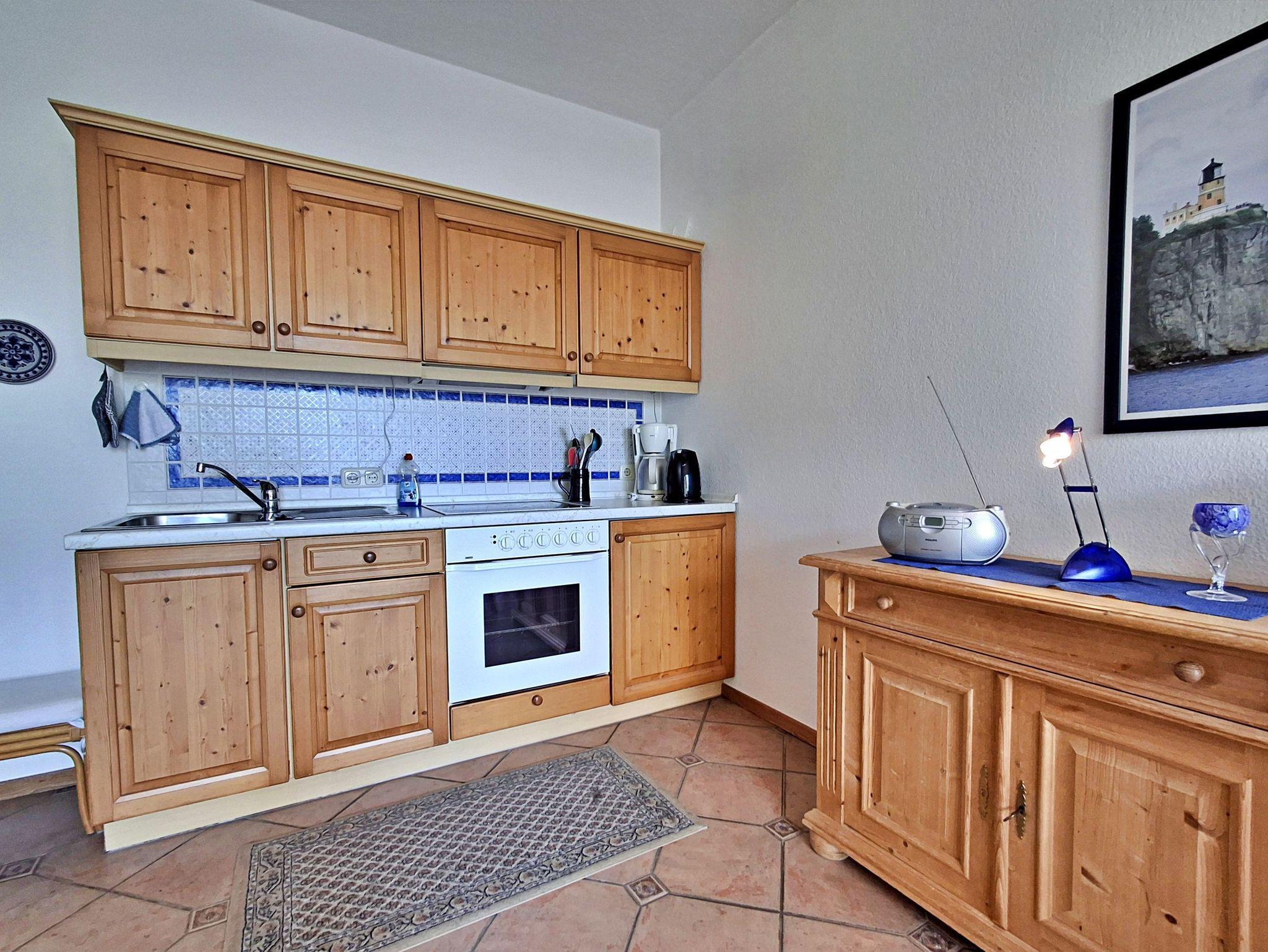 Diese gemütliche Unterkunft im zweiten Obergeschoss eines 1996 erbauten Hauses bietet auf 33 qm Platz für bis zu 2 Personen und ein Kleinkind. Der einladende Wohnraum ist mit einer bequemen Schlafcouch ausgestattet, die Ihnen erholsame Nächte garantiert - die Topper finden Sie ganz praktisch im Bettkasten der Couch. Hier gibt es auch eine gemütliche Essecke und eine Küchenzeile mit Ceranherd, Backofen Kaffeemaschine und Wasserkocher die zum gemeinsamen Kochen einlädt. Für zusätzliche Schlafmöglichkeiten steht Ihnen eine faltbare Matratze zur Verfügung.