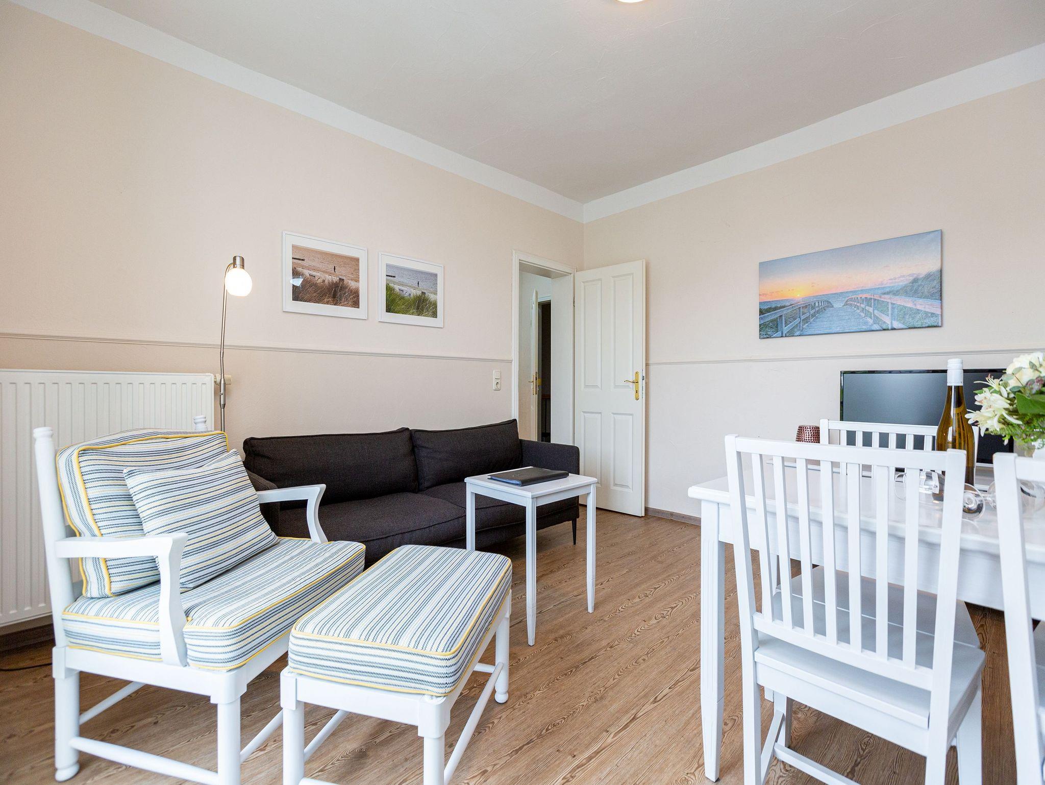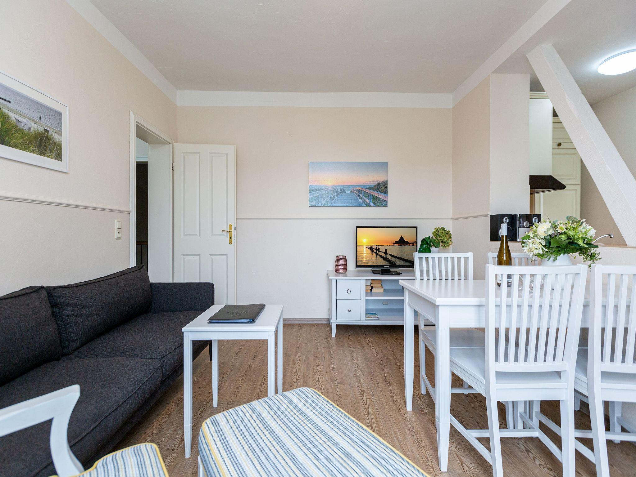 Die Ostsee im Blick und wunderschöne, weiße, alte Villen ? Allein das ist schon Erholung. Und dieses kleine Urlaubsparadies in der zweiten Etage der Villa Amelia tut für Ihre Entspannung ein Übriges. Die exklusive und elegante Einrichtung nimmt sie mit auf eine Reise in die luxuriöse Kaiserzeit. Dazu kommt viel Komfort und Gemütlichkeit. Das offene Wohn-Esszimmer besticht durch viel Weiß und die Liebe zum Detail. Natürlich gehören zum Wohnzimmer auch ein Flat-TV und eine Mediaanlage. Bis zu vier Personen ( 3 Erwachsene [&] 1 Kind bis 15 Jahre) können sich hier eine schöne und gemeinsame Zeit gönnen. Platz ist für sie nicht nur in den beiden Schlafzimmern mit den Boxspringdoppelbetten, sondern auch auf der schönen Vintage-Sitzgruppe oder am Esstisch. Die offene Küche ist voll ausgestattet. Auch mit Geschirr. Das mondäne Tageslicht-Badezimmer besitzt eine Dusche, ein WC und einen Waschtisch. Für Ihren Komfort sind die Betten bezogen und Handtücher liegen bereit. Das WLAN Netz im Haus kann kostenfrei genutzt werden. Zum Appartement gehört ein Pkw-Stellplatz am Haus.