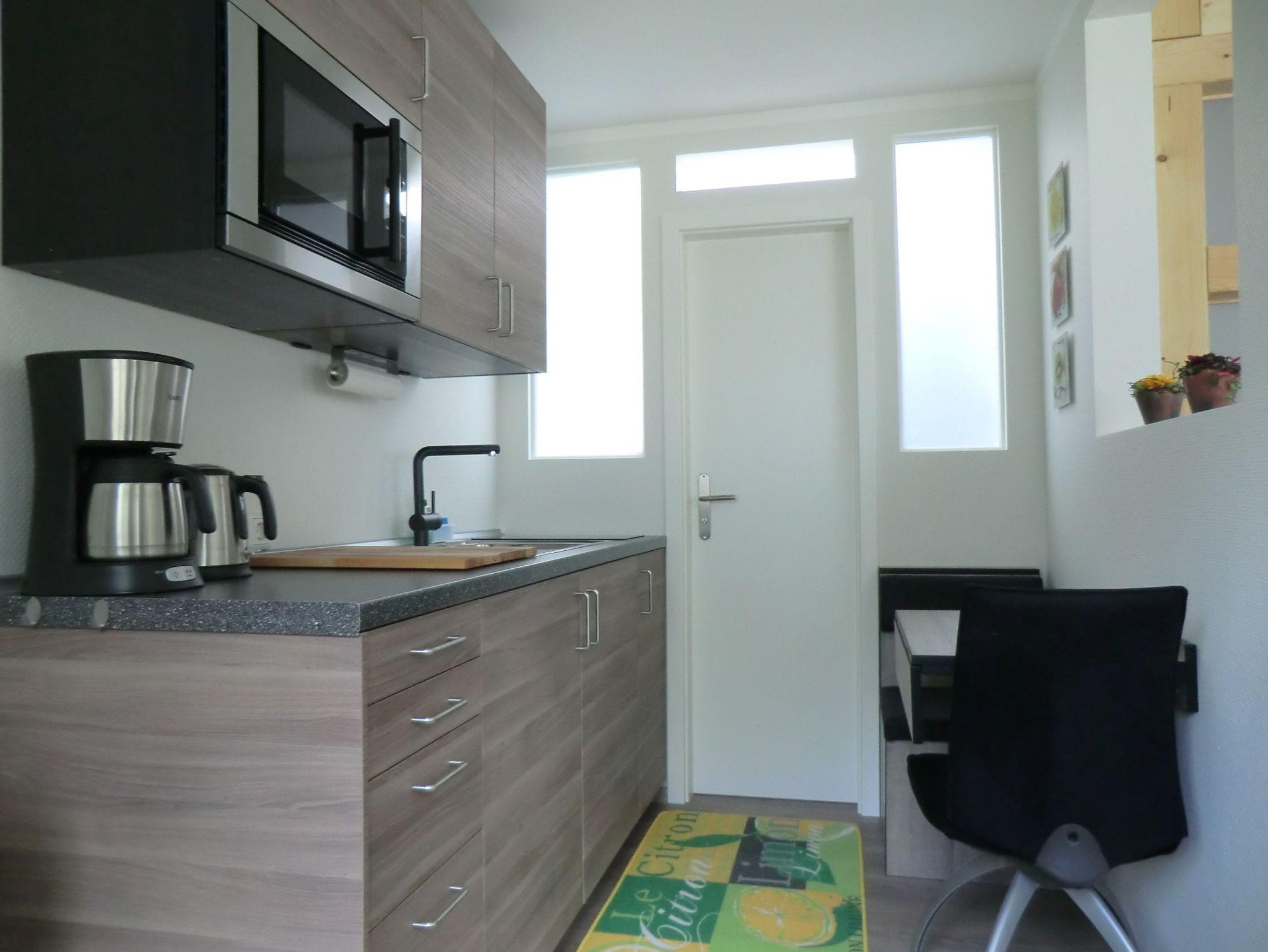 • moderne Einbau-Küche mit Kühlschrank, Glaskeramik-Kochfeld, Mikrowelle, Wasserkocher, Kaffeemaschine, Toaster, separater Essbereich