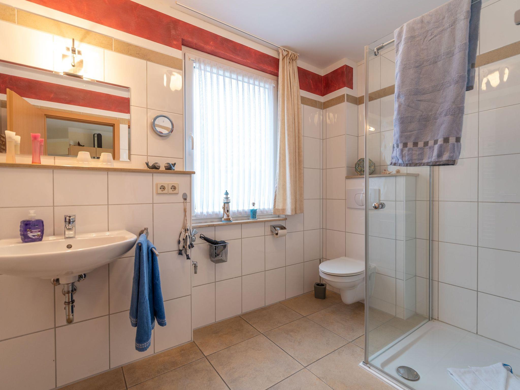 Auf der sonnigen Südterrasse mit Blick in den großzügigen Garten können Sie wunderbar entspannen. Das Bad überzeugt mit einer ebenerdigen Dusche, WC und Föhn.