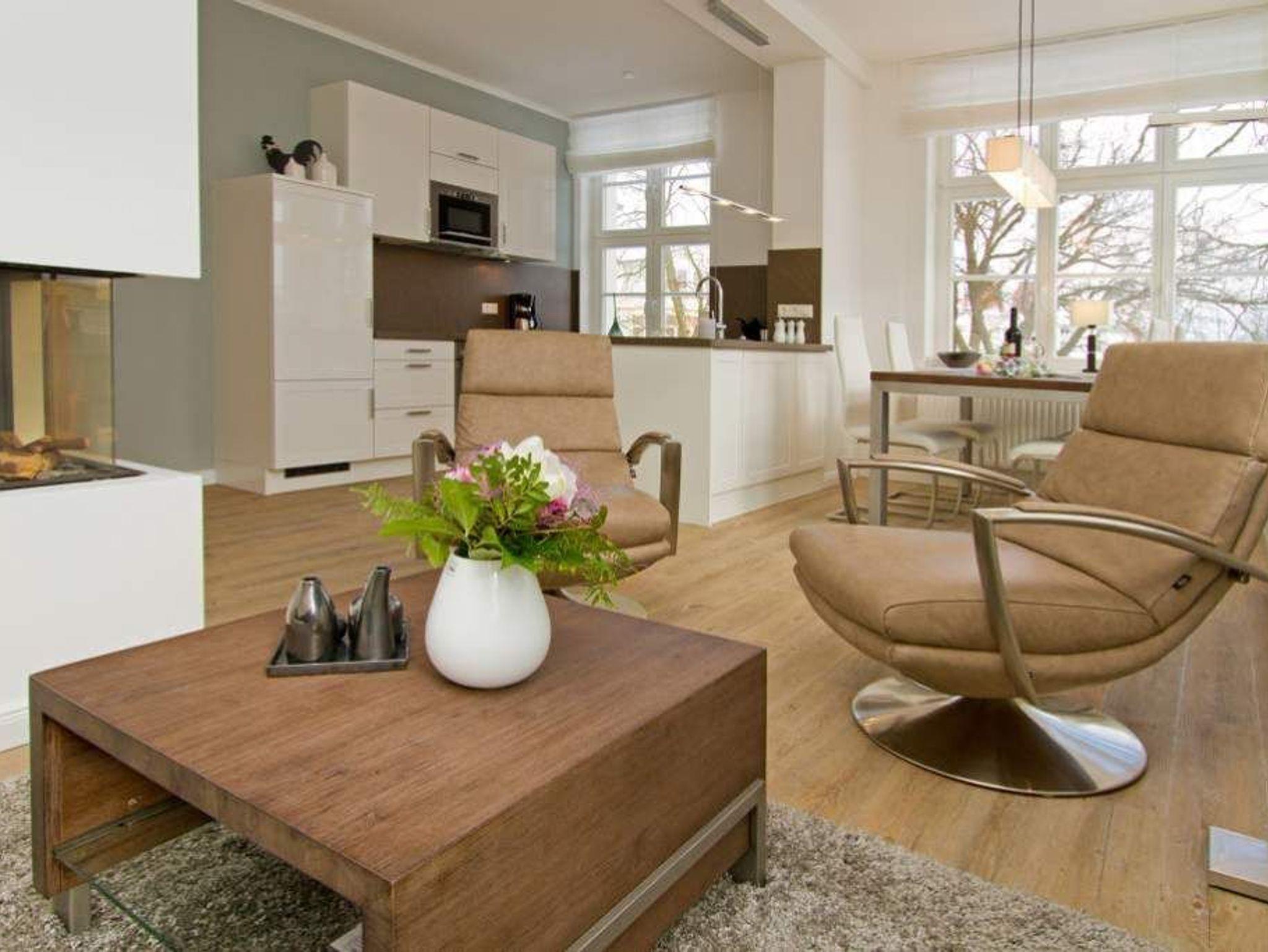 Hell, modern, stylisch! Auch diese großzügige 3-Raum-Ferienwohnung ( 70 qm) im 1.OG bietet neben ausreichend Platz für max. 4 Personen eine luxuriöse Ausstattung und Möblierung, die viel Urlaubsflair versprüht. Ausstattungstechnisch wurde selbstverständlich an alles gedacht. Der geschmackvoll möblierte Wohnbereich mit Flat-TV und Blue-Ray-Player Philips Heimkinosystem bietet auch einen per Fernbedienung bedienbaren Gas-Designkamin. Ein Highlight besonders in der kalten Jahreszeit. An den schönen Essbereich in der verglasten Veranda, schließt sich eine offene, komplett ausgestattete Küche an (auch Waschmaschine vorhanden). Auch die beiden Schlafzimmer mit Boxspringbetten ( 1,60 m) für erholsamen Schlaf sind mit je einem Flat-TV ausgestattet. Für Ihren Komfort steht die Erstausstattung Wäsche für Sie bereit. Ergänzt wird die Wohnung durch ein schönes Bad mit Doppelwaschtisch und Echtglasdusche und ein Gäste-WC. Wer keine Lust auf Strand hat, macht es sich auf dem großen, sonnigen Südbalkon gemütlich, bequeme Gartenmöbel und eine Sonnenliege warten hier auf Sie. Das WLAN-Netz im Haus kann kostenfrei genutzt werden.