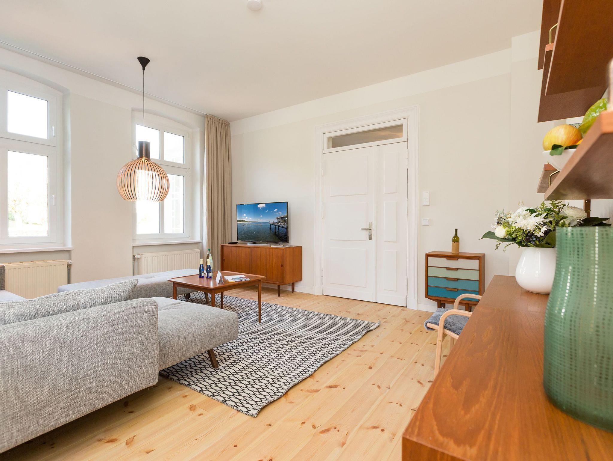 Ganz im angesagten Midcentury-Stil skandinavischer Klassiker ist die Wohnung 2 des Baltischen Hauses im Erdgeschoss gestaltet. Und das vom Feinsten. Ob Sideboards, Kommoden, Lampen, der große Wohnzimmer-Teppich mit geometrischem Muster, Regale und Wohnaccessoires ? in den 68 Quadratmetern, in denen zwei, maximal fünf Personen Platz haben, umgibt Sie stylisches Wohlfühldesign aus einem der architektonisch derzeit angesagtesten Jahrzehnte des 20. Jahrhunderts. Und das auf nachhaltige Art mit schadstoffgeprüften und hochwertigen Materialien. Nicht umsonst trägt das Appartement den Namen „die gute alte Zeit“. Denn die Innenarchitektin von Green Living hat das gesamte Appartement auf ein natürliches und ökologisch wertvolles Konzept hin abgestimmt. Keine schädlichen Lacke und Leime verpesten hier die Luft. Auch Allergiker können in diesem Urlaubsdomizil auf der gemütlichen Wohnlandschaft entspannend tief durchatmen. Ein großer Flat-TV gehört zur Ausstattung des großen und wunderbar hellen Wohnzimmers dazu. Ein absolutes Highlight der Wohnung ist die helle Veranda mit der offenen Küche und einem schönen Essbereich. Ausgestattet mit hochwertigen Blaupunkt-Geräten macht das Kochen und Dinieren in dieser Atmosphäre gleich noch einmal so viel Freude. Von hier aus geht es nicht nur auf die Außenterrasse mit Sitzmöglichkeit und Blick in den begrünten Garten, sondern auch in ein Gästezimmer mit Ledercouch. Die Couch kann zum Schlafsofa umfunktioniert werden. Für das Aufschreiben der Urlaubsgedanken eignet sich das String-Regal mit integriertem Schreibtisch ideal. Das Hauptschlafzimmer wartet mit einem bequemen Doppelbett (1,60 m x 2,00 m) nur darauf, Ihnen einen erholsamen Schlaf zu schenken. Ein großer Schrank bietet viel Ablagefläche. Das Badezimmer verfügt über eine geräumige Dusche, Waschtisch und Toilette. Handtücher liegen natürlich für Sie bereit. Ebenso sind die Betten bei Ihrer Ankunft bezogen und Handtücher liegen bereit (als Erstausstattung). Zur Wohnung gehört außerdem ein Außenstellplatz.