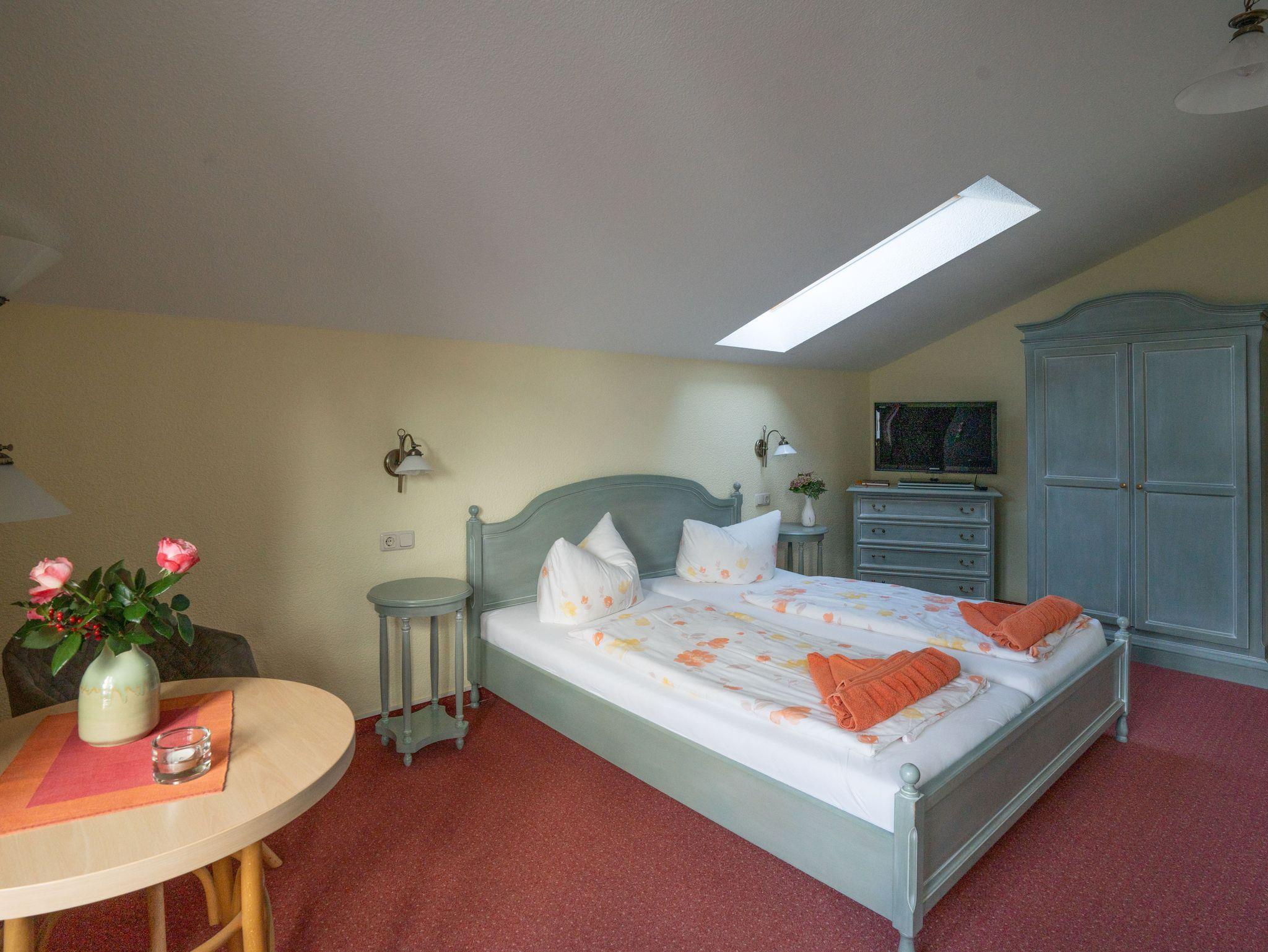 Das 28 qm große Einraumappartement im Dachgeschoss verfügt über ein Doppelbett, Sitzgelegenheit, TV und Radio sowie eine Küchenzeile mit Geschirrspüler,