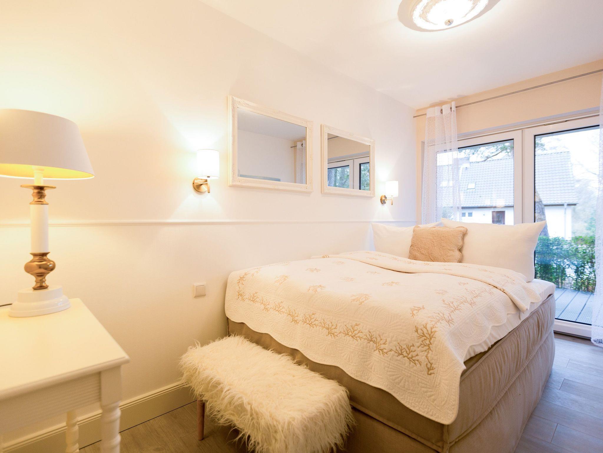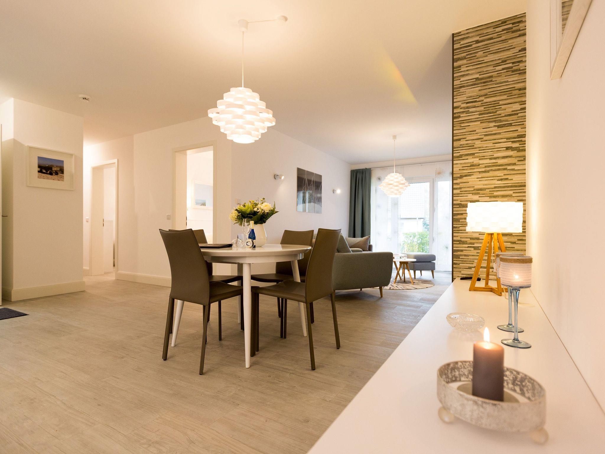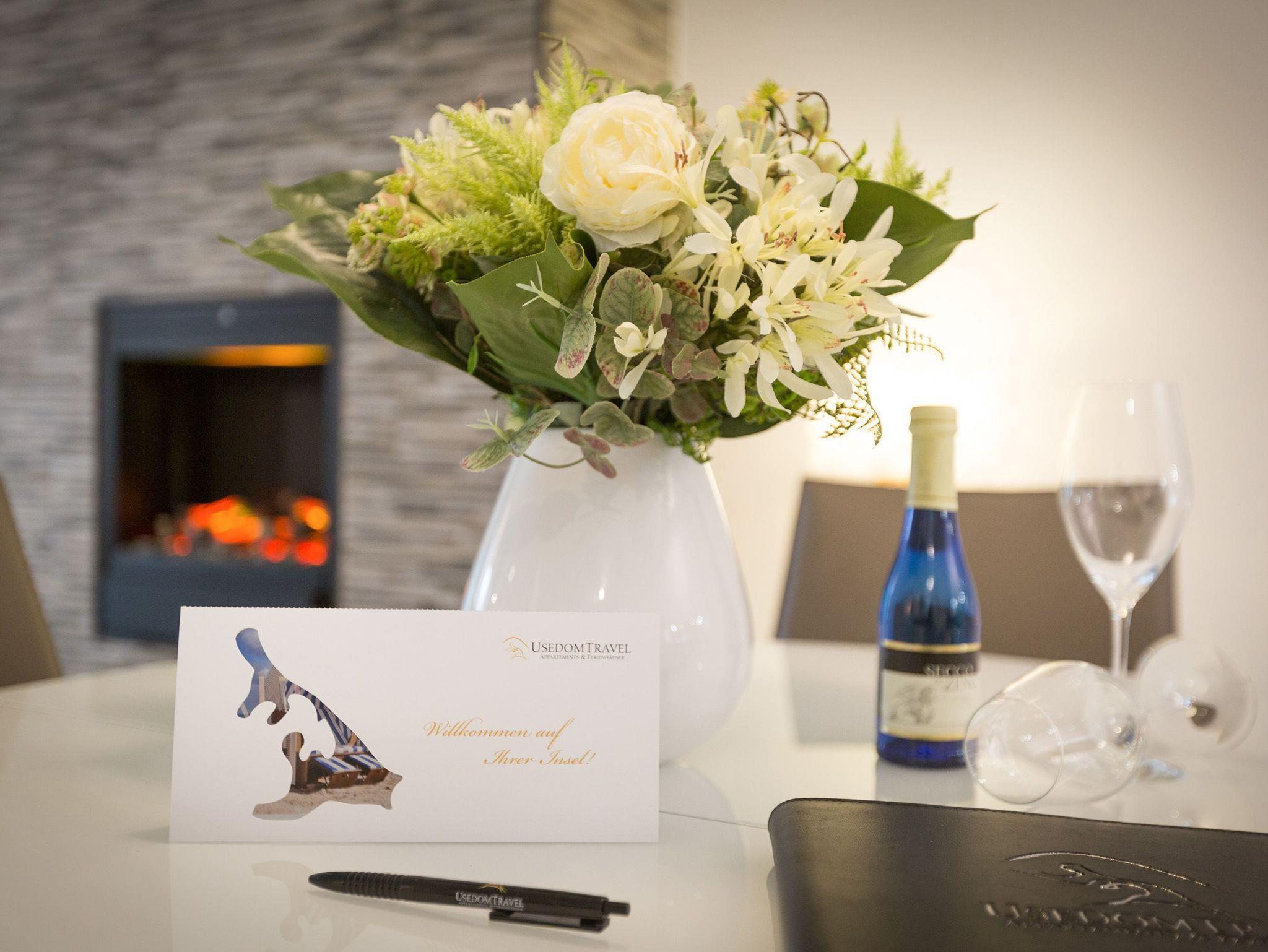 Er ist ein echter Hingucker schon beim Eintreten in dieses elegante und stilvolle Urlaubsappartement im Erdgeschoss der Dünenresidenz Heringsdorf ? der große, in Stein gefasste Elektro-Kamin. Sein warmes Licht sorgt nicht nur an kühlen Tagen für wohlige Behaglichkeit. Es wartet eine Wohlfühlwelt auf Sie, die auf 80 Quadratmetern reichlich Platz für bis zu vier Erwachsene bietet. Das gesamte Interieur ist harmonisch aufeinander abgestimmt. Stylisch sind auf alle Fälle die nordischen Design-Lampen. Abschalten und den Alltagsstress vergessen, lässt es sich auf der Sitzgruppe mit gemütlicher Couch und Blick auf den Kamin oder den großen Flat-TV wunderbar. Machen Sie die großen, bodentiefen Wohnzimmerfenster auf, lassen sie das Meeresrauschen vom nur 50 Meter entfernten Ostseestrand und die lichten Sonnenstrahlen in ihr Domizil oder entspannen Sie auf der 20 Quadratmeter großen Südterrasse. Zum Wohnbereich gehört eine helle, offene Küche mit großem Esstisch. Mit allem ausgestattet, was das Kochherz höher schlagen lässt, können Sie hier das gemütliche Zusammensitzen und Schlemmen wahrhaft zelebrieren. Haben Sie Spaß und einen erholsamen Schlaf in den beiden Schlafzimmern. Denn hier locken bequeme Doppelboxspringbetten (einmal 1,80 m x 2,00 m und einmal 1,60 m x 2,00 m), um Ihnen die Nächte zu versüßen. Das Badezimmer ist sehr geräumig und mit Waschtisch, WC und großer Echtglas-Dusche ausgestattet. Die Betten sind bezogen und Handtücher liegen bei Ankunft bereit. Zu der Wohnung gehört ein Pkw-Stellplatz in der Tiefgarage (max. Einfahrtshöhe 1,93 m).