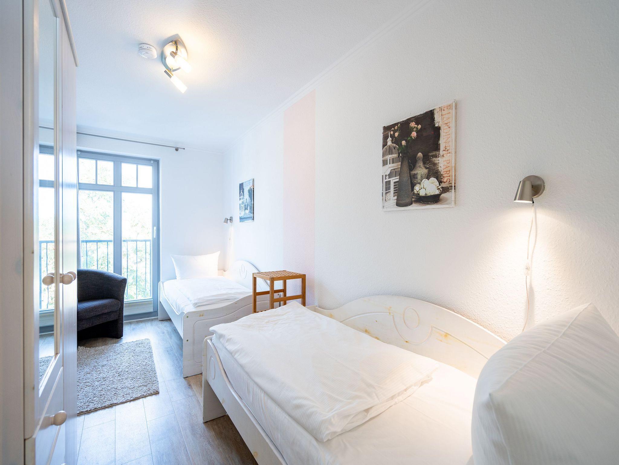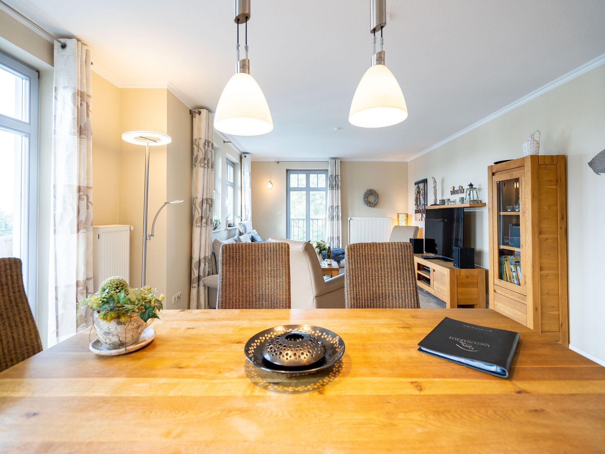 Auf 80 qm Wohnfläche - komplett neu gestaltet mit hellen Farben; stilvollen geölten Eichenmöbeln und liebevoller Dekoration - finden bis zu 4 Personen und ein Kleinkind (bis 3 Jahre) genügend Platz für einen schönen Usedomurlaub. Aus dem Wohnzimmer hat man einen schönen seitlichen Meerblick. Die neue Küchenzeile ist mit allem Komfort ausgestattet und wird durch den Esstisch ergänzt. Ein Schlafzimmer mit Doppelbett bietet genügend Platz für ein zusätzliches Kinderreisebett. Das zweite Schlafzimmer ist mit zwei Einzelbetten ausgestattet, auch von hier hat man einen schönen Meerblick. Auf Wunsch stellen wir für unsere kleinen Gäste ein Kinderreisebett (ohne zusätzliche Matratze [&] Bettzeug) und einen Kinderhochstuhl ( gegen einen Aufpreis) zur Verfügung. Das moderne Bad verfügt über eine Dusche und zwei Waschtische. Auf dem Südbalkon genießt man den Blick auf das Seebad.