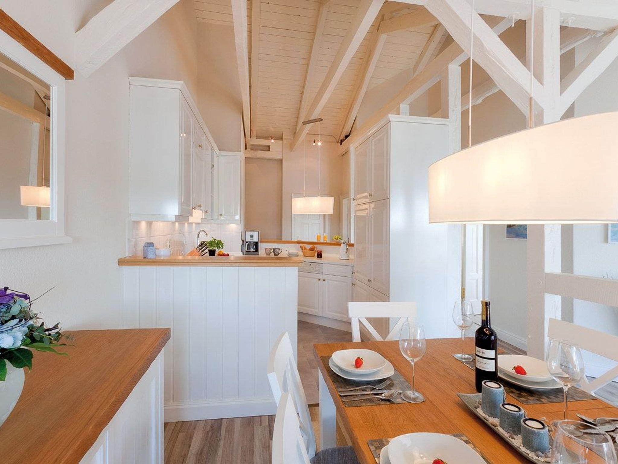 In dem großzügigen kombinierten Wohn- Koch- und Essbereich wartet eine gemütliche Sitzecke mit TV, Blurayplayer uvm. zum Entspannen auf Sie sowie eine vollausgestattete Küche mit allen Raffinessen (Geschirrspüler, Kühlschrank mit Gefrierfach, Waschmaschine, Wasserkocher, Toaster, Kaffeemaschine, Mikrowelle) sowie ein Essplatz für 6 Personen. Highlight des Appartements ist die große Fensterfront des Wohnzimmers, die einen tollen Blick auf das Heringsdorfer Meer und über die Dächer von Heringsdorf bis nach Bansin gewährt. Genießen Sie von dort mit einem spannenden Buch die einzigartige Wirkung des Meeres.