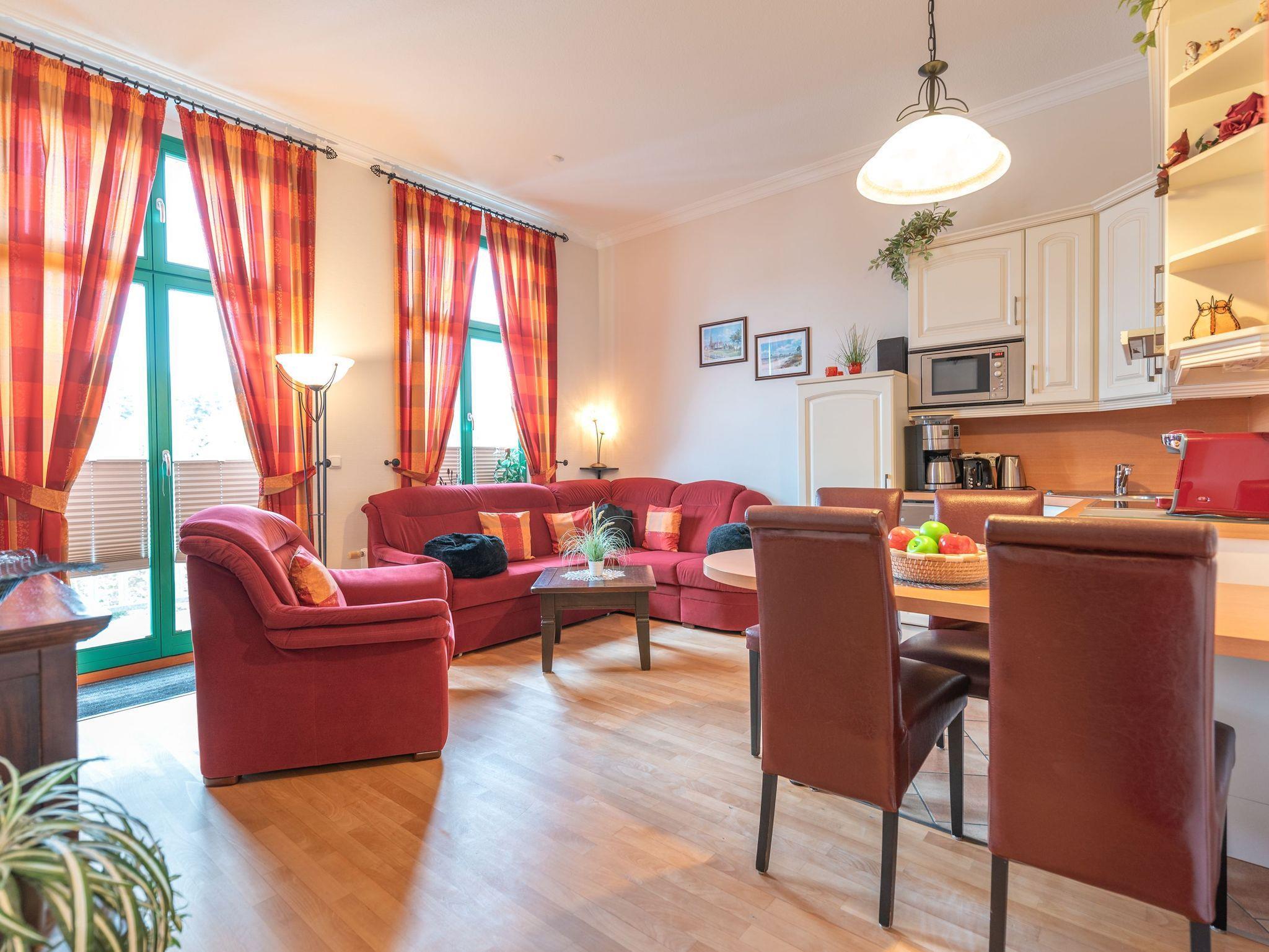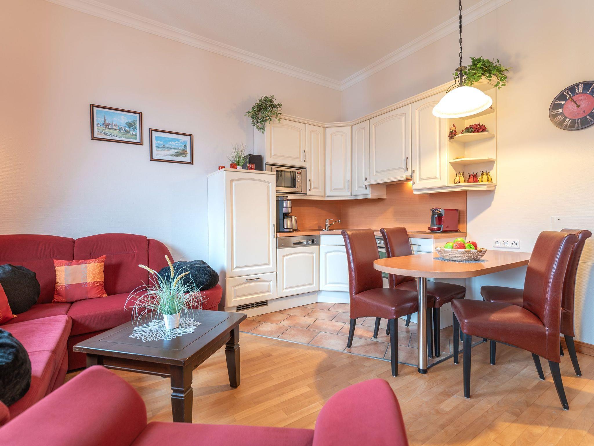 Der Wohnbereich ist gemütlich eingerichtet mit einer Sitzgruppe und einem Flachbild-TV. Das Sofa lässt sich bei Bedarf in ein weiteres Bett verwandeln. Die offene Küchenzeile ist funktional ausgestattet ? von Kochutensilien über Geschirr bis hin zur modernen Tassimo-Kaffeemaschine. Hier bereiten Sie unkompliziert Frühstück oder Abendessen zu, bevor Sie den Tag auf dem Balkon bei einem Glas Wein ausklingen lassen.