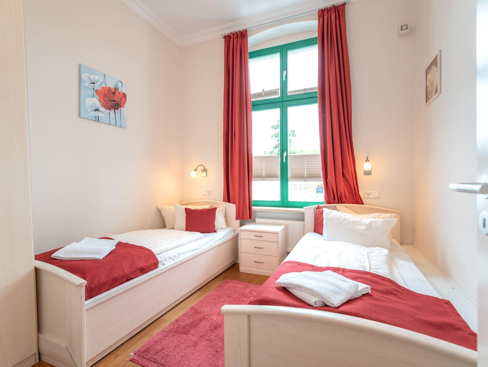 Das Hauptschlafzimmer bietet ein komfortables Doppelbett, einen geräumigen Kleiderschrank und einen TV. Im zweiten Schlafzimmer finden Sie zwei Einzelbetten, ideal für Kinder oder Erwachsene. Die Wohnung ist perfekt für Familien oder kleine Gruppen.