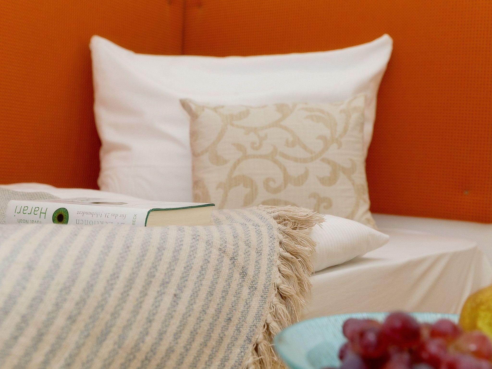 Über eine Treppe gelangen Sie in die obere Etage der Wohnung. Von der Galerie haben Sie Zugang zu den beiden Schlafzimmern, dem Badezimmer und dem Balkon. Das erste Schlafzimmer ist freundlich eingerichetet und mit einem bequemen Doppelbett (180 x 200cm / zwei getrennte Matratzen) und verdunkelnden Gardinen ausgestattet. Für zwei weitere Urlaubsgäste stehen im zweiten Schlafzimmer zwei Einzelbetten (je 90x200cm) für eine erholsame Nachtruhe und einen guten Start in den neuen Urlaubstag bereit.