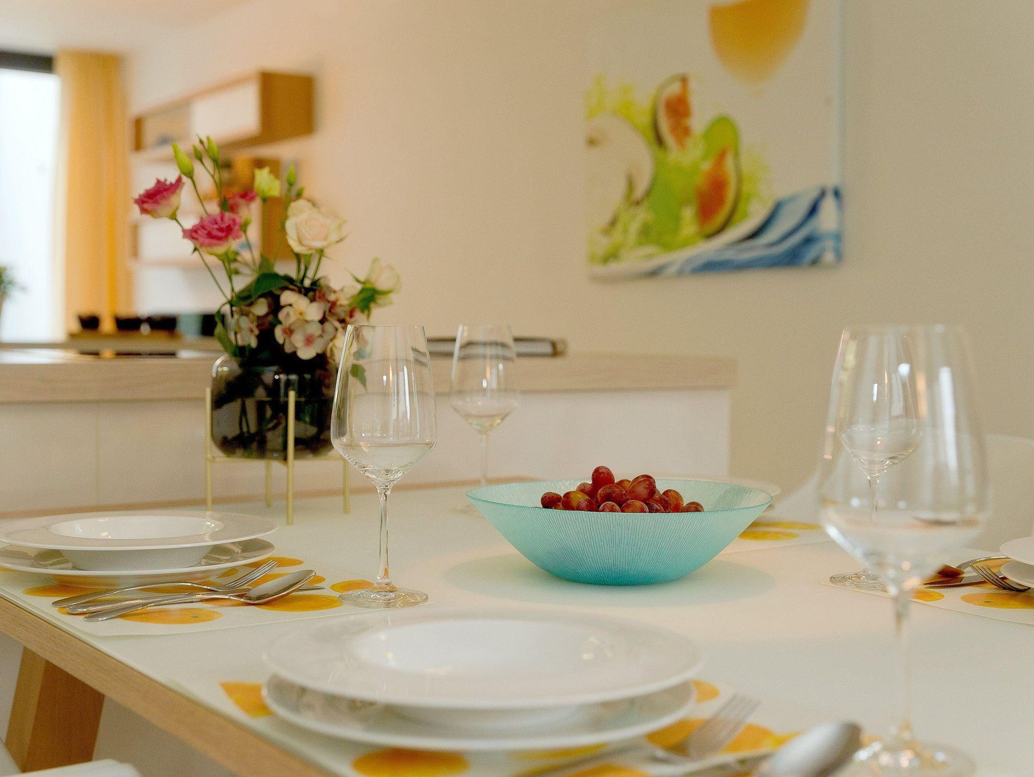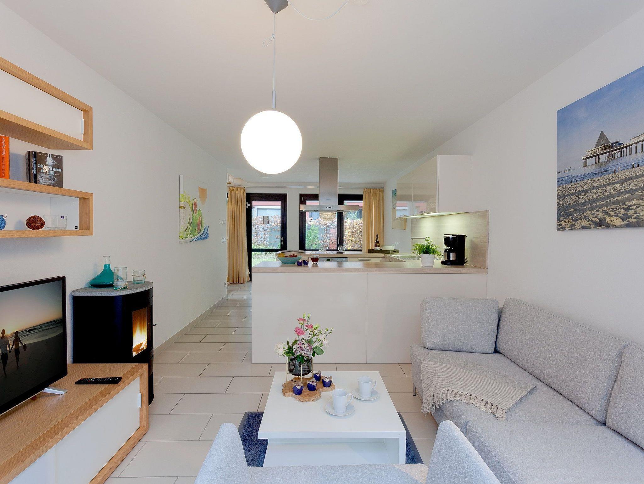Der stilvolle Wohnbereich verfügt über ein komfortables Sofa und einen Sessel. Die hochwertige Ausstattung mit Bio-Ethanol-Kamin und Flat TV sorgt nicht nur in der ungemütlichen Jahreszeit für behagliche Stunden nach einem erholsamen Strandspaziergang. Im Erdgeschoss befindet sich zudem die moderne Einbauküche, die für die Zubereitung Ihrer Lieblingsspeisen rundum ausgestattet ist (inkl. Ceranfeld, Backofen, Kühlschrank mit Gefrierfach, Geschirrspüler, Wasserkocher, Toaster und Kaffeemaschine). An dem großzügigem Essplatz kann die ganze Familie in geselliger Runde die zubereiteten Speisen genießen. Vom Wohnzimmer erreichen Sie Ihre private Südterrasse, die zum Sonnenbaden oder zur abendlichen Spielrunde mit Blick ins Grüne einlädt.
