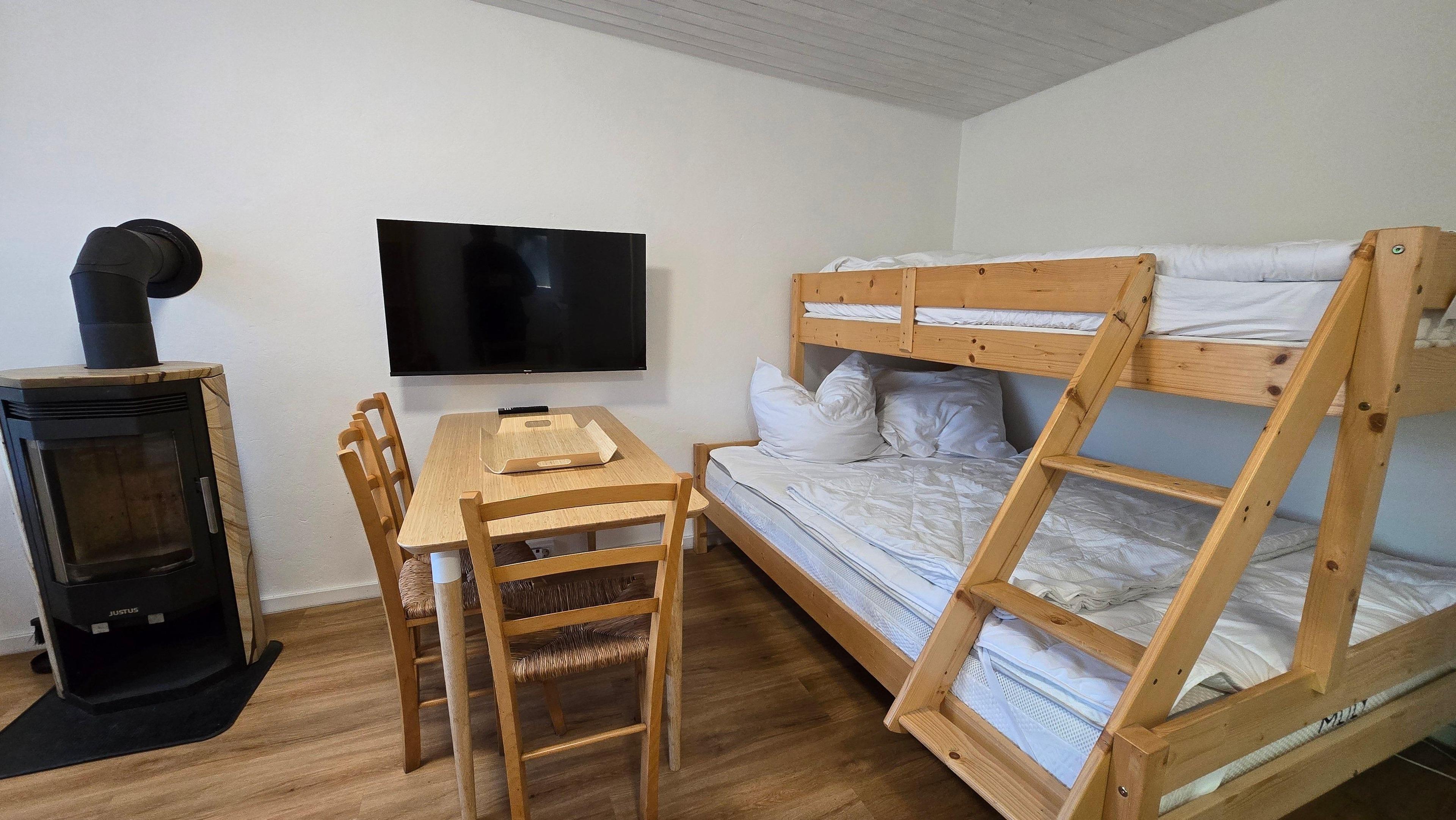 Ein einfach ausgestatteter Bungalow, der in 2025 modernisiert wurde, bietet zwar mit 24 qm nicht viel Platz, aber doch alles, was Sie zum Erholen brauchen. Starten Sie Ihren Tag doch mit einem frisch gekochten Kaffee auf der Terrasse und genießen Sie die Sonnenstrahlen. Vielleicht können Sie das Meer schon riechen. Zurück im kleinen Häuschen können sie sich im unteren Bereich vom Etagenbett auf einer 140 cm breiten Matratze entspannen und für einen dritten Gast gibt es im oberen Teil vom Etagenbett auf 90 cm Breite genügend Platz. Für romantische und kältere Stunden lädt ein Kaminofen ein. Eine weitere Heizung ist nicht vorhanden. Das Bad hat ein WC und eine Dusche mit einem Durchlauferhitzer. Auf wenigen Quadratmetern finden Sie bei uns all das, was Sie brauchen: Smart-TV mit Streamingfunktion, DVD-Player, kostenfreies WLAN, eine kleine Singel-Küche mit Kühlschrank und zwei Herdplatten, Mikrowelle mit Grill und Heißluft, Kaffeemaschine, Toaster, Wasserkocher und Küchenausstattung.