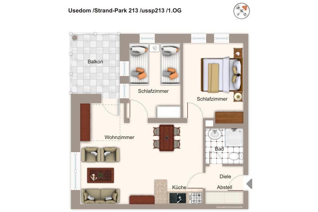 Die 56 qm große Ferienwohnung mit Balkon verfügt über 3 Zimmer und eignet sich für bis zu 6 Personen. Genießt die hervorragende Lage des 'Strand-Park' direkt an der Strandpromenade und am Ostseestrand.