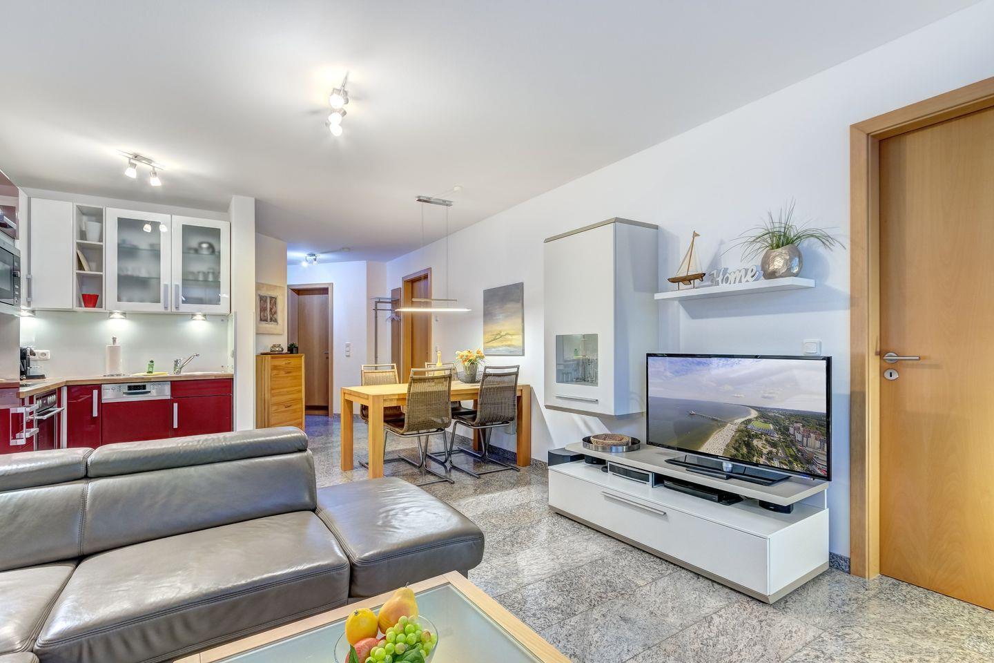 Genießen Sie diese mit 5-DTV-Sternen zertifizierte, moderne und individuell eingerichtete 3-Zimmer Ferienwohnung mit der über 20 qm großen Sonnendachterrasse nach Südwesten und dem Westbalkon mit Blick zur Strandpromenade. Hier können Sie herrlich entspannt frühstücken, essen oder sonnenbaden. Die im 1. Obergeschoß gelegene, komfortable Wohnung verfügt über beheizte Granitfußböden und edle Parkettfußböden in den 2 Schlafzimmern, sowie ein geräumiges Wohn -und Esszimmer und eine hochwertige, voll ausgestattete Küche.