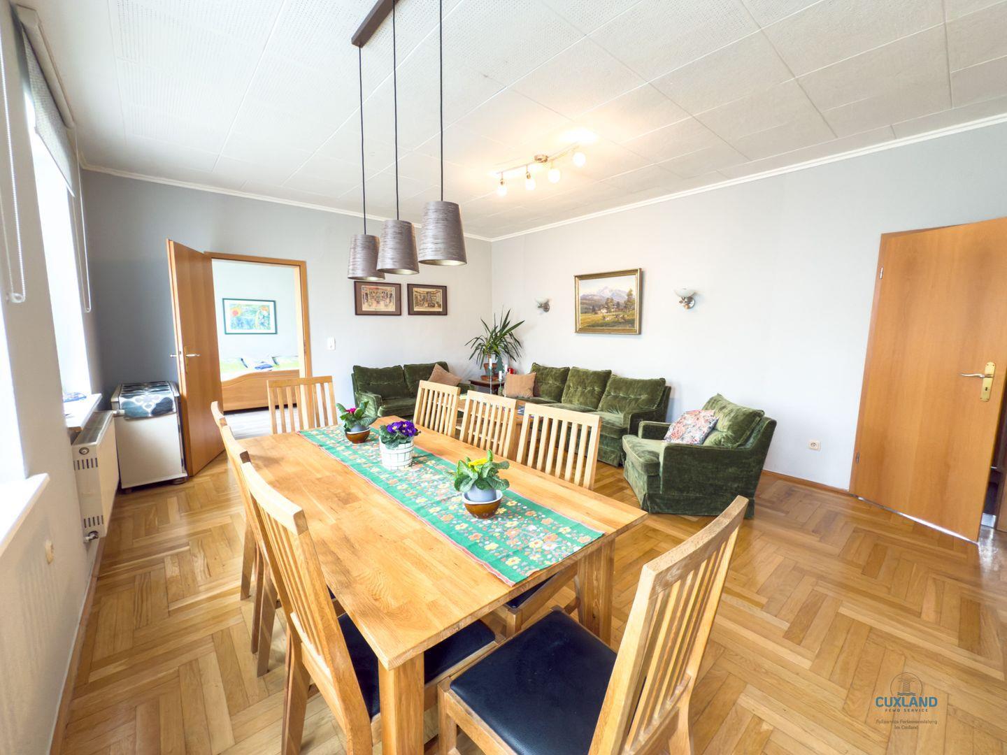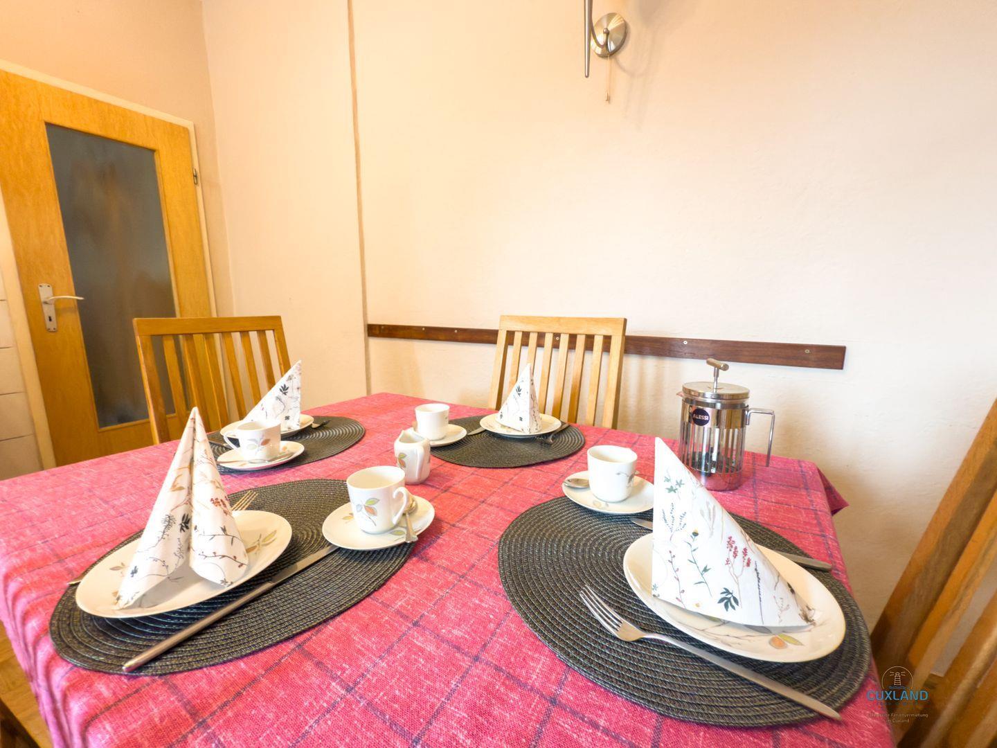 Die stilvolle Einrichtung verbindet modernen Komfort mit historischem Flair und sorgt dafür, dass sich Gäste sofort wohlfühlen. Der großzügige Wohnbereich ist mit Parkett ausgestattet und bietet eine bequeme Sofaecke, perfekt für gemütliche Abende vor dem Fernseher. Darüber hinaus sorgt der grosse Esstisch dafür, dass die ganze Familie zusammen die Mahlzeiten genießen kann. Für die kulinarischen Bedürfnisse steht Ihnen eine komplett ausgestattete, geschlossene Küche mit einem weiteren Essplatz zur Verfügung. Diese ist mit einem modernen Cerankochfeld, einem Elektrobackofen, einem Kühlschrank mit Gefrierfach, einer Spülmaschine sowie allen notwendigen Küchenutensilien ausgestattet.