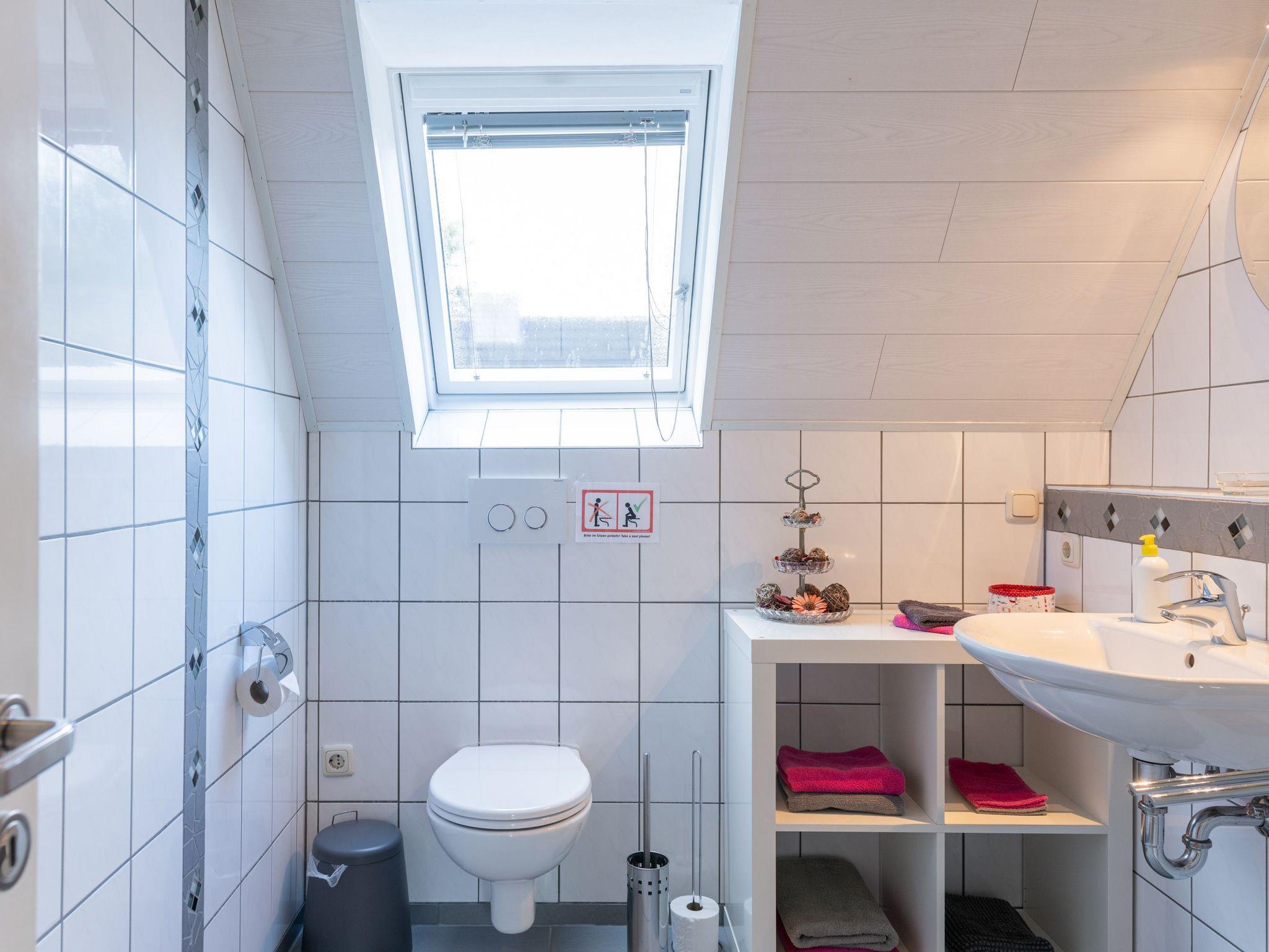 Das Wohn- u. Esszimmer ist ausgestattet mit SAT-TV. Die Esszimmerecke ist mit einem ausziehbarem Tisch, Eckbank und 2 Stühlen eingerichtet. Ein Hochstuhl ist hinter der Eckbank vorhanden und kann mühelos aufgebaut werden. Der Wohnbereich ist mit einem großen Tisch, Couch und 2 Sessel ausgestattet. Hier können die zu Verfügung stehenden Sportgeräte genutzt werden. Ebenfalls befindet sich hier ein gut gefülltes Bücherregal mit unterschiedlichen Themen und in der Kommode sind einige Gesellschaftsspiele untergebracht. Badezimmer mit Dusche/Eckeinstieg (100x100 cm) und WC.
