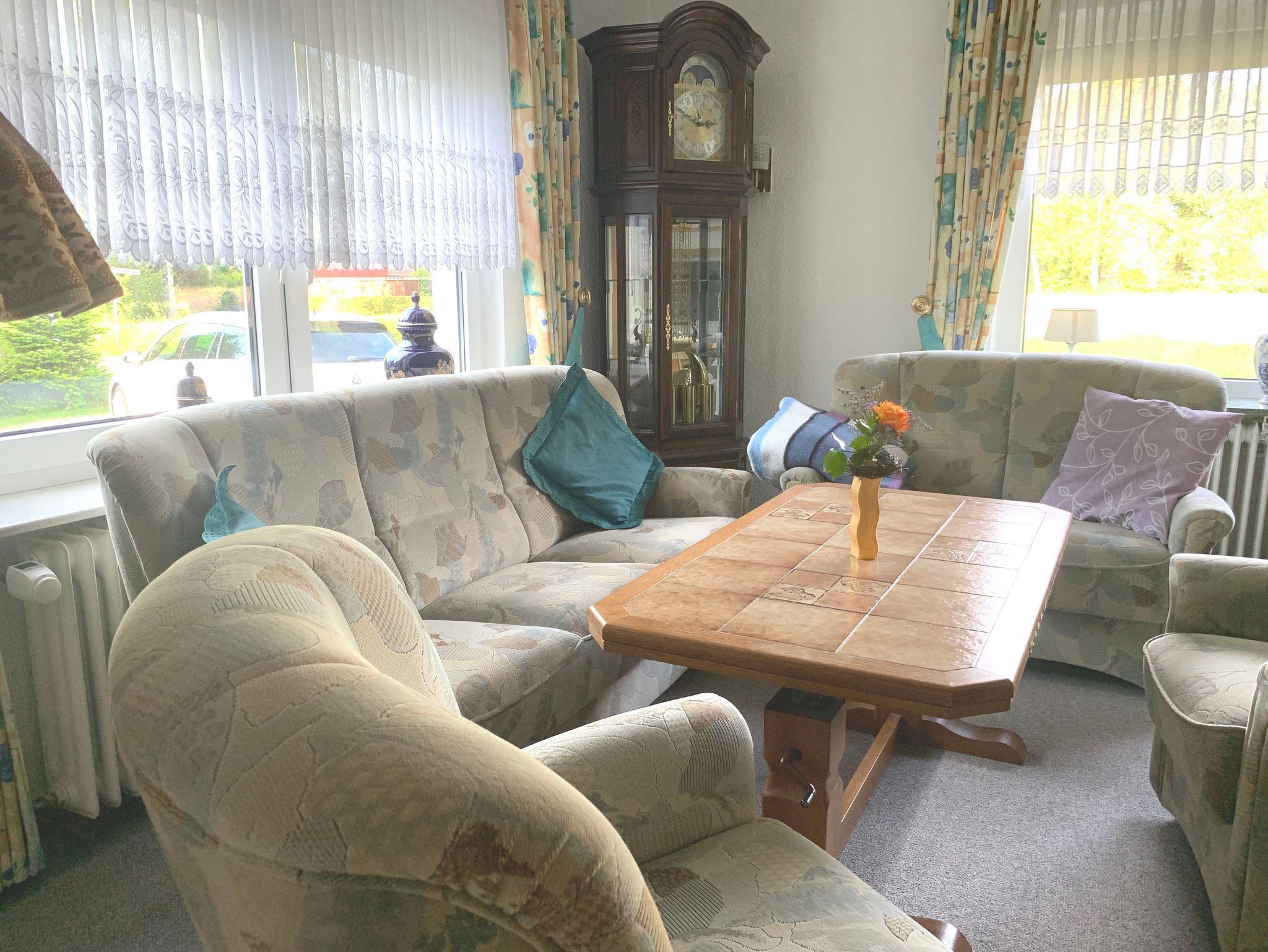 Die Erdgeschosswohnung besteht aus zwei Doppelzimmern, einer geräumigen Wohnküche und einem Wohnzimmer. In jedem Schlafzimmer befinden sich Kleiderschränke. In einem Zimmer ist ein Doppelbett und in dem anderen Zimmer sind zwei Einzelbetten vorhanden. Diese können auch getrennt gestellt werden. Ebenfalls kann auf Wunsch ein Gästebett oder ein Kinderbett aufgebaut werden. Eine Kopfkissenauswahl steht zur Verfügung. Die Wohnküche ist ausgestattet mit Backofen, Ceranfeld, Kühlschrank, Mikrowelle und Spülmaschine. Auch nahezu alle Küchengeräte sind vorhanden. (Kaffeemaschine, Toaster, Wasserkocher, Senseo, Eierkocher). Auf dem Sofa und den 4 Stühlen ist Platz für die ganze Familie. Am Flachbild-TV mit SAT.-Empfang jeweils in der Küche und im Wohnzimmer kann auch mal ein getrenntes Programm geschaut werden. Im Wohnzimmer lädt eine gemütliche Polstergarnitur zum Entspannen ein.