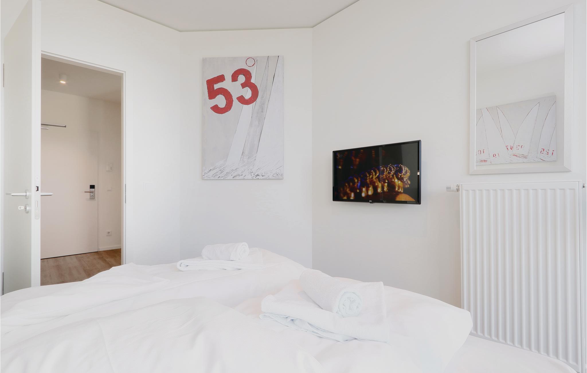 Im Wohnbereich befindet sich außerdem das Schlafsofa, welches zwei weitere Schlafplätze bietet. Alle Zimmer sind im skandinavischen Stil eingerichtet und durch die bodentiefen Fenster hell und lichtdurchflutet. Ein Kinderbett lässt sich ausschließlich im Wohnzimmer aufstellen, da im Schlafzimmer nicht ausreichend Platz zur Verfügung steht.